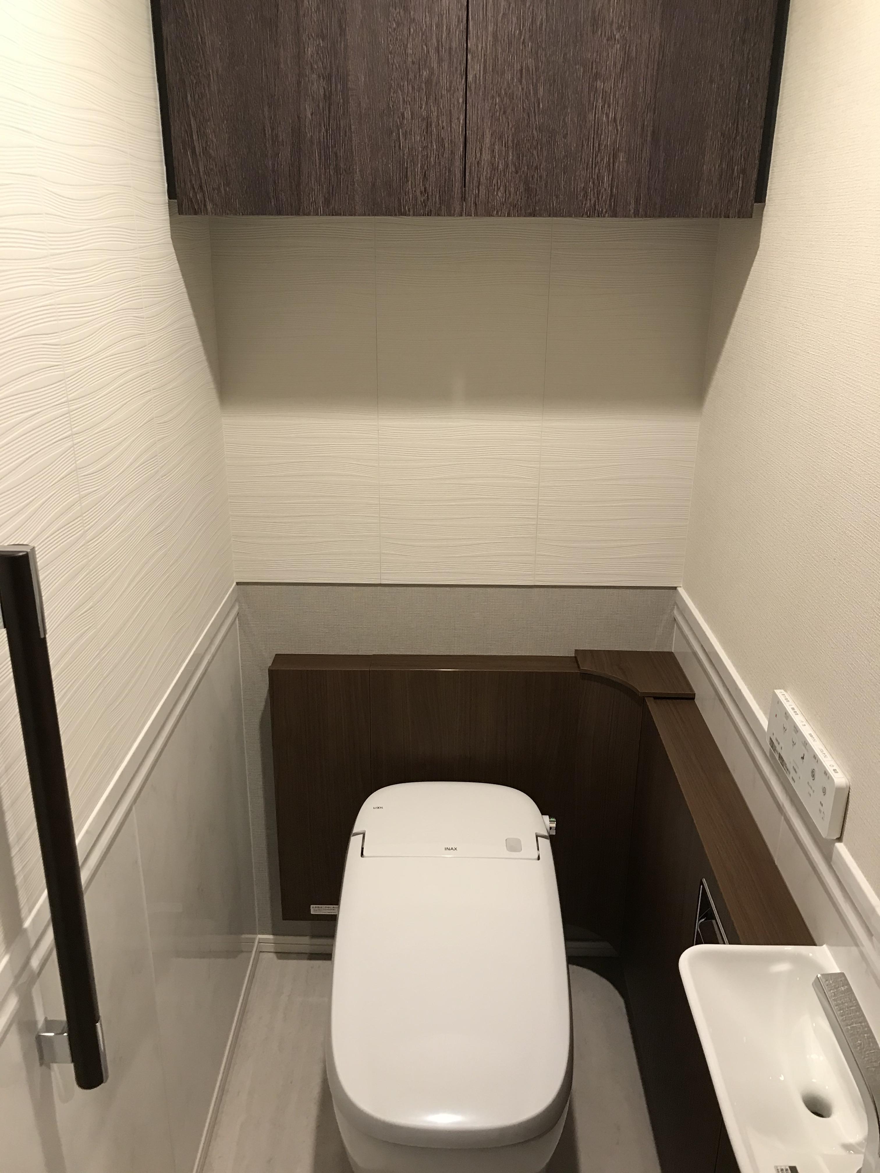 新築なのでもちろん新品の設備ですが、お客様ご希望のタンクレストイレへの交換、手洗器の設置、エコカラットの施工を行しました。また、玄関、廊下、リビングダイニングルーム、それぞれの空間にも、雰囲気に合わせたり、アクセントカラーになるようなエコカラットを施工しました。