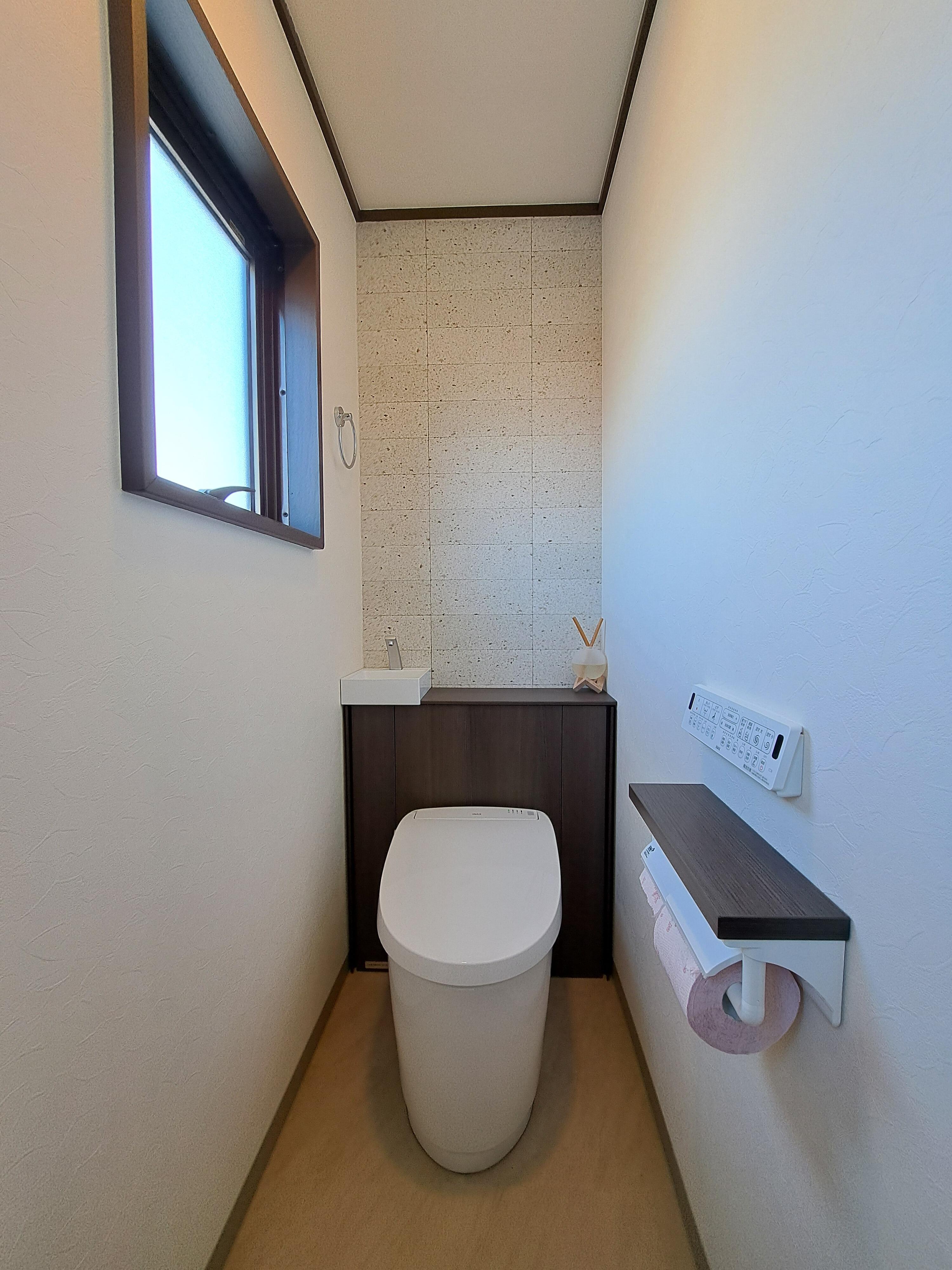 今回は、床や壁の一部がタイルで施工されていて、クロスではない壁だった1階と2階のトイレをスッキリしたい!というお施主様ご夫婦のご相談をお聞きして、リフォームさせていただきました。床はCFシート、壁はクロスで仕上げました。壁のクロスもアクセントに石目調のデザインを取り入れて、落ち着きのある空間にしました。トイレは、LIXIL“Jフォット”で収納スペースも確保。ベージュとブラウンを基調にすることで、スッキリ感と清潔感もアップ。以前のトイレからはイメージがガラッと変わり、掃除もしやすくなりました…と、ご家族皆さまにお気に入りいただく施工ができました。