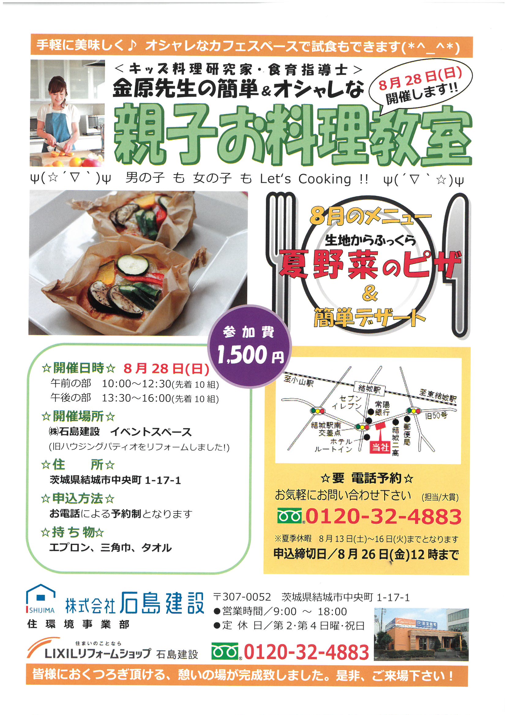 8月28日(日)、結城市の本社ビル隣、旧パティオにて、親子お料理教室を開催します。