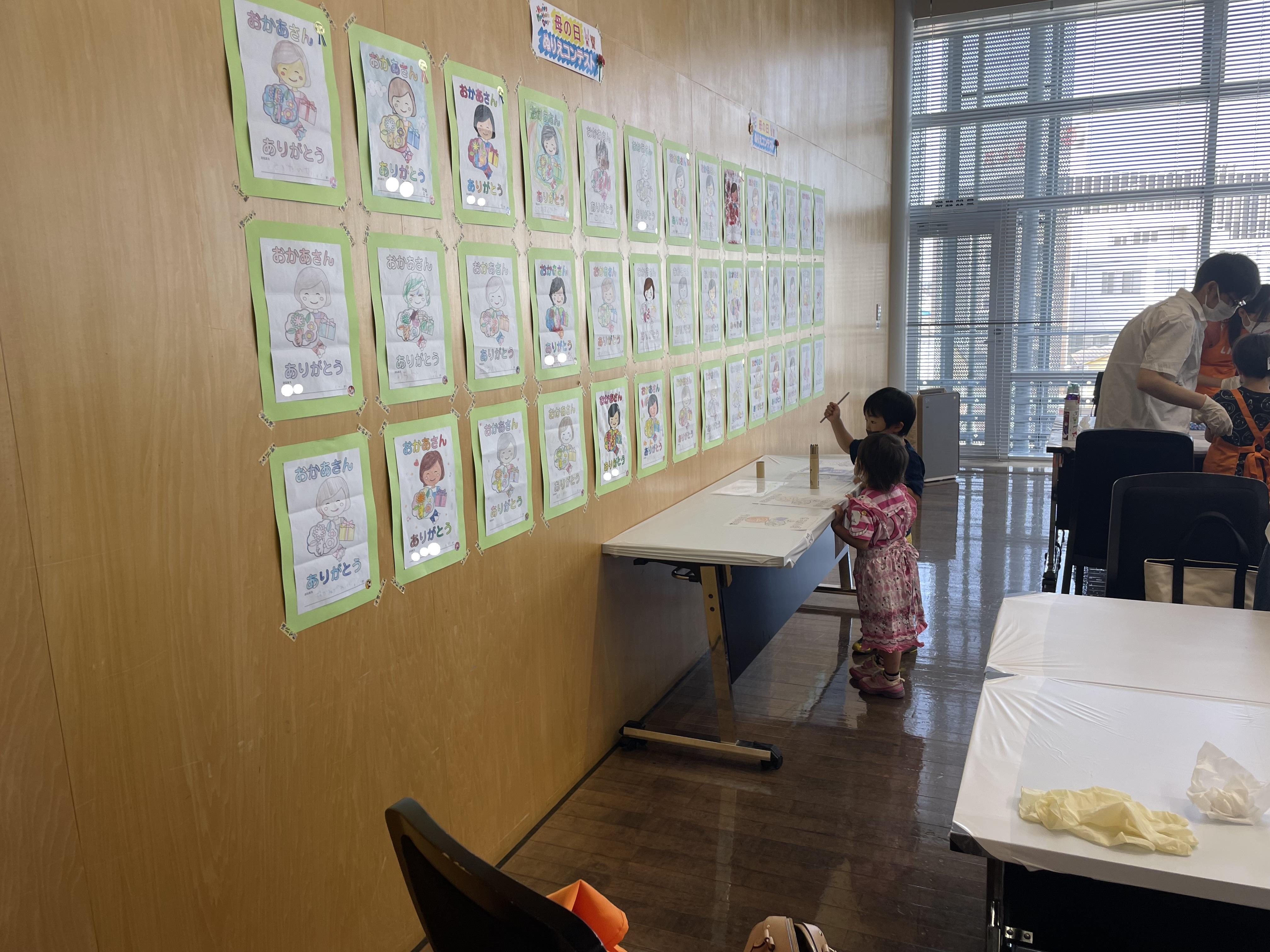 母の日ぬりえコンテストの作品を会場内に掲示して、お帰りの時には"サプライズプレゼント"として、カーネーションをお渡ししました。