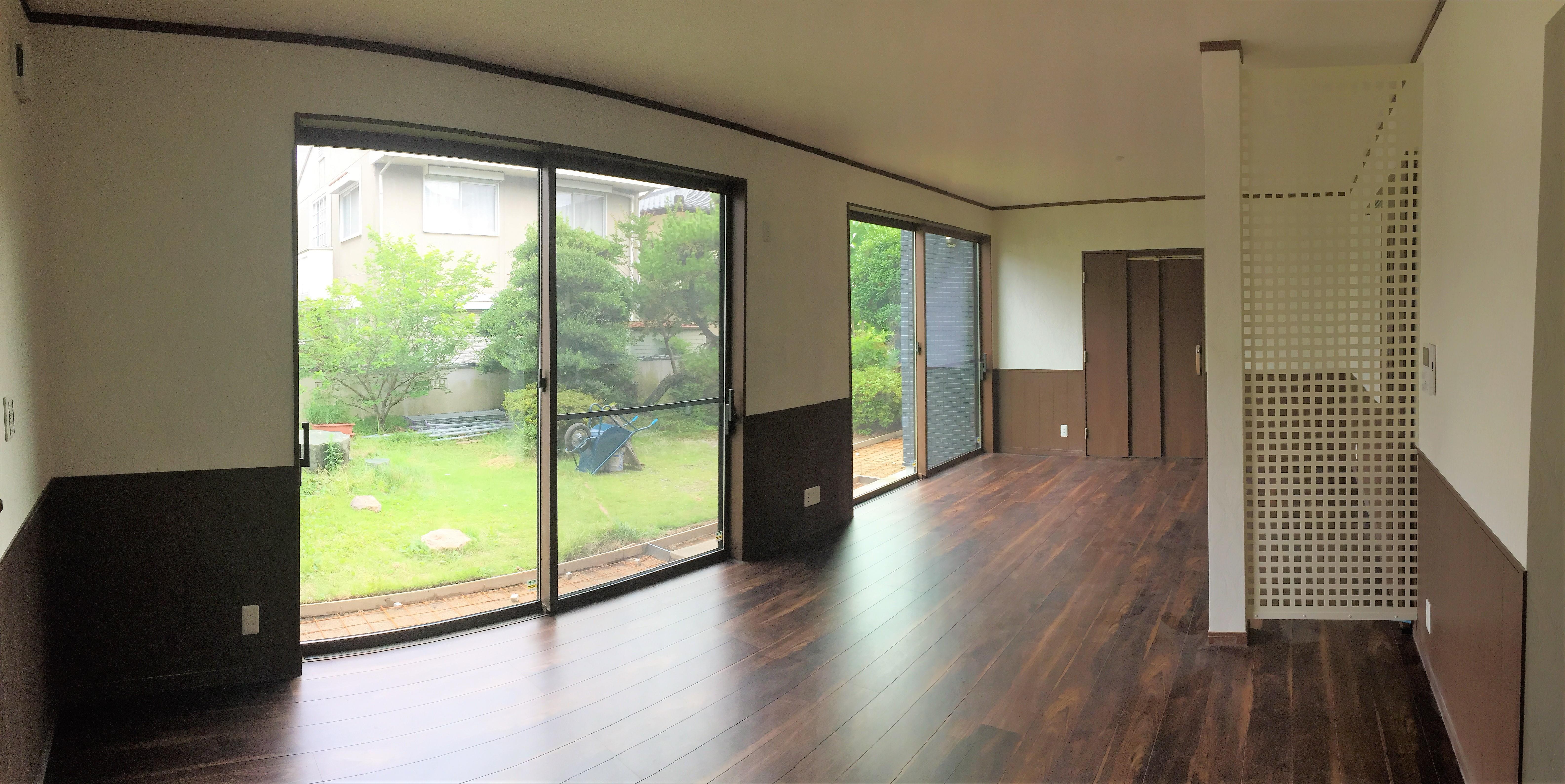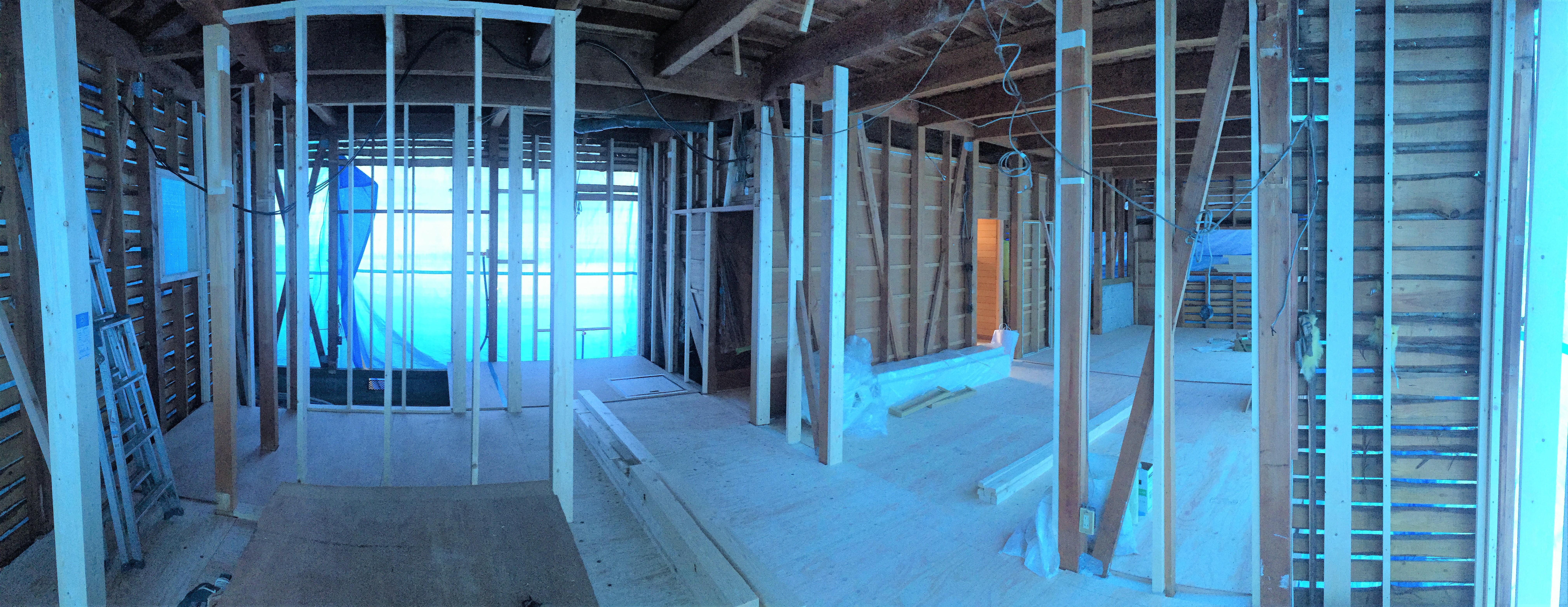耐震性能を向上させるためには既設建物の壁バランスを考慮して筋交いを設ける事が必要となります。昭和59年頃の建物の多くは南側の採光を確保するために大きなサッシが南側に設計され、耐力壁の多くは北側に設計されています。また、親戚やご近所の方が集まる事も多く来客用の和室を続き間として設計する事が多くありました。その為か南側の耐力壁が非常に少なく、不安定な状態で揺れてしまいます。現在新築で建てられている建物は東西南北全ての方向に耐力壁をバランス良く設計してあり耐震性に優れています。今回のリフォームでは、自社耐震診断によりバランスが悪い箇所に耐力壁を設けることで耐震性にも配慮したリフォームを行いました。また、剛床にする事で耐震性と水平レベルの調整を行いました。