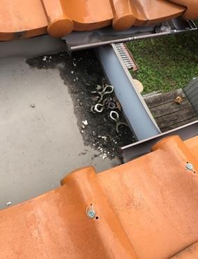 今回のご相談は、大雨の際に雨漏れがするとの事で家屋の点検を無料で実施したところ、既設の樋には長年蓄積された埃や枯葉などで排水口が詰まっていました。実際に散水試験をしたところ排水機能が悪く、すぐ水が溜まってしまうので樋の洗浄工事を提案しました。工事後、同様の散水試験を行った際は水の流れもよく水が溜まらなくなりました。部分的に劣化してしまった建物側の防水処理もしっかり修繕したので雨漏れは止まったようです。樋の排水状況が心配な方は一度お問い合わせ下さい。無料で点検致します。