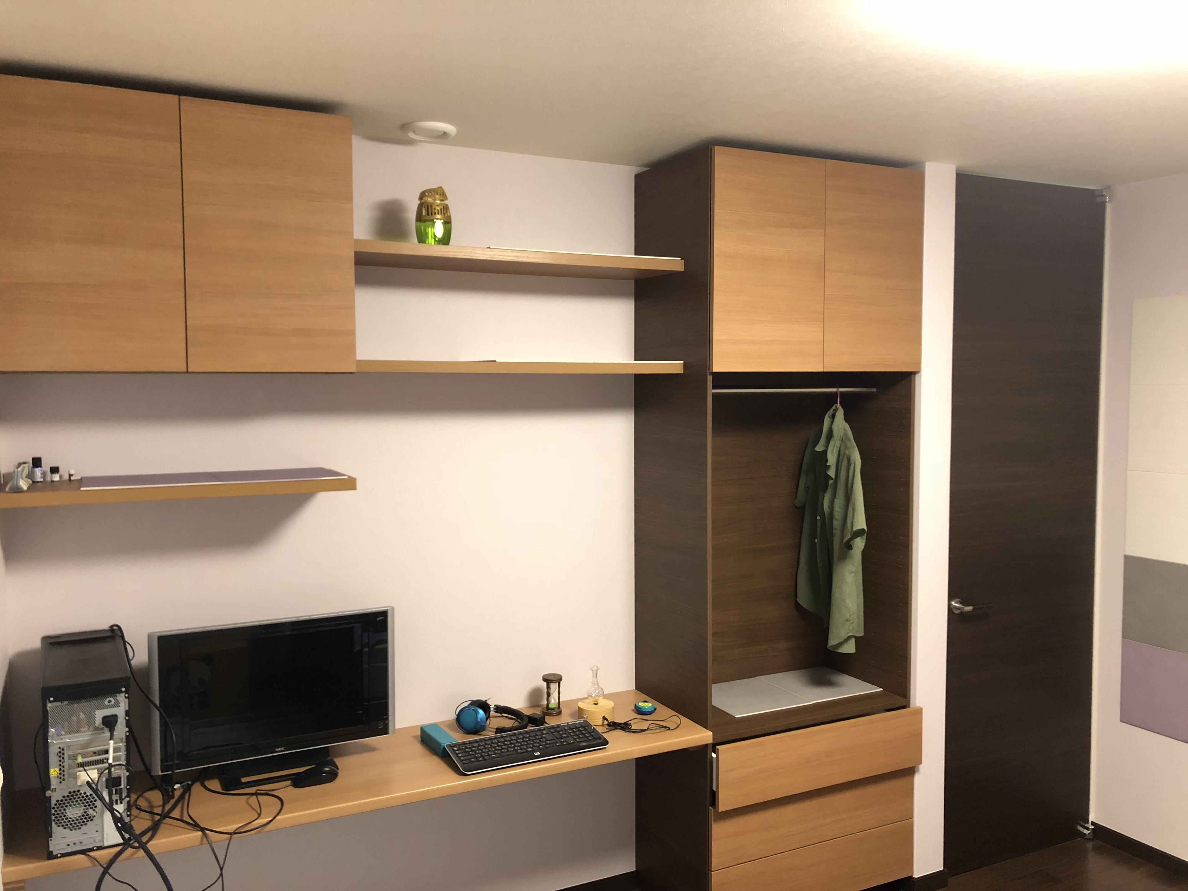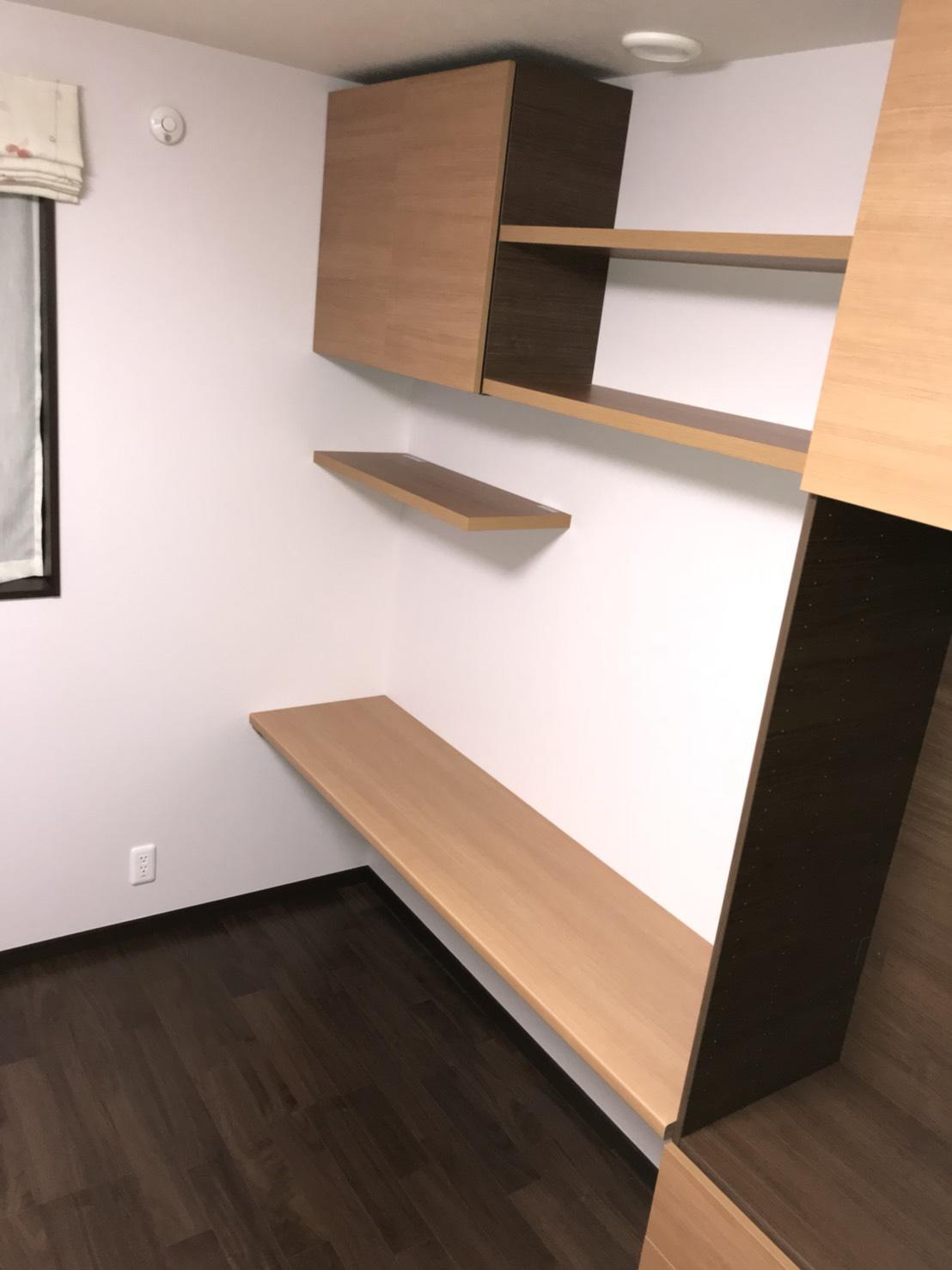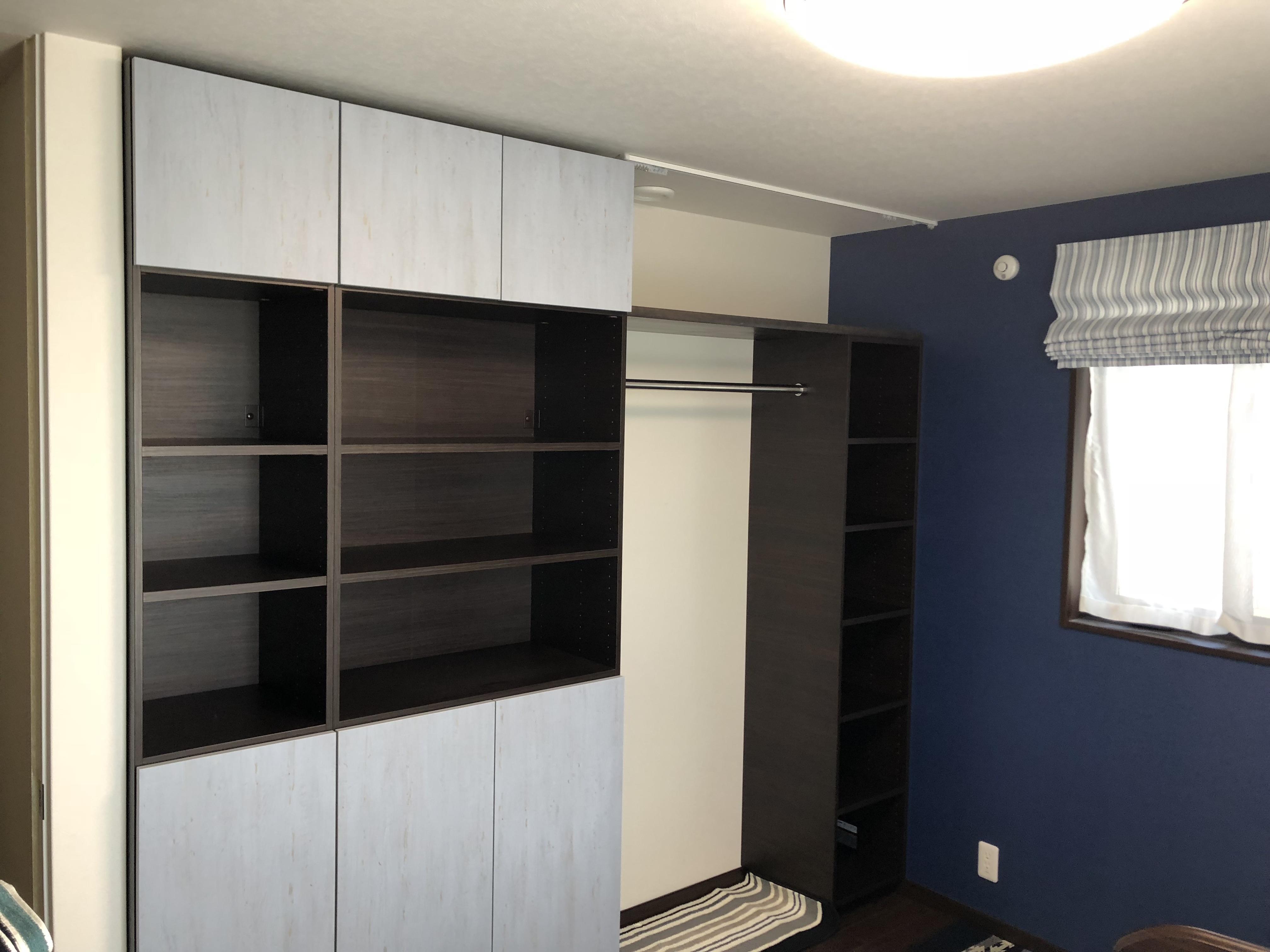 築2年のお客様より洋室2部屋それぞれに収納をつくりたいとのご依頼を頂きました。新築時より収納スペースは完成後に工事を計画していたようで、、用途に合わせてデザインされたいとのご相談でした。パソコンが置ける書斎風な落ち着いたお部屋と収納に特化するモダンなイメージのお部屋。時間をかけて色や形を相談しながら、ご希望に沿う様、一からお客様と一緒に設計していきました。住んでみてからこそのこだわりもあり、想いが沢山つまったオリジナル収納となりました。世界で一つだけのオーダーメイドに、大変ご満足いただけました。