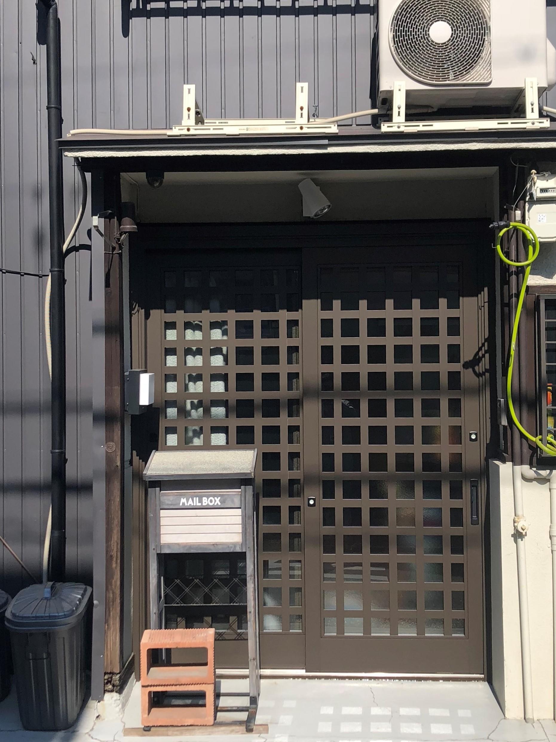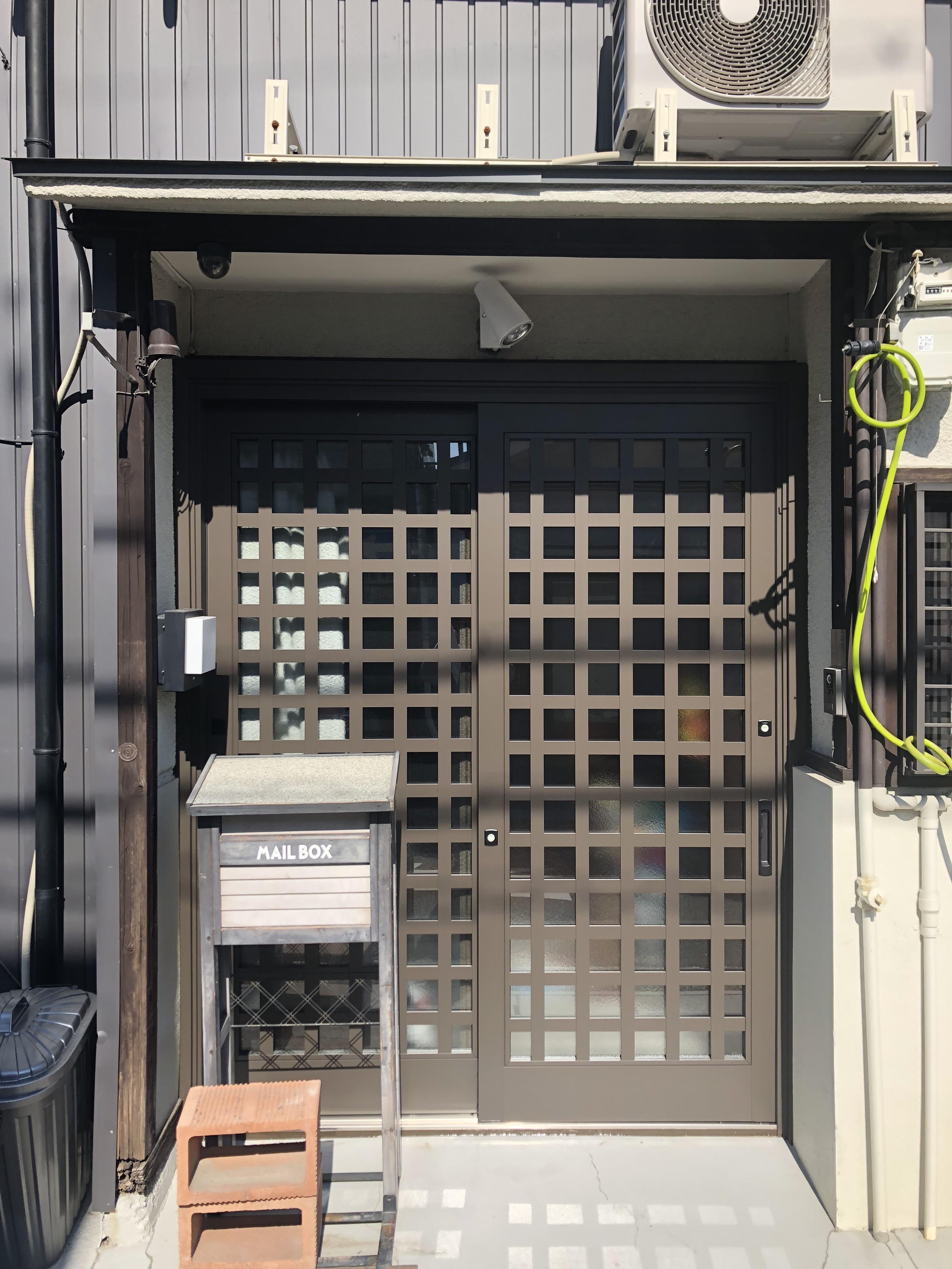 長年使用した玄関引き戸の交換のご依頼を頂きました。当初は、ドアを閉めたままでも風をとりこめる機能のついた開き戸をご希望でしたが、現場調査後、開き戸を設置すると全面道路に干渉する可能性がある為、引き戸の内側に網戸を設置するご提案をさせて頂きました。玄関ドアを交換する際に照明があたる為、照明の交換もご提案させて頂きました。ドアの内側に網戸を付けた為、換気の際、虫の侵入等の心配もなく安心です。玄関錠は防犯性の高いディンプルキータイプに変わったため防犯対策も万全です。