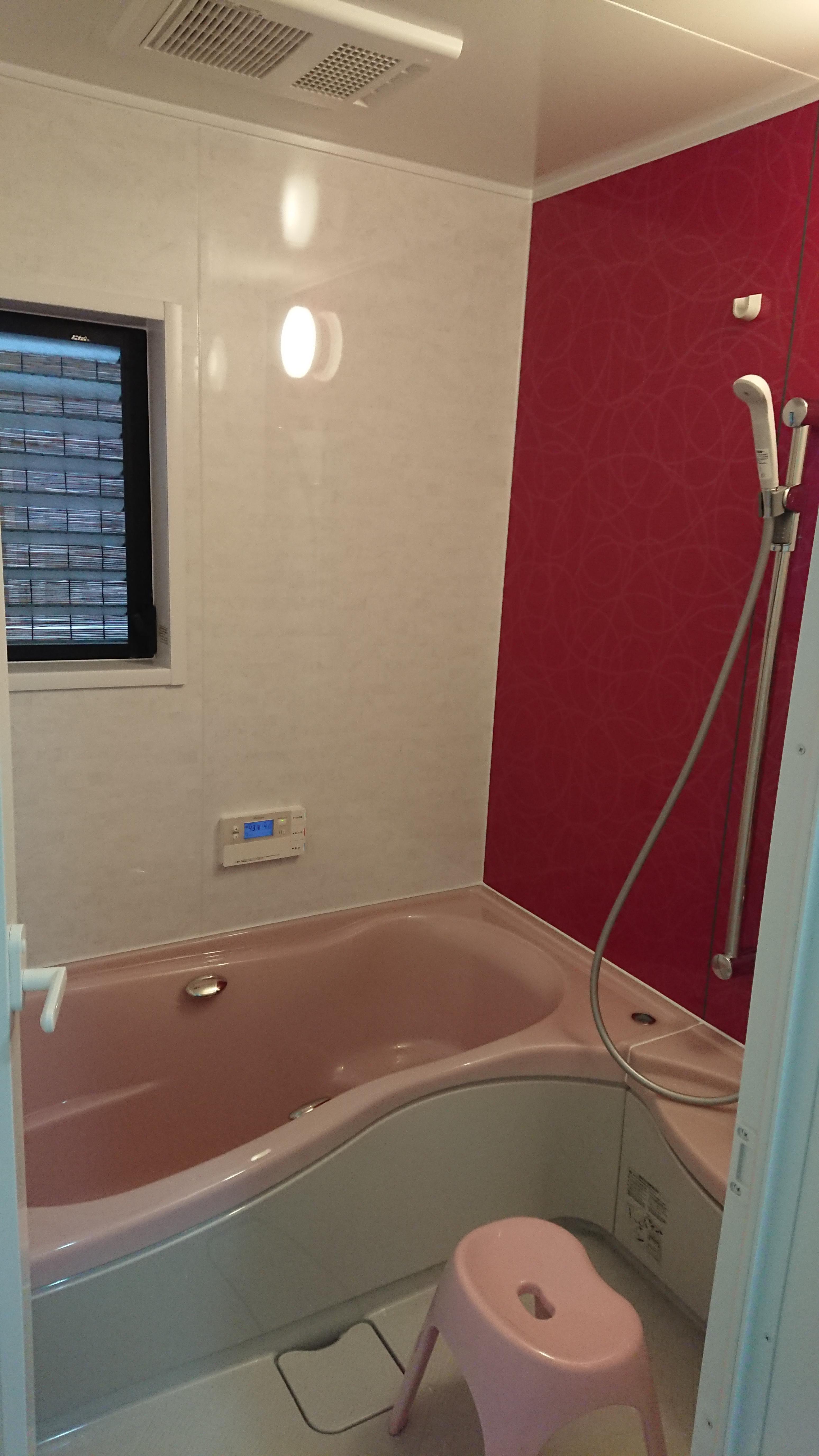 約20年お使いになられたユニットバス。冬場の入浴の際でも寒いとの事とゆっくりくつろぐ空間にしたいとの事で浴室を交換するご相談を頂きました。少しでも暖かく過ごして頂くためにも換気暖房乾燥機を設置しました。浴室内を暖かくしたり、衣類などを乾燥させる事ができます。スマホからお気に入りの音楽がお風呂場で楽しめます。新たなシステムバスは高断熱性能はもちろんの事、浴槽はお好みのピンクの浴槽に、サークルレッドの壁パネルをアクセントに取り入れてお好みに合わせた浴室になりました。