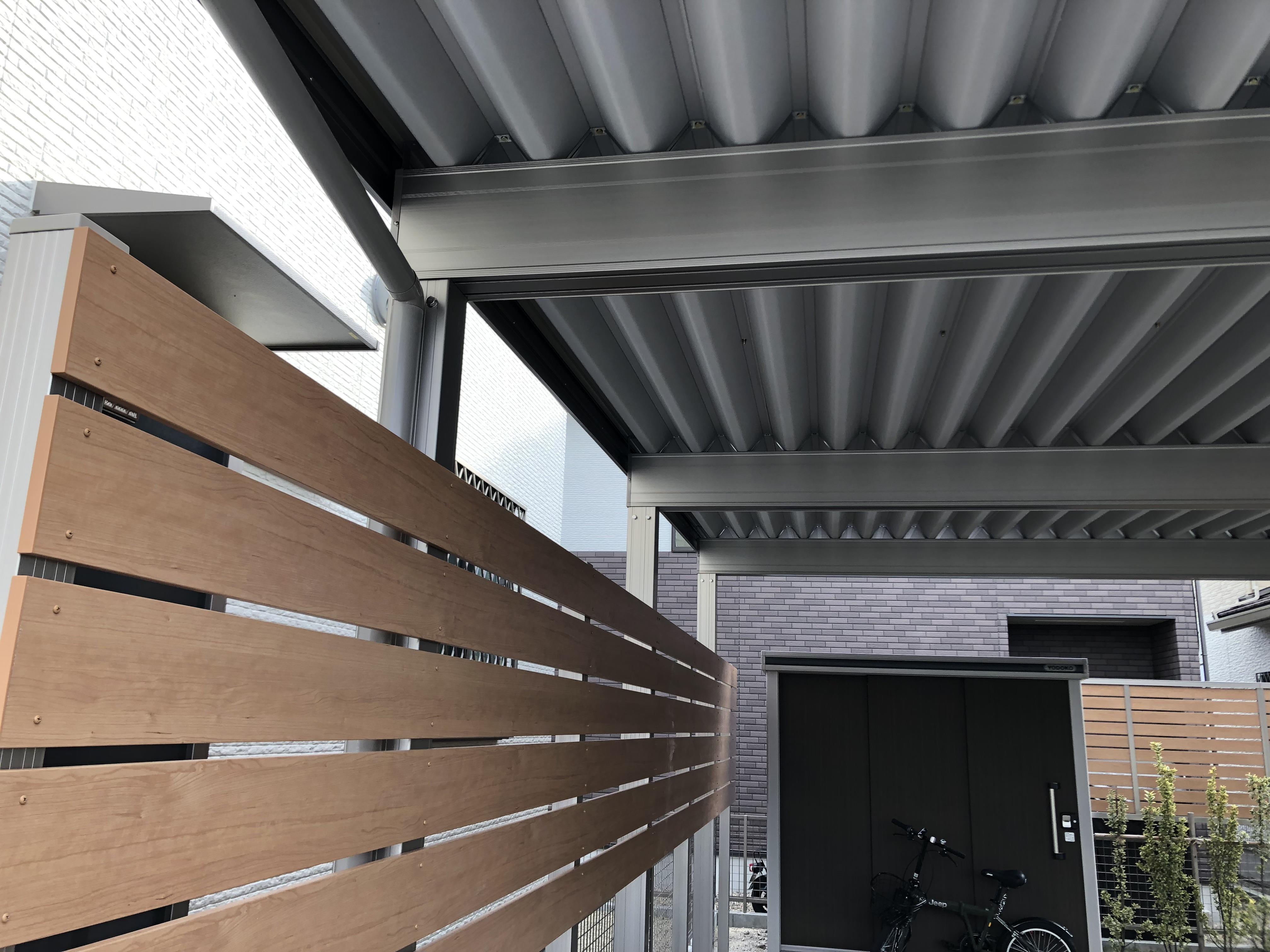 新築のお庭に、カーポートと、高さのあるフェンスを設置したいとのご依頼を頂きました。カーポートは、近年の雪や台風の影響を考慮して、強度を重視した商品をご希望でしたので、折板仕様のテリオスポートを、フェンスは高さのあるもので、木目調がお好みでしたので、LIXILセレビューフェンスをご提案いたしました。さらに、カーポートの側面にフェンスとのつながりを持たせる為、フェンスと同じ木目調のデザイナーズパーツを設置いたしました。完成後、全体バランスがとてもいいと、大変ご満足頂けました。