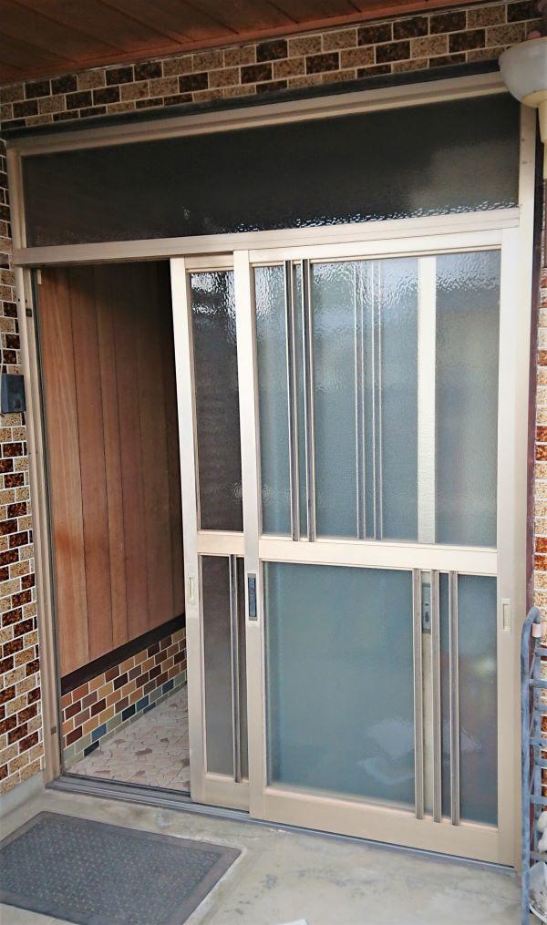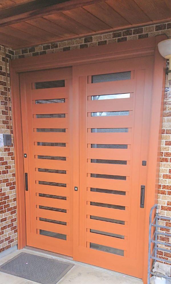 41年前に建てた当時のままの玄関は、引き戸全体が歪み始め、鍵もかかりづらくなっていた為、交換のご相談を頂きました。現状は下レールが擦り減り動きも悪く、冬になると隙間から寒い風が吹き込む為、ストレスのない状態にしたいこと、さらに外観と調和するデザインのものをご希望とのことでした。そこで、既設同様、引き戸を選択し、外壁タイルにマッチしたデザインと色をご提案させて頂きました。重厚感のある色と光が差し込むデザイン、締まりのある手がけ部分の色をお選び頂きました為、とても存在感のある玄関になりました。