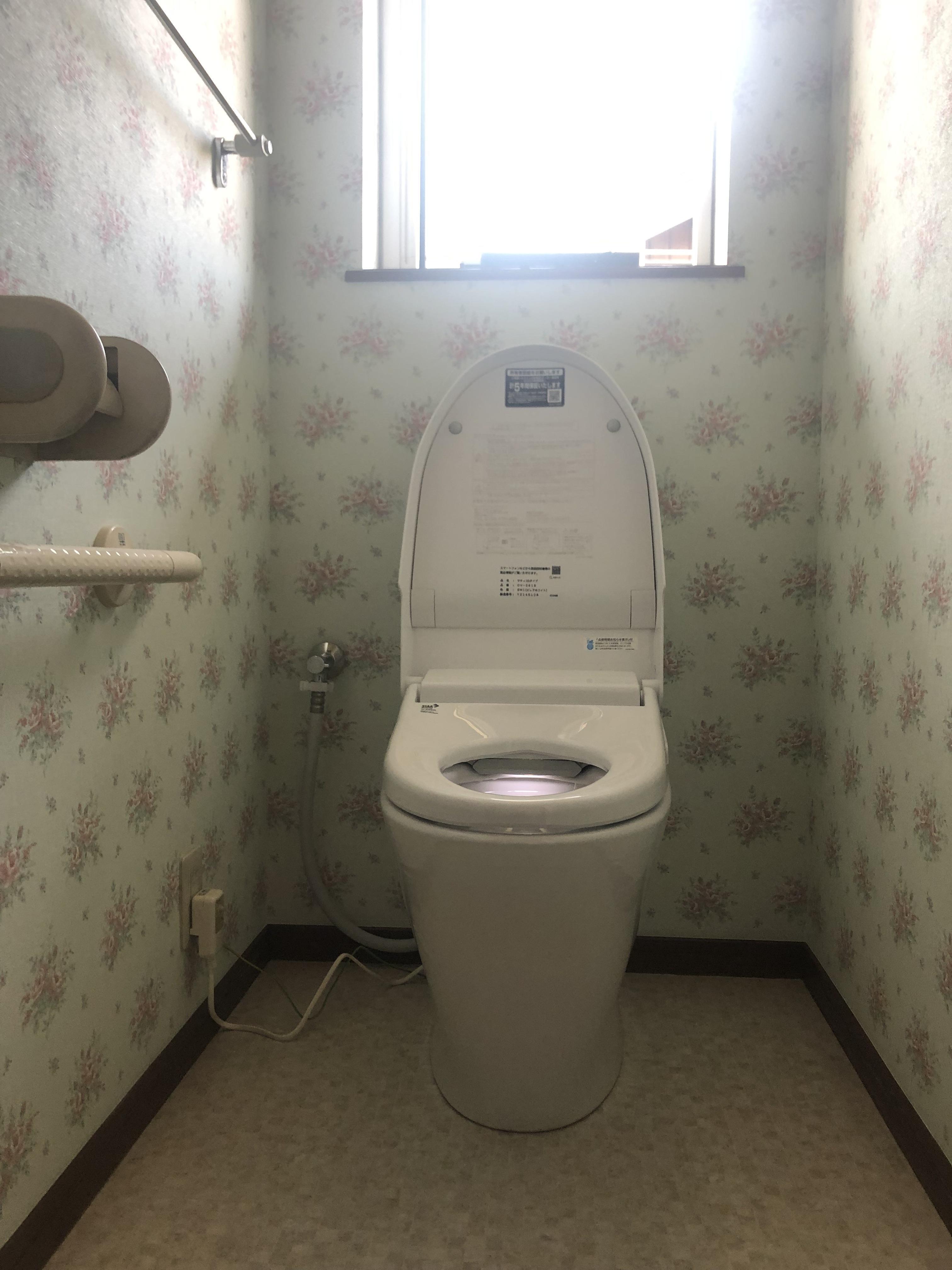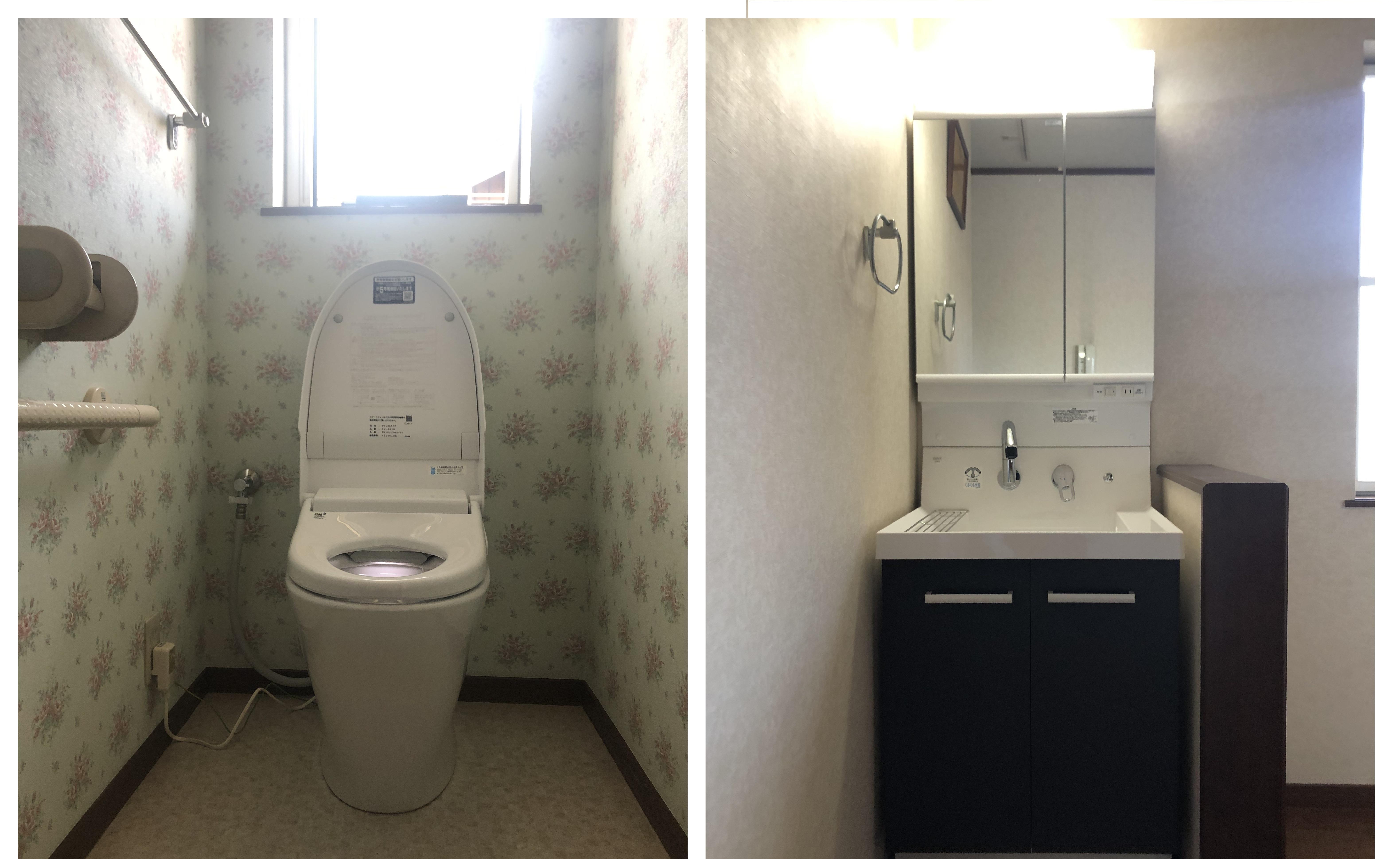 経年劣化の為、トイレ、洗面の交換のご相談を頂きました。既設の洗面は、蛇口の首の部分が故障し、洗面ボウルも狭いため、バケツがおけるくらいのボウルの大きさにされたいとのご要望でした。トイレ本体はタンクレスで空間を広く使用することが出来、壁紙はお花柄で以前より明るく華やかな雰囲気へと変身しました。洗面は、バケツが入るひろびろボウルで、サイドには濡れたもの物を置けるウェットパレットがありとても使いやすくなりました。