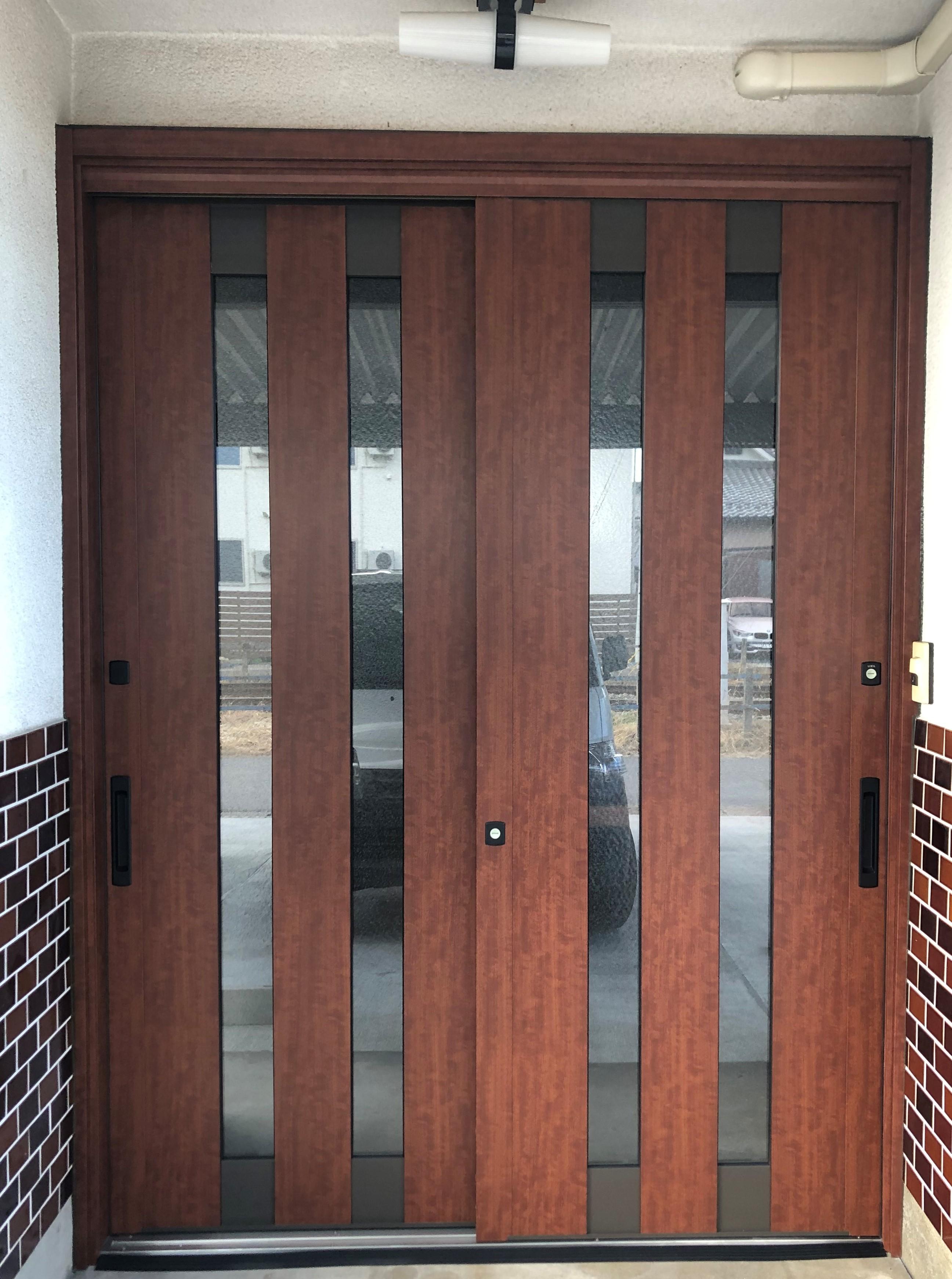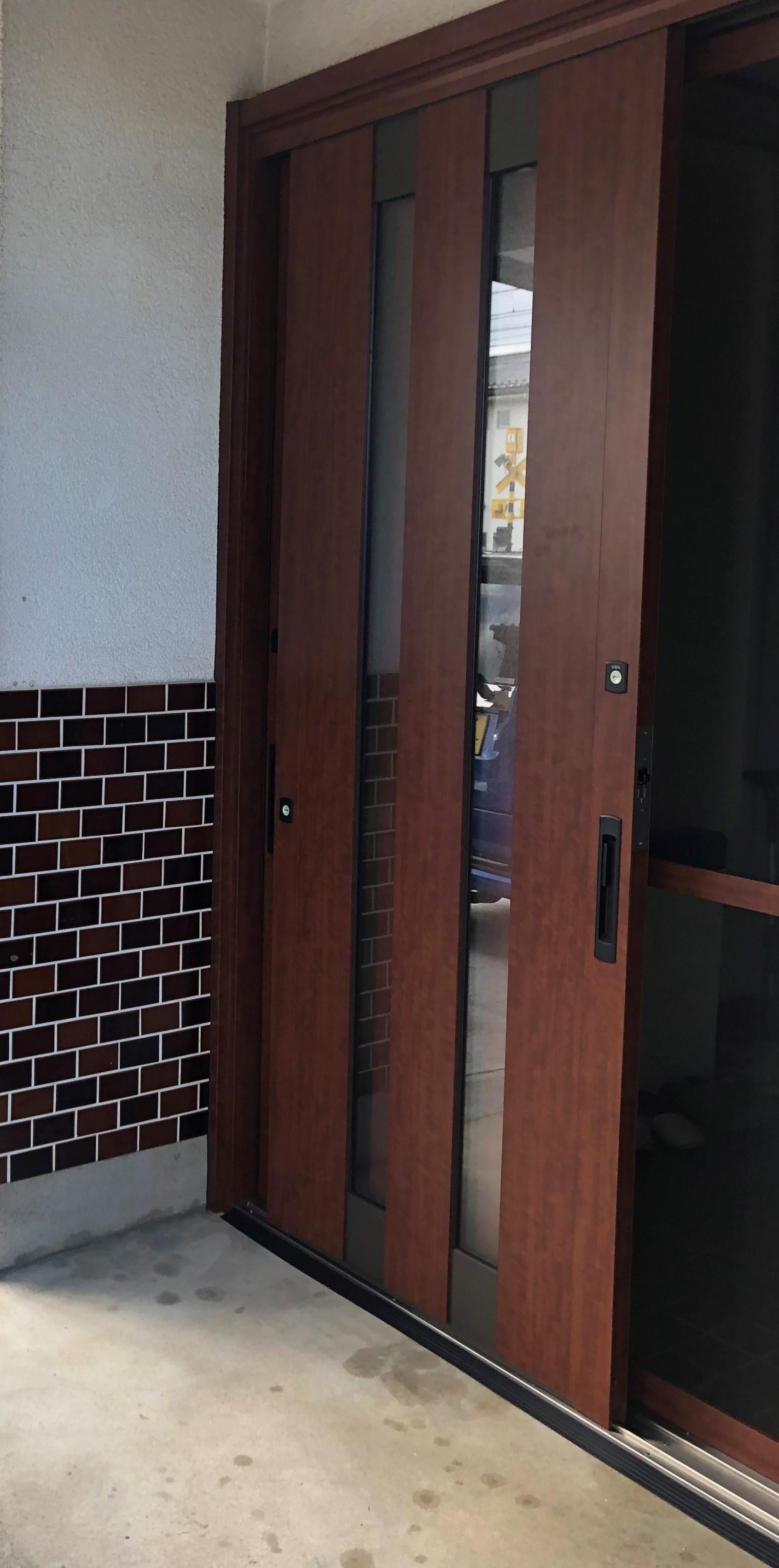 玄関のガラス部分が割れた為、早急に交換して欲しいとのご相談を頂きました。リフォーム箇所が玄関の為、1日で工事を完了して欲しいとのご要望でしたので、パットリフォームとして対応できる、LIXILのリシェントをお勧めいたしました。重厚感のある木目柄で、中桟付きの網戸もセット。とても落ち着いた玄関になりました。工事も1日で完了し、お施主様も大変喜んで頂けました。施工後、他の箇所のリフォームもご依頼頂き、とても嬉しく思います。