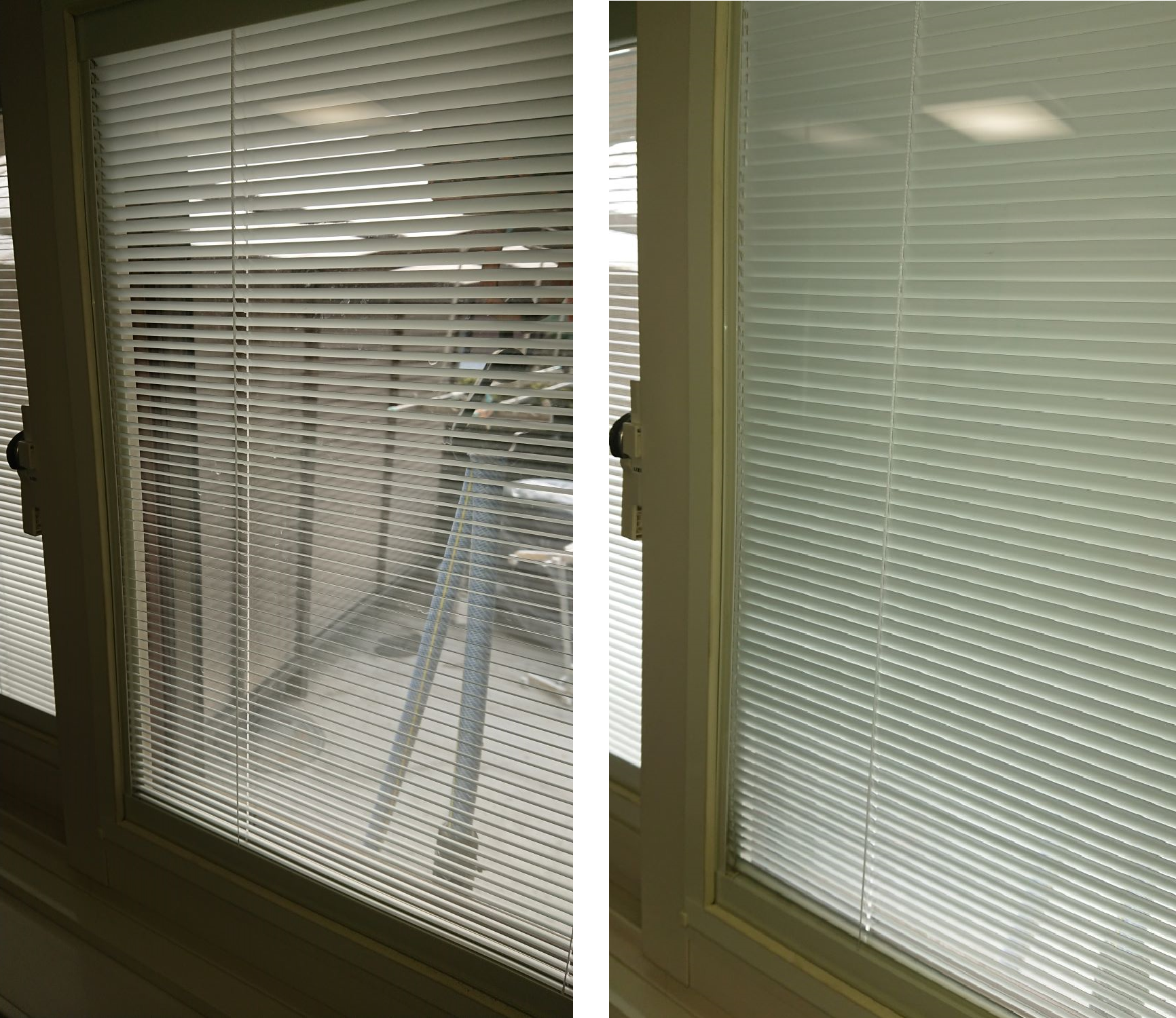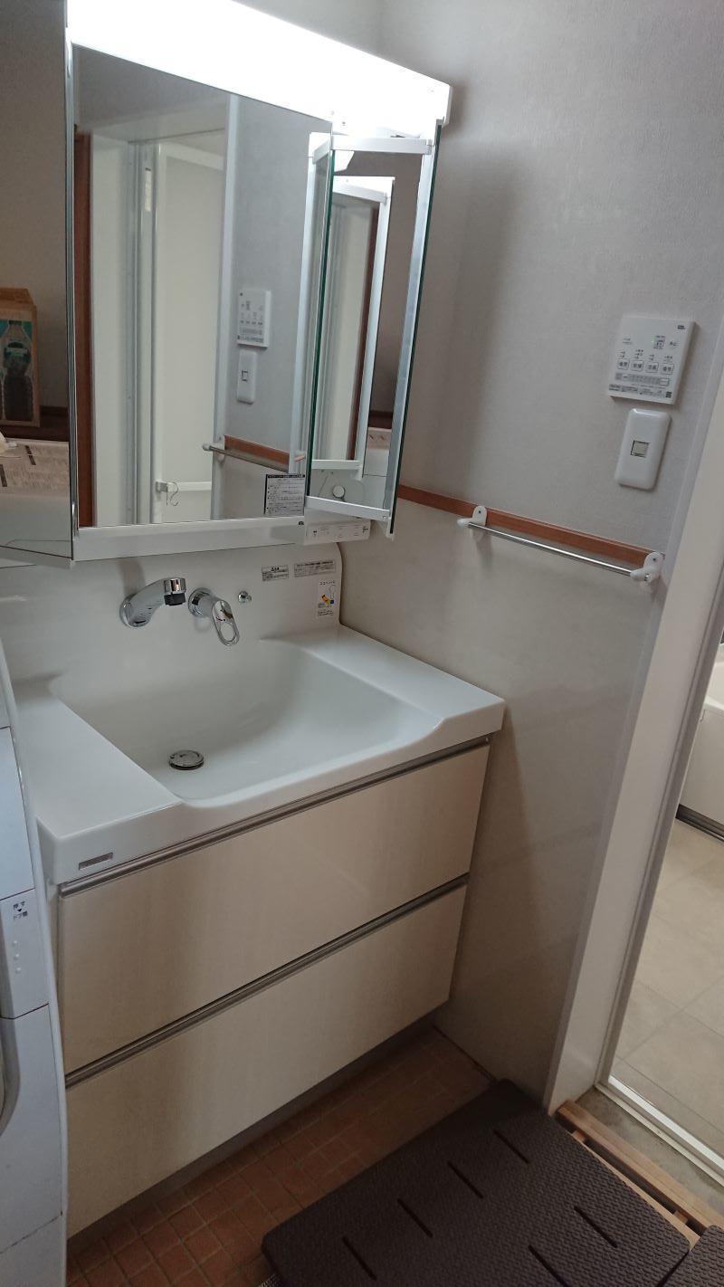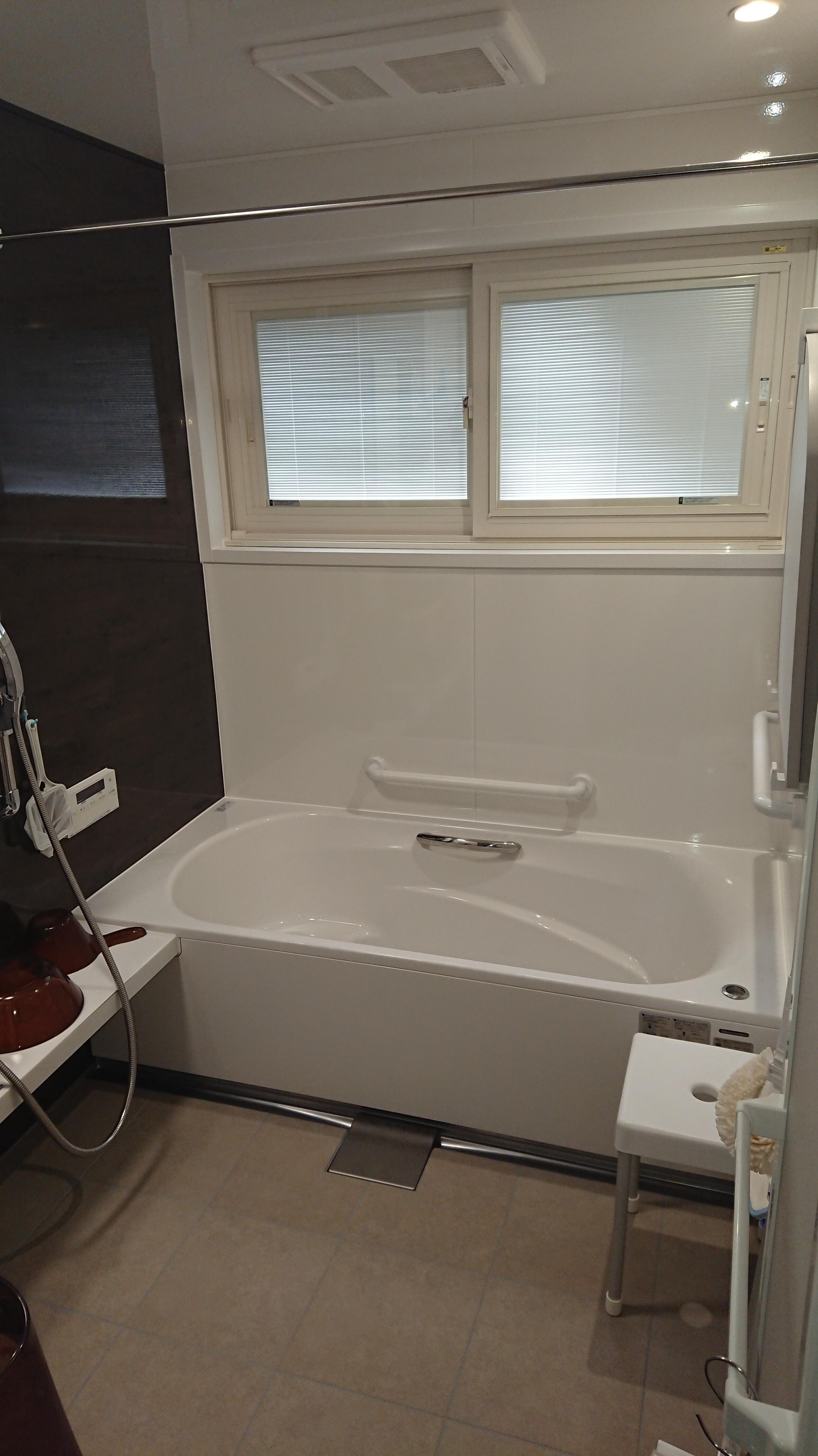 お掃除がしづらく、冬はヒヤッと寒いタイル張りの在来浴室の為、暖かいシステムバスへ交換したいとのご相談を頂きました。また、浴室窓の内側にブラインドを設置してみえたのですが、お手入れが大変とのことでしたので、ガラスとガラスの間にブラインドを挟んだ二重サッシをご提案させて頂きました。操作ツマミを上下するだけの簡単操作で、ブラインドの開閉が可能です。さらに洗面本体と洗面室の壁紙を交換、洗面本体横にキッチンパネルを貼らせて頂き、空間リフォームが完成しました。