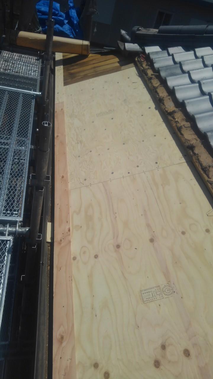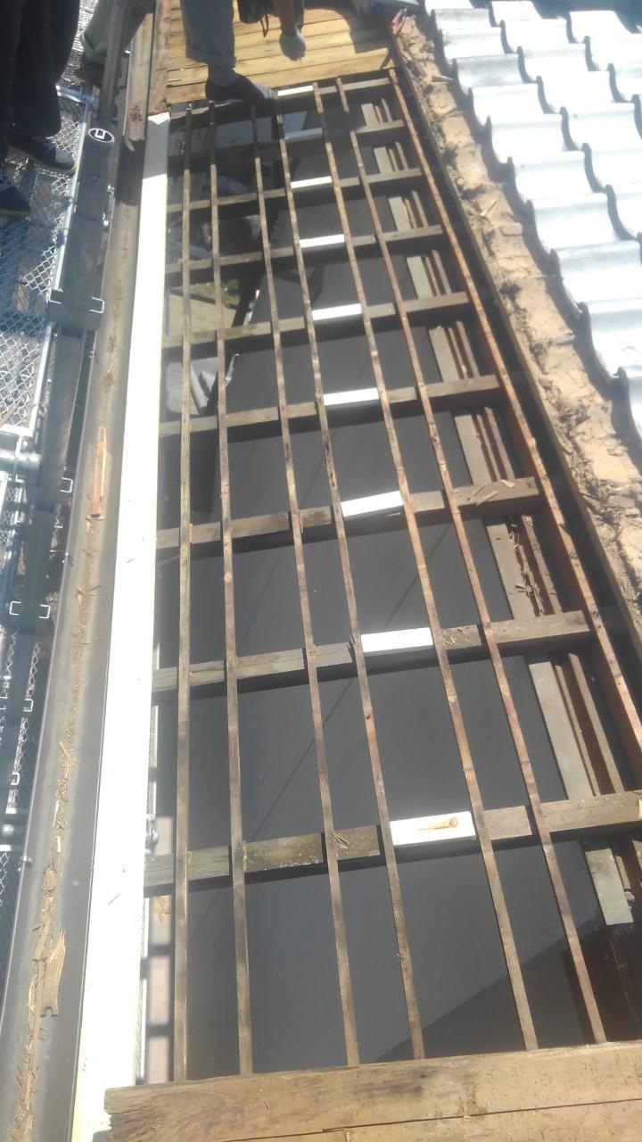 高所作業になるのでどうしても足場の設置が必要になる迄を理解下さりありがとうございました。足場を設置したおかげもあり安全かつ丁寧な仕事をさせて頂く事が出来ました。 元々の造りもしっかりされていたので部分的な下地の交換で対応する事が出来たと思います。下地への雨の侵入も見られたのでルーフィングにて防水処理をさせて頂きました。