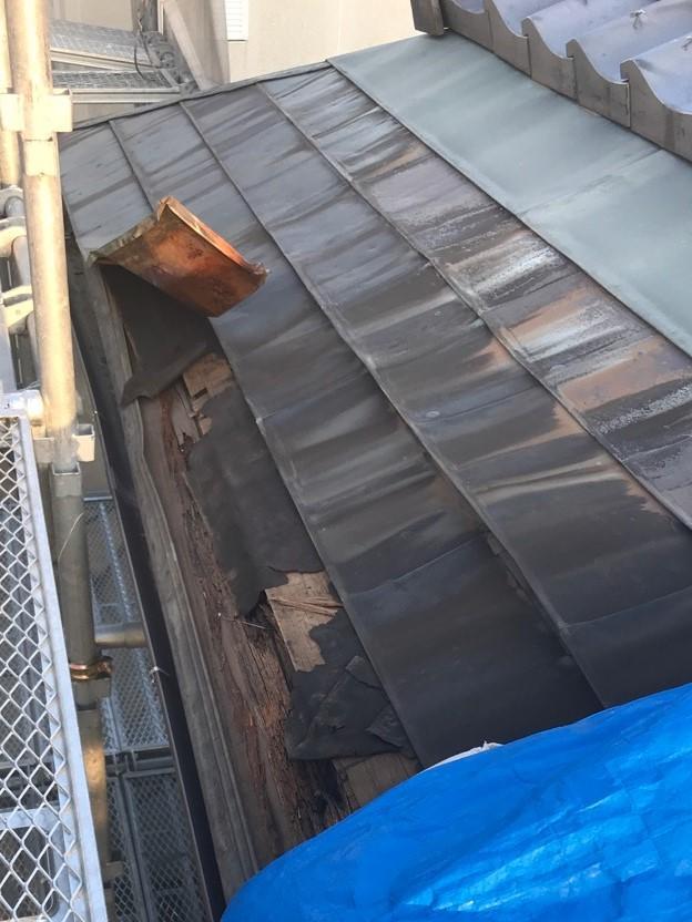 台風の影響で屋根の一部が飛んでしまった為、雨が入らないように修繕して欲しいとのご相談を頂きました。屋根に上がって確認したところ、銅板屋根の下地となっている木の部分の腐食具合が酷く、過去から腐食していた箇所もありました。木下地の一部を修繕し、その上にガルバニウム鋼板で修理を行いました。3社程お見積りをとられ、一番施工範囲が多く値段も予算を超えてしまいましたが、破損個所の写真を見て頂き固定ヶ所の木下地を交換しなければ再発の恐れがあるまでの説明をさせて頂き、弊社の提案内容でご理解を頂きました。解体から完成までの工程の写真を見て頂き、解体してみないとわからない箇所にも腐食があり、交換する事ができました。見積りといっても化粧材(表面材)のみの交換ではなく、ビスや釘でしっかりと素材を固定しなければ、今回と同じように強風で飛んでしまいます。幸い今回は銅板のヶ所のみの交換で対応出来ました。