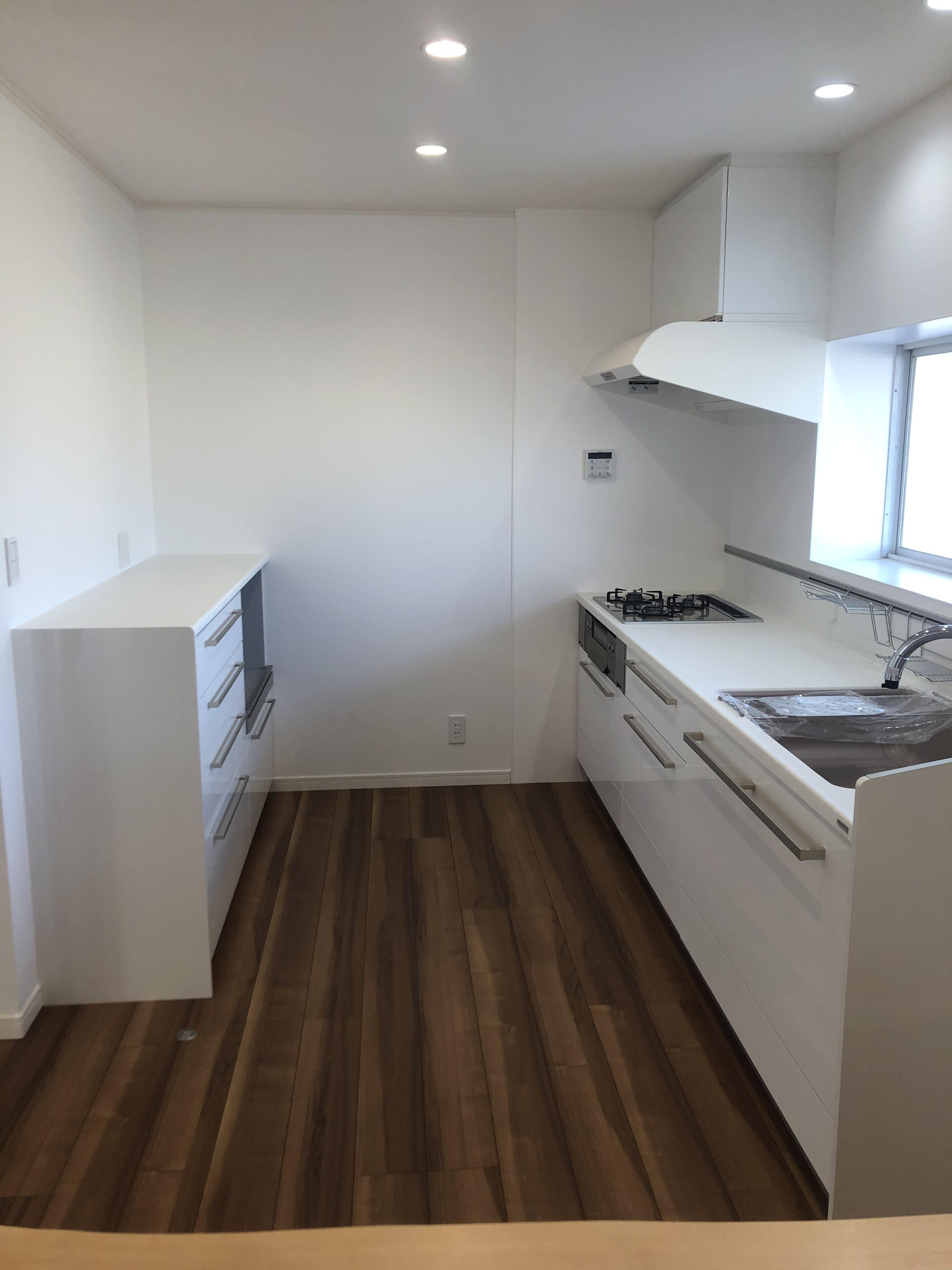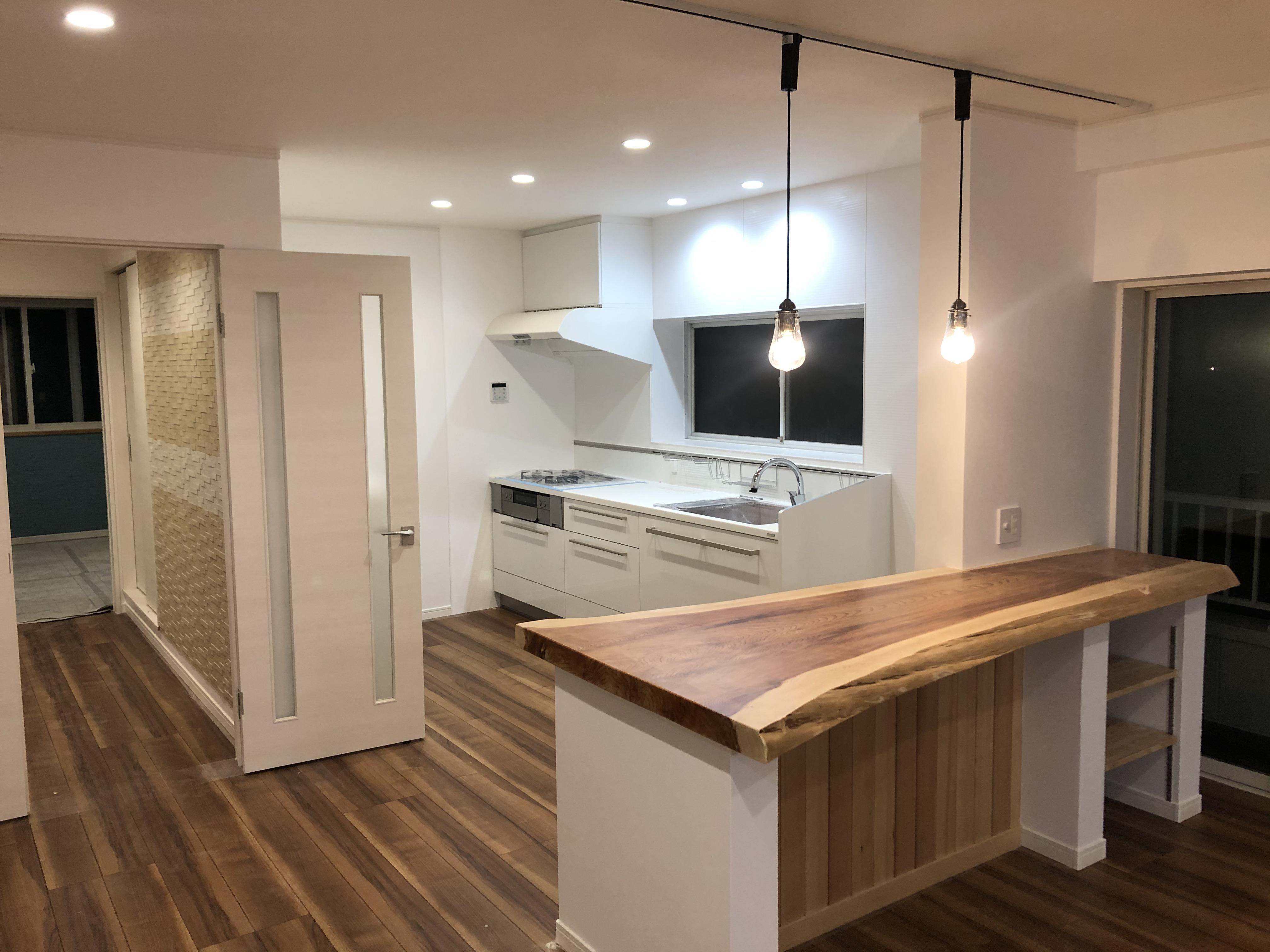 中古物件(戸建て)購入後、リフォームをしたいとのご相談を頂きました。ビルトインガレージの為、2階部分の居室が寒いので暖かくしたい、水まわりは全部交換したい、快適に過ごせるように間取りを変更したい、とのご要望でした。そこで、断熱材を天井に追加、床に施工し、サッシはペアガラスへ交換、日当たりが気になるお部屋にはエコカラットで調湿効果をはかりました。水まわりは全て交換し、脱衣所には、収納棚の下にペットの通用口をつくり、リビングと行き来できるようにしました。キッチンの木のカウンターテーブルは、天板から探し造作しました。快適な生活をお過ごし頂けるように、収納を多くし間取りも変更しました。リビングは隣接していた2間の洋室の壁をなくし、広々とした空間にしました。将来的にお部屋を作るかもしれないということも考え、コンセントや照明の位置などにもこだわりました。テレビボードや書斎のテーブルは造作し、クローゼットはハンガーラックを取り付け、収納棚には仕切りが可動できるタイプに、カーテンやエアコンも設置し、お引っ越し後すぐに生活が始めることができるようにご提案させて頂きました。毎週お打合せをさせて頂きながら、細かな調整を一つ一つ丁寧に行うことで、理想の空間づくりのお手伝いができたのではないかと思っております。