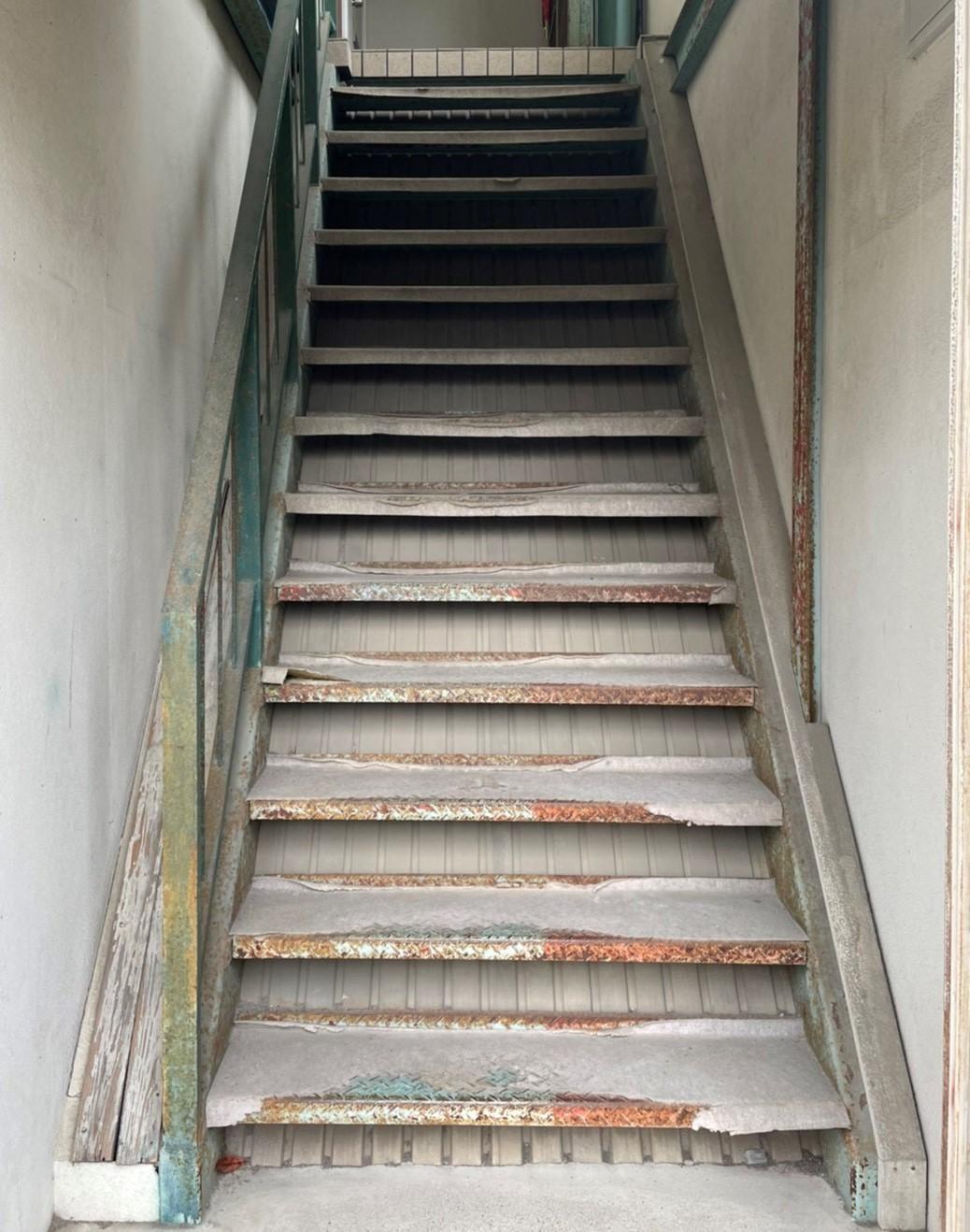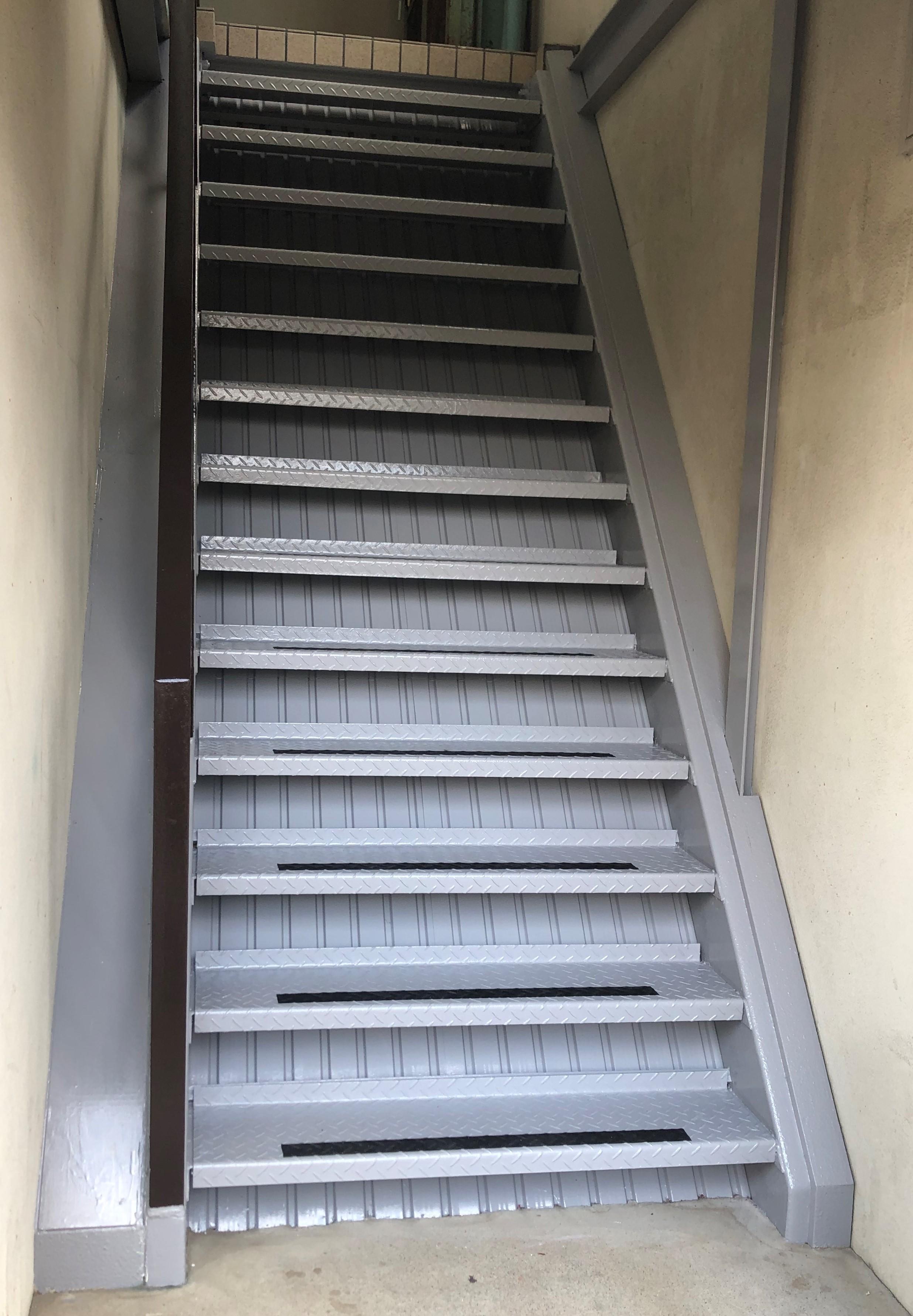 インナーガレージに隣接した屋内階段のカーペットが剥がれてきた為、補修のご相談をいただきました。既設のカーペットをめくり、塗装をしました。滑り止めとしての役割を担っていたカーペットの代わりに、黒の滑り止めテープを取り付けました。
