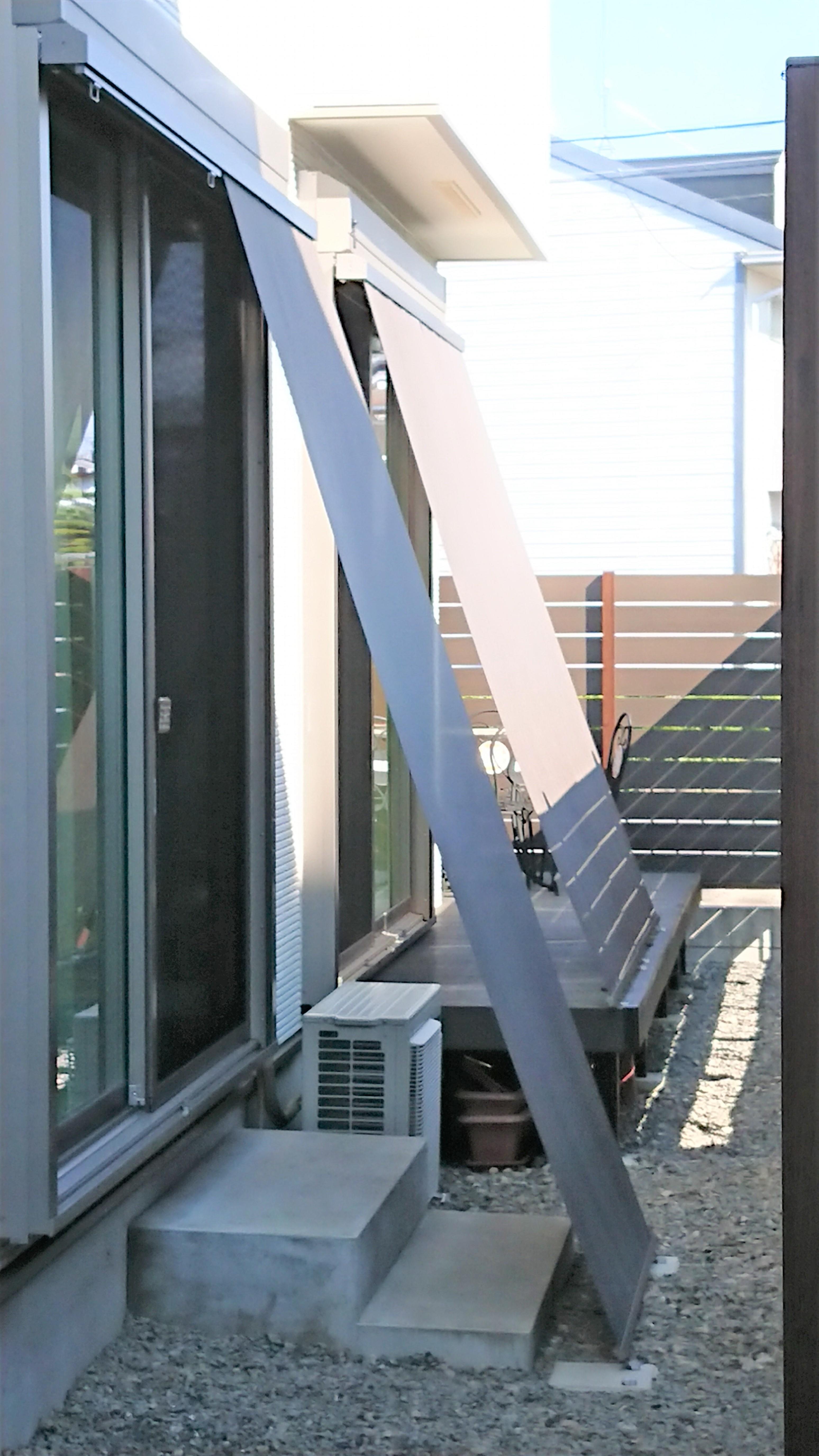 日差しや雨による色あせ・劣化に強く、お掃除も簡単なスタイルシェードをご提案させていただきました。スタイルシェードは、汚れても水でサッとお掃除ができ、必要に応じて生地のみの交換も可能です。光を確保しながら、外からの視線をカットする役割も兼ね備えている為、部屋が暗くならずにプライバシーが守れます。