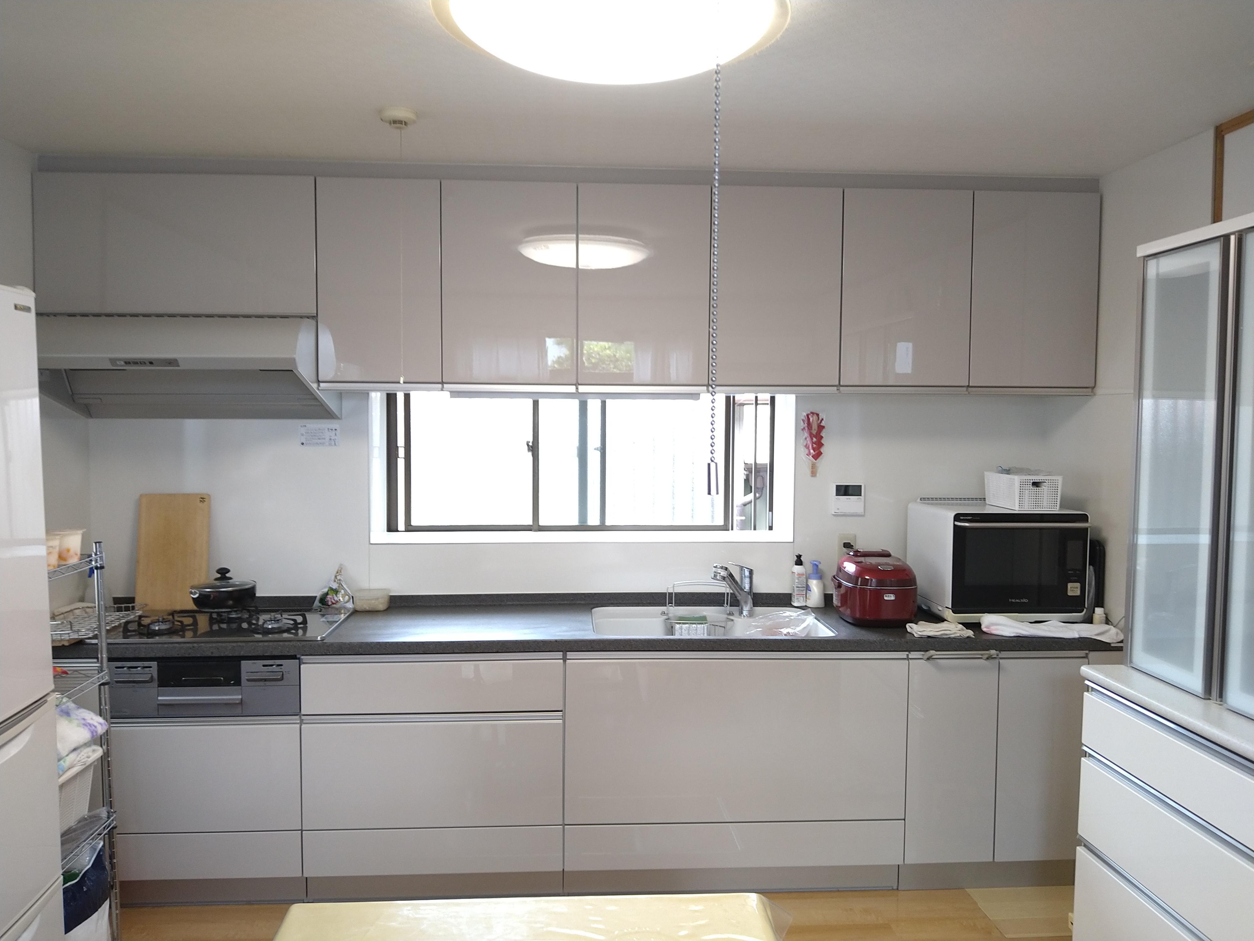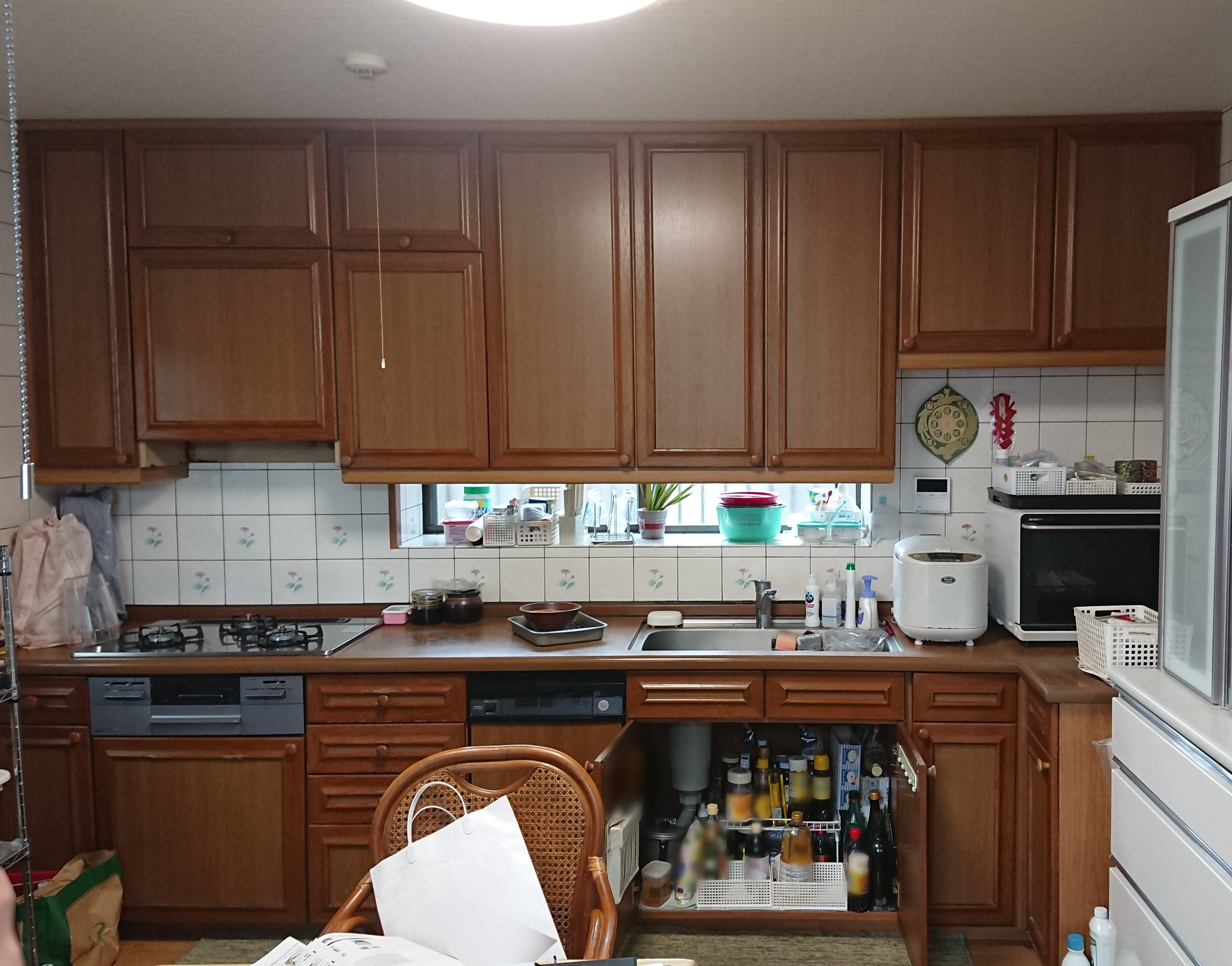 キッチンの老朽化にともない、交換のご相談をいただきました。既設のサイズより小さくなるのは避けたいとのご要望でしたので、壁から壁のオーダーサイズのご提案をさせていただきました。タイル張りをキッチンボードにしたり、お掃除箇所が少ないレンジフードを選択したりと、お手入れにもこだわりました。