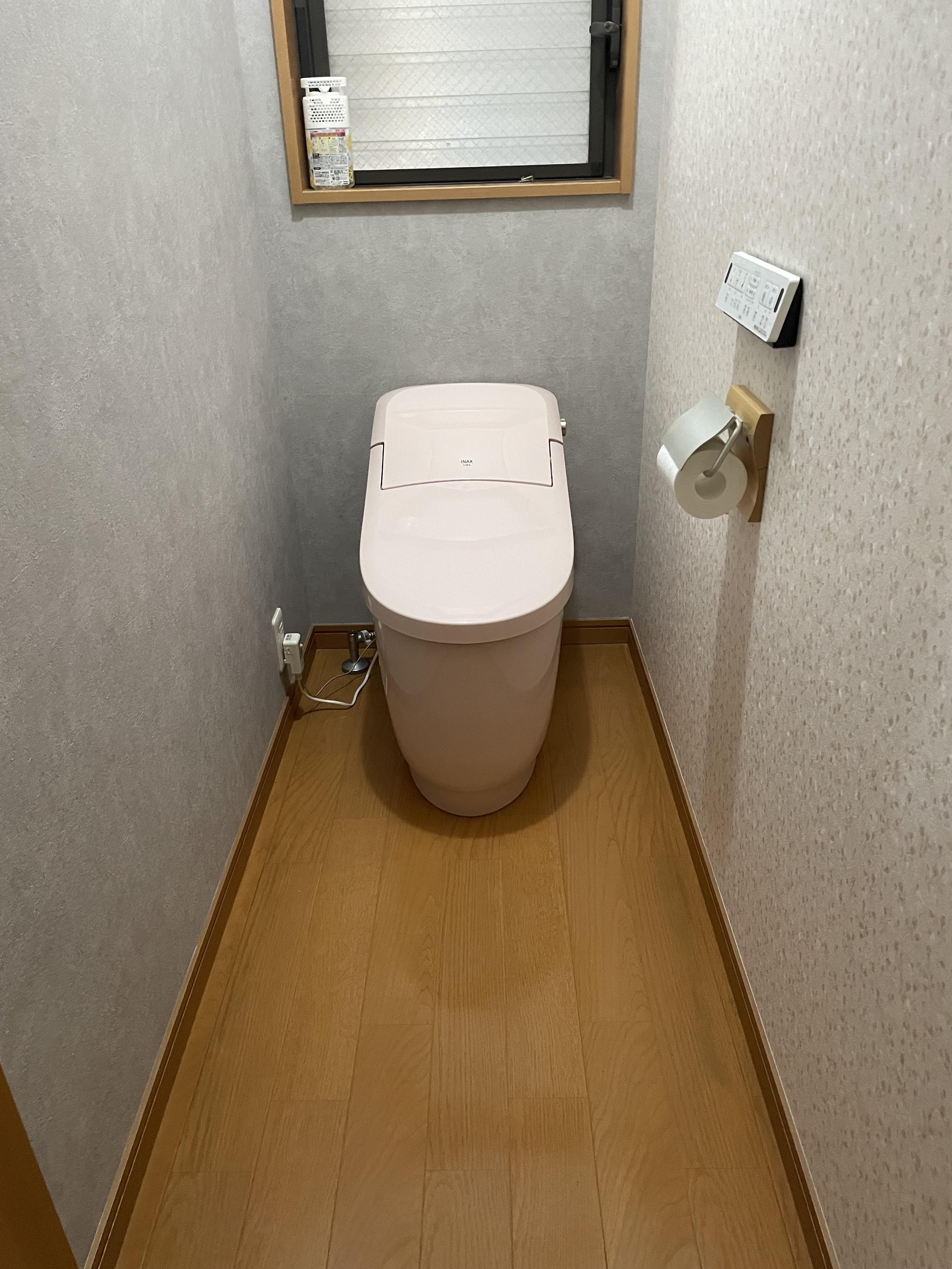 1階トイレ:LIXILのプレアスLSタイプ、トイレ手洗い:コフレルワイドと、壁を補強後、手すりカウンター(ロングタイプ)施工、壁紙交換をさせていただき、2階はトイレ:プレアスLSタイプ、壁紙の交換をいたしました。プレアスLSタイプはタンクレスのように見えて、タンク付きのトイレです。足元がスッキリして壁紙も交換して良かったと、大変ご満足いただけました。