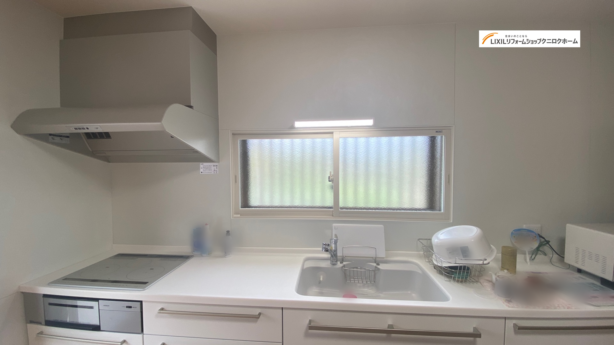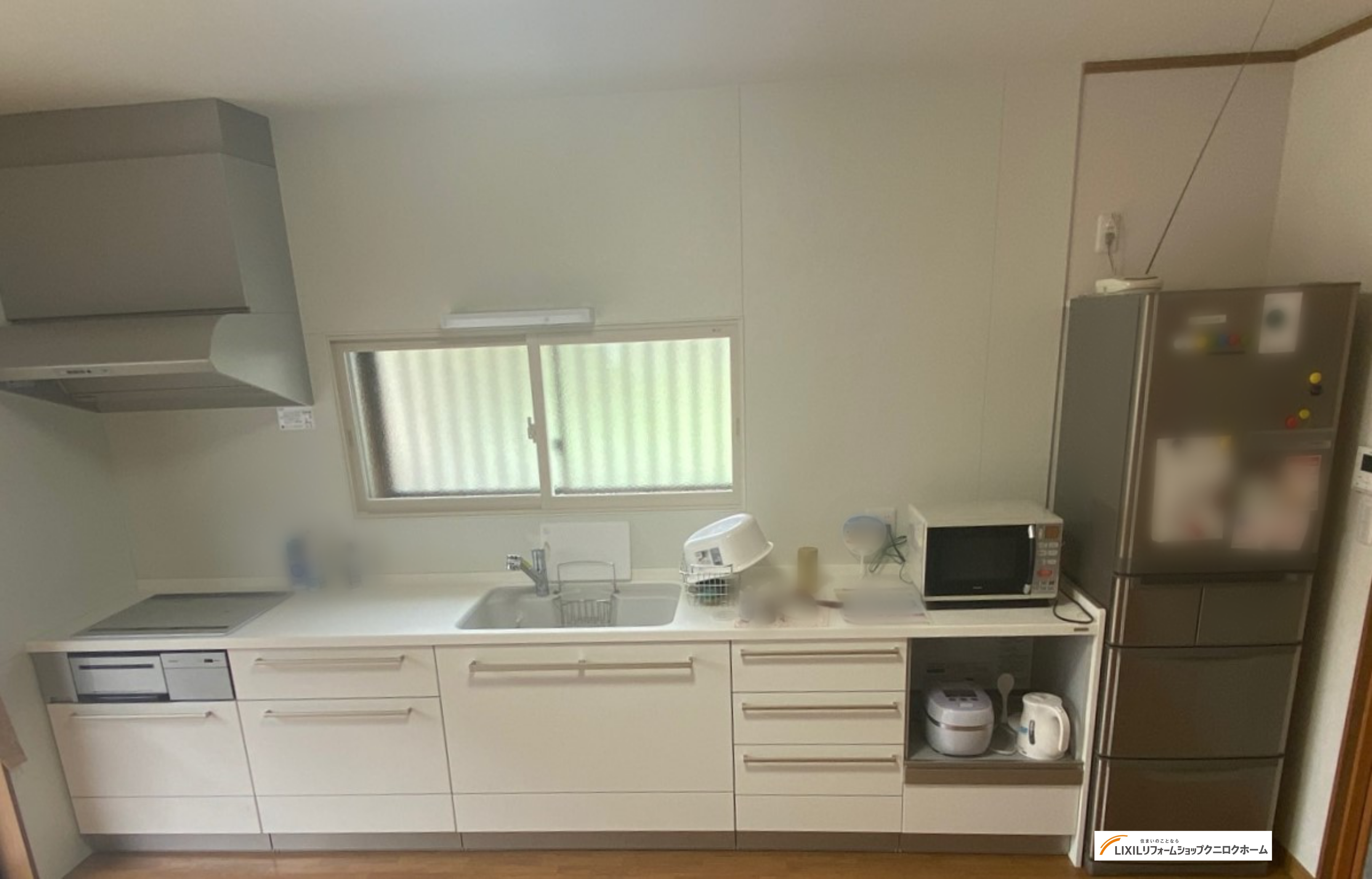 既設のキッチンは、冷蔵庫がダイニングスペースを挟んで後ろにあるため不便であり、ダイニングテーブルを中央へ配置するとお部屋全体が狭くなるため、もう少しスッキリしたいといったお悩みをお持ちでした。そこで、当初はキッチン横に冷蔵庫とカップボードを設置するプランを予定しておりましたが、キッチンのカウンターを延長し、カウンター下にスライドタイプの収納を設けることで、食器の保管、家電の設置もできました。ご姉妹並んで調理を楽しんで頂くこともできます。白色のインプラス(内窓)の設置により統一されたとても素敵な空間になりました。