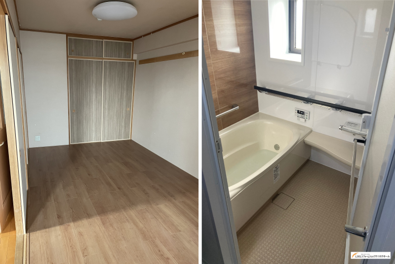 マンションリフォームのご相談をいただきました。リフォームのきっかけは、キッチンのレンジフードの交換でしたが、洗面化粧台の水栓金具交換、・クロス・クッションフロアの張り替え、洗濯パンの交換、ソフト幅木の取り付け、玄関扉の修繕、浴室まるごと交換、和室から洋室へリフォームさせていただきました。畳を撤去し、フローリングを張り、襖は洋室にマッチするような柄をお選びいただきました。時間を大切にされるお施主様でしたので、浴室の仕様につきましては、入浴時のリラックス効果を重点にお打合せを進めさせていただきました。LIXILのリノビオVのKタイプ(スマートエスコートバー・まる洗いカウンター・ワイドレバー水栓)をご採用いただきました。