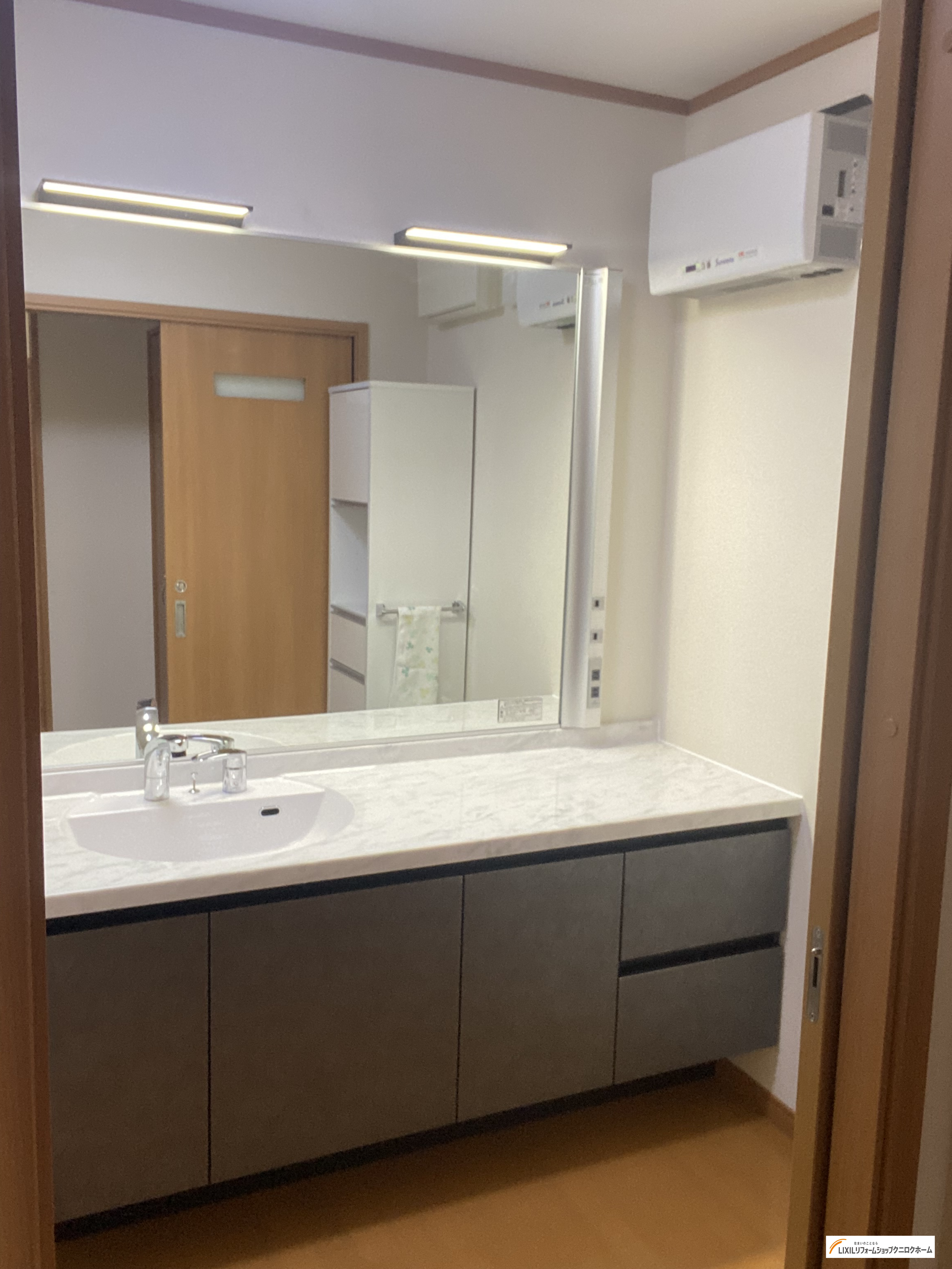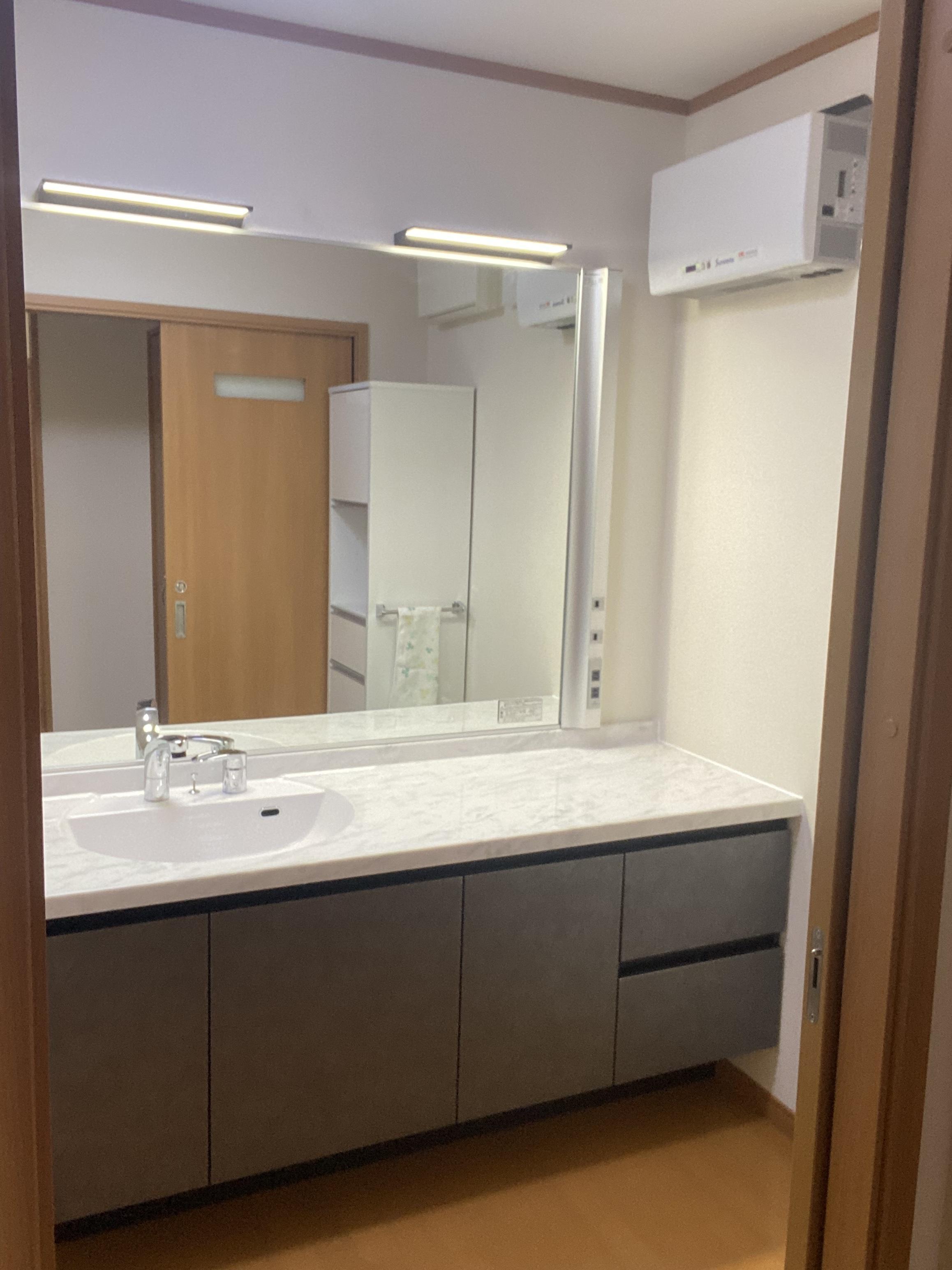 ご自宅を建売で購入され、購入時からお使いになられていた洗面を交換したいとご相談をいただきました。水はねが気になる為、洗面ボウルは真ん中に設置し、カウンターの両サイドにスペースが欲しいとのことでした。洗面化粧台を大きくすることで収納量が増え、洗面化粧台以外の収納棚で管理している日用品等をまとめることができます。またカウンターが広く大きくなることで、いろいろな作業ができるようになりました。