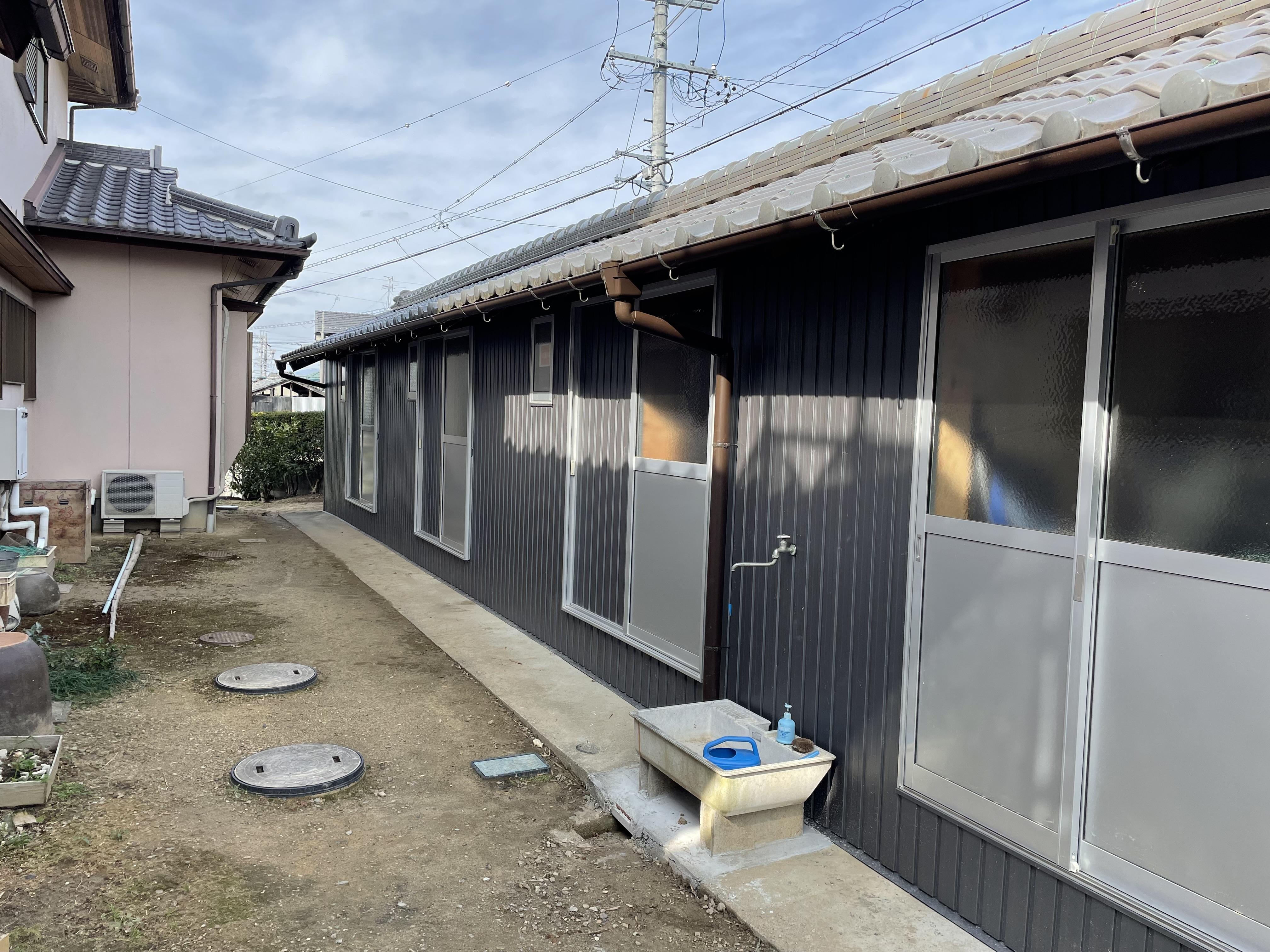 農機具庫のリフォームをさせていただきました。当初は解体もお考えではありましたが、外回りを中心としたリフォームの提案をさせていただきました。サッシや扉は新しく交換し、電気工事としては、照明やコンセントの設置等を行いました。また、外壁には耐久性の高いガルバニウム鋼板を施工させていただきました。