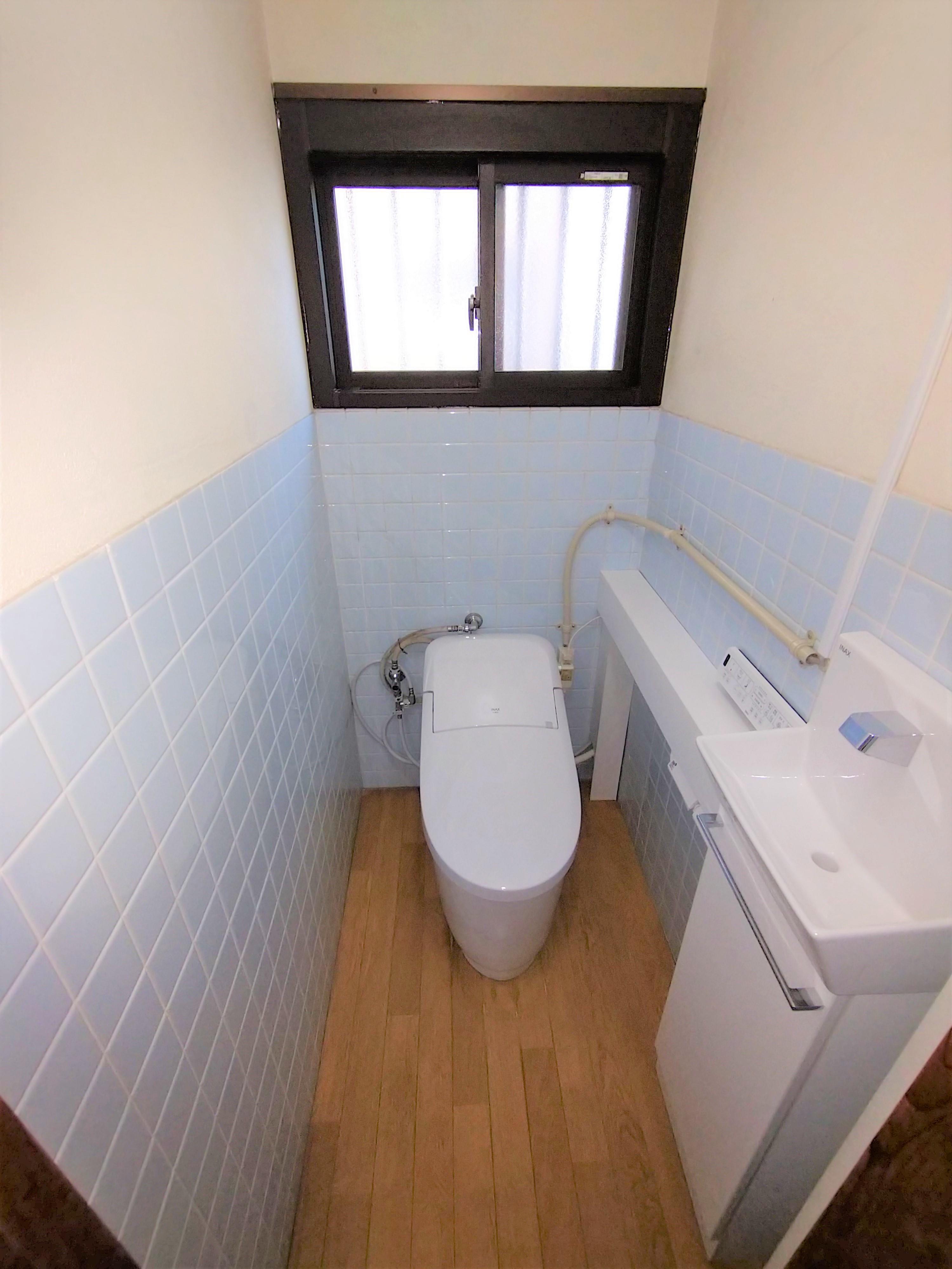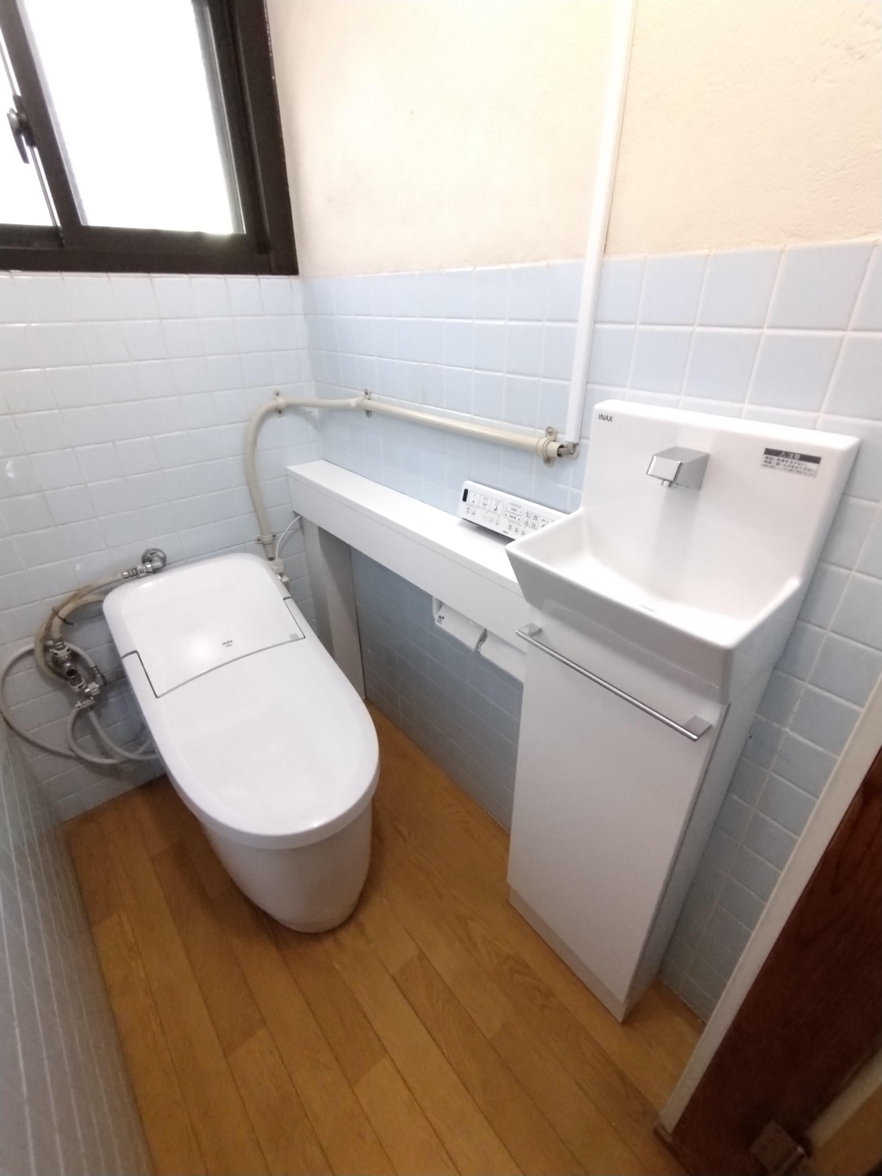トイレの老朽化かつご家族にご高齢の方がみえるので、リフォームしたいとのご相談をいただきました。既設のトイレは、手洗いが本体と一体の為、振り向いて手を伸ばして使われていたのですが、その作業が毎回大変になってきたとのことでした。今回は、LIXILのプレアスLSと言う製品で、手洗いカウンター付のトイレをご提案させていただきました。この商品は簡単に『プレアスLSタイプ+手洗い』の空間へリフォームでき、新たに給排水を設けなければならない程の大がかりな工事は必要ない為、工事期間も1日程度で設置が可能です。また、設置工事も簡単なのでコスト削減にもなります。手洗いの水栓は自動水栓をお選び頂き、手を水栓に近づければ蛇口から自動で水が出てきます。毎回ハンドルなどに触れる必要が無い為、衛生面としても清潔に使用する事が出来るようになりとてもご満足いただけました。