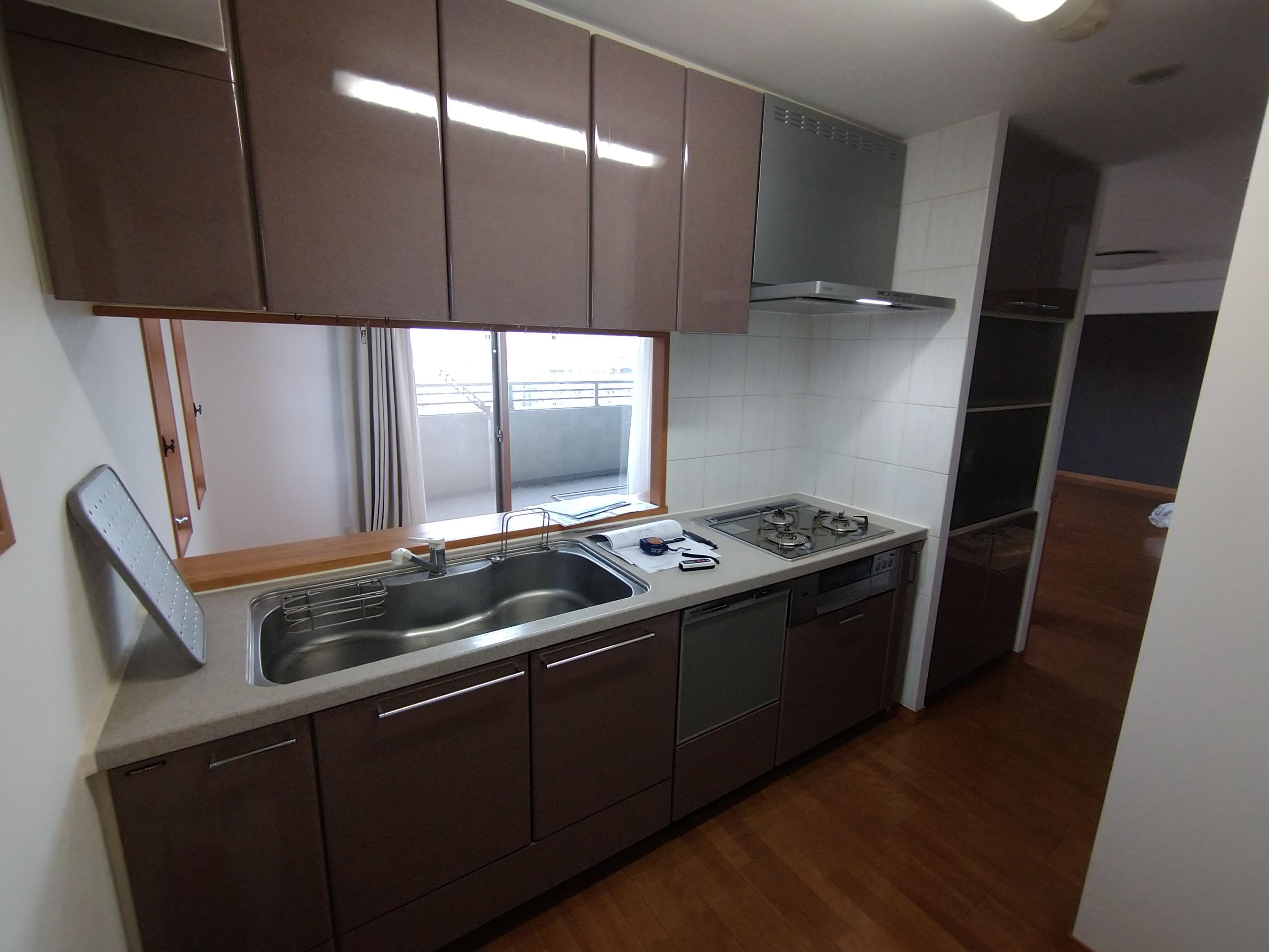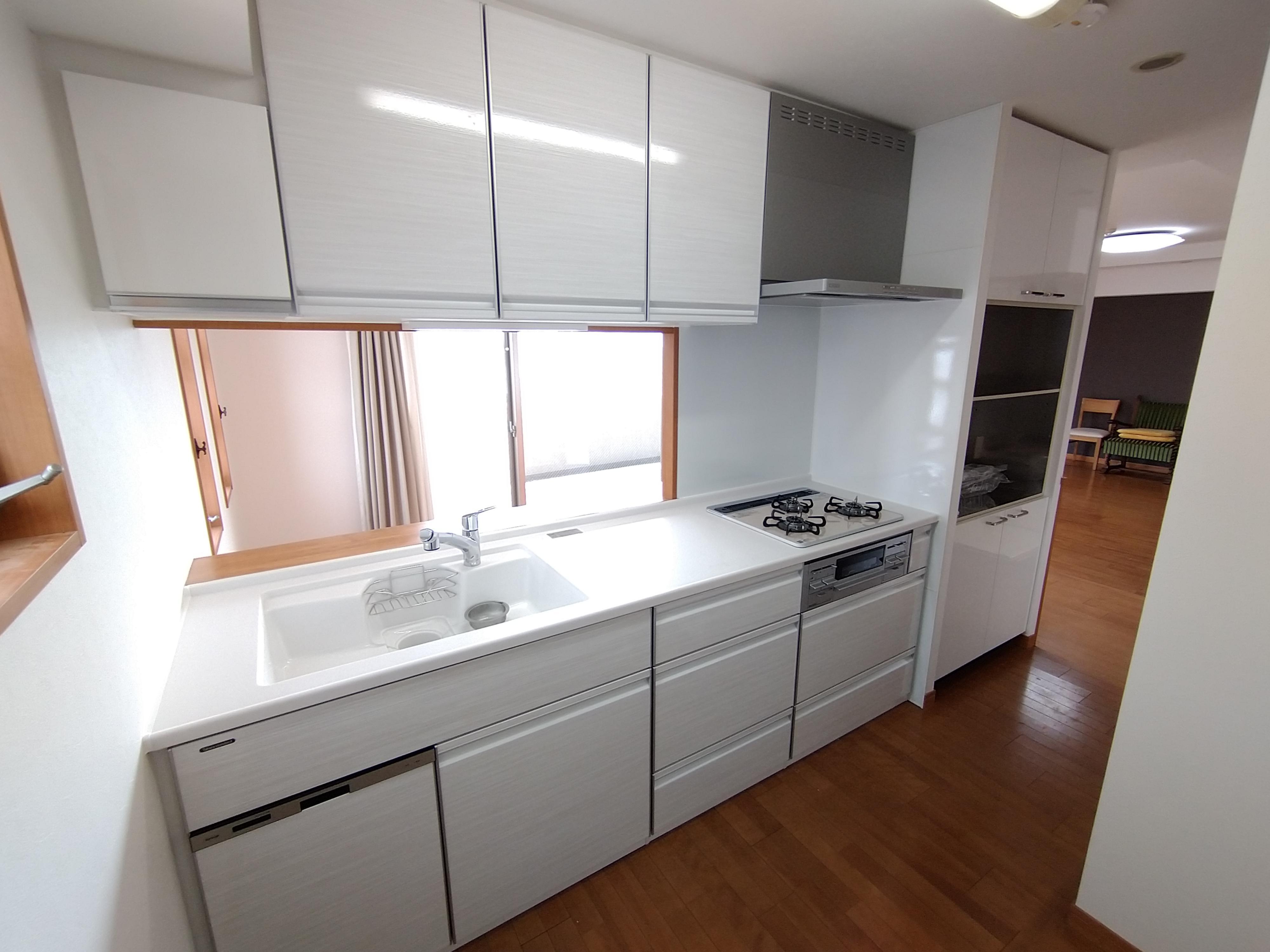 マンションをご購入後キッチン・トイレの改修のご相談をいただきました。お打合せのなかで、洗面の水栓金具や止水栓、洗濯機の水栓の交換も可能であることをお伝えしたところ、是非にということで工事させていただきました。キッチン横や前方にある収納棚も統一感を出すためにキッチンの扉柄と似た光沢のある扉へ交換せていただきました。