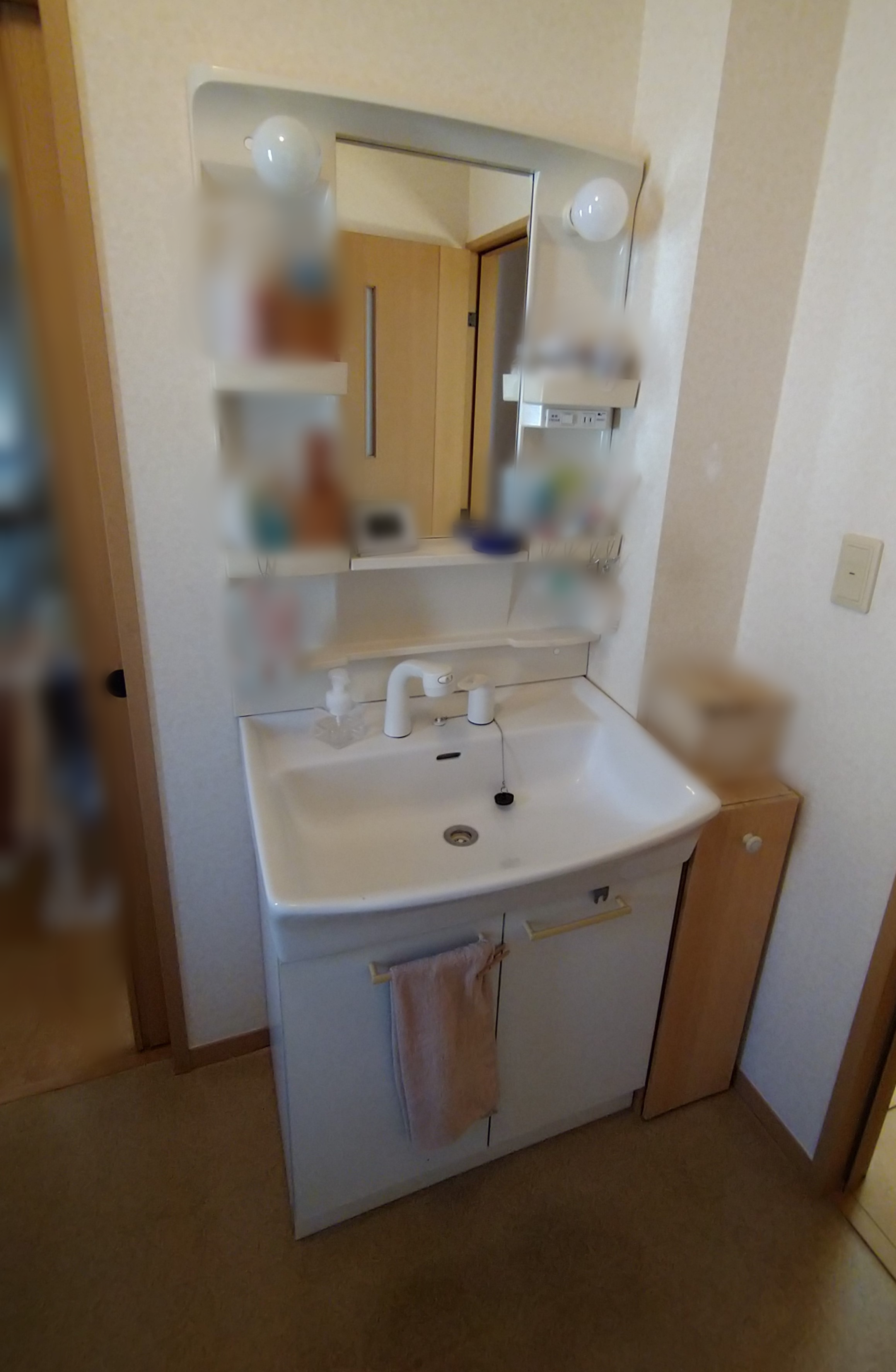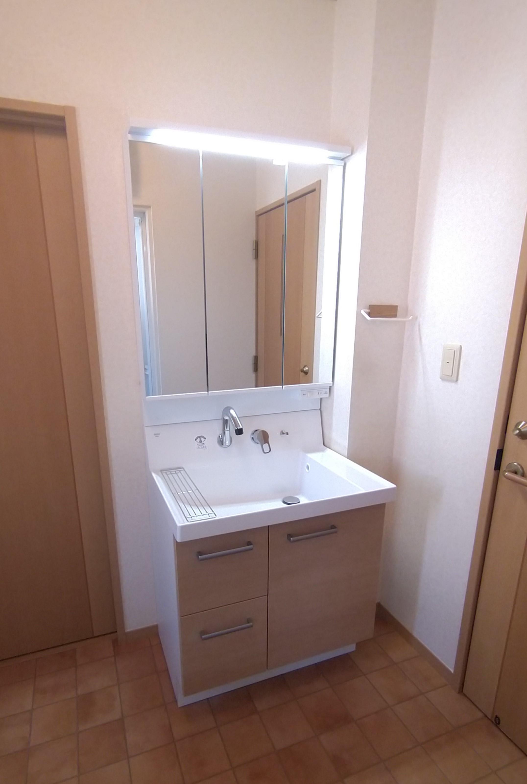 洗面のシャワーホース部分から水漏れがおきているので交換したいとのご相談をいただきました。新しく設置させていただいた洗面化粧台は、LIXIL製の「ピアラ」。サイズは既設と同じもので、鏡は三面鏡のタイプをお選びいただきました。毎日お使いいただく日用品が三面鏡の背面に収納できるため、見た目もスッキリ。さらに、身支度や家事をラクにするひろびろボウル&くるくる水栓を搭載しています。ボウルが広い為バケツでの水汲みもラクラクで、くるくる水栓は使いたい位置(左右に180度回転)にくるりと回せます。ボールの右サイドにはドライパレット(濡らしたくないものを一時置きするのに便利なサイドガード付で水だれも防ぎます)があり、左サイドにはウエットパレット(コップや泡立てネットなど、濡れものを気兼ねなく置けます)があります。