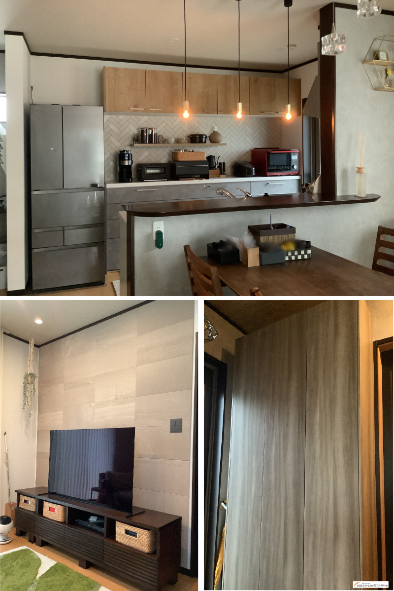 この度は弊社にてリフォームのご依頼を頂き誠にありがとうございました。 LIXILのキッチンから背面壁のクロスなどイメージをとても大切にされていたので、打合せの際は あえてお時間をかけさせて頂きました。インスタなどの画像写真も用いてお客様のイメージを確認 する事が出来たので良かったです。 TV背面のエコカラットやLDKの照明などもこだわらせて頂きました。 お選びいただいた色合いもよく全体的に高級感もありながら落ち着いた空間を演出する事が出来まし た。また、住宅でお困りごとなどございましたら、是非ともご相談願います。