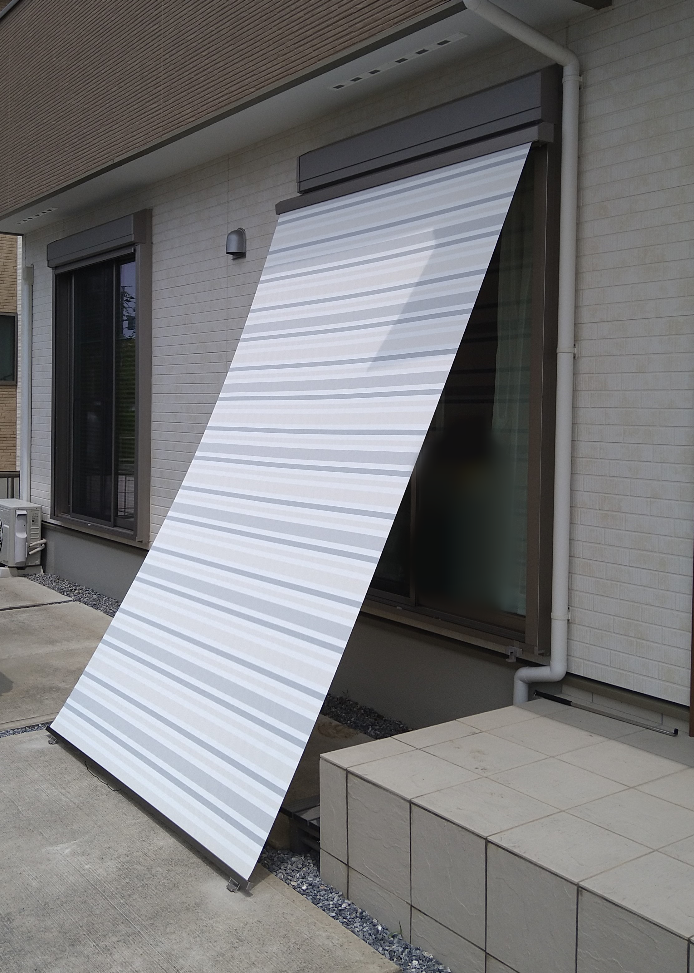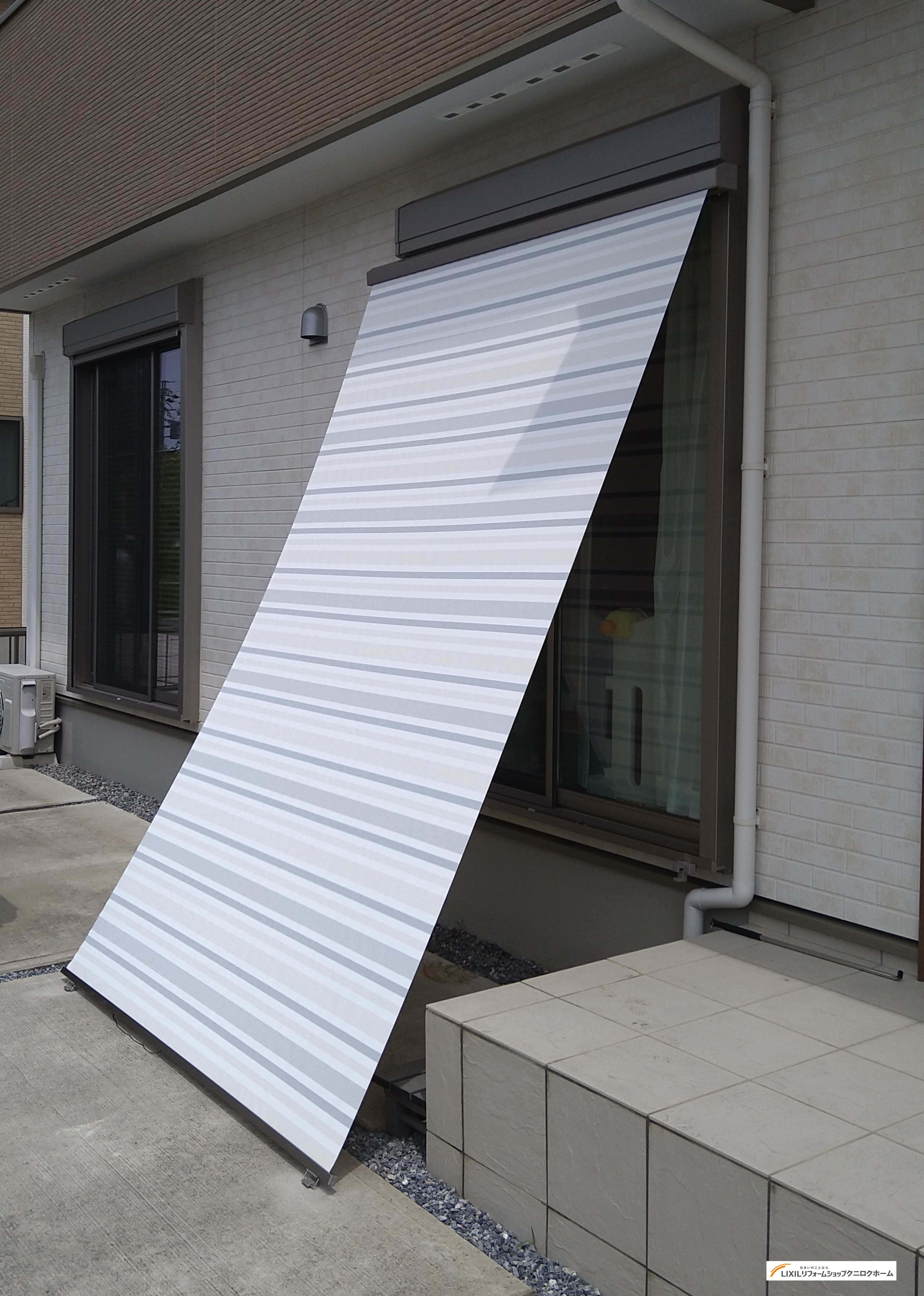 スタイルシェードを取付したいとのご相談をいただきました。LIXILのスタイルシェードは色や柄をお選びいただけます。その中で、お部屋が暗くならないよう明るめの生地をお選びいただきました。また、スタイルシェードが垂直になるパターンと斜めになるパターンをいつでもご選択できるように、フックの位置を2ヵ所(サッシ枠・土間)設置しました。お好みで使い分けをしていただけます。暑い夏がやってくる前に取付けを完了することができ、お施主様も大変お喜びいただけました。