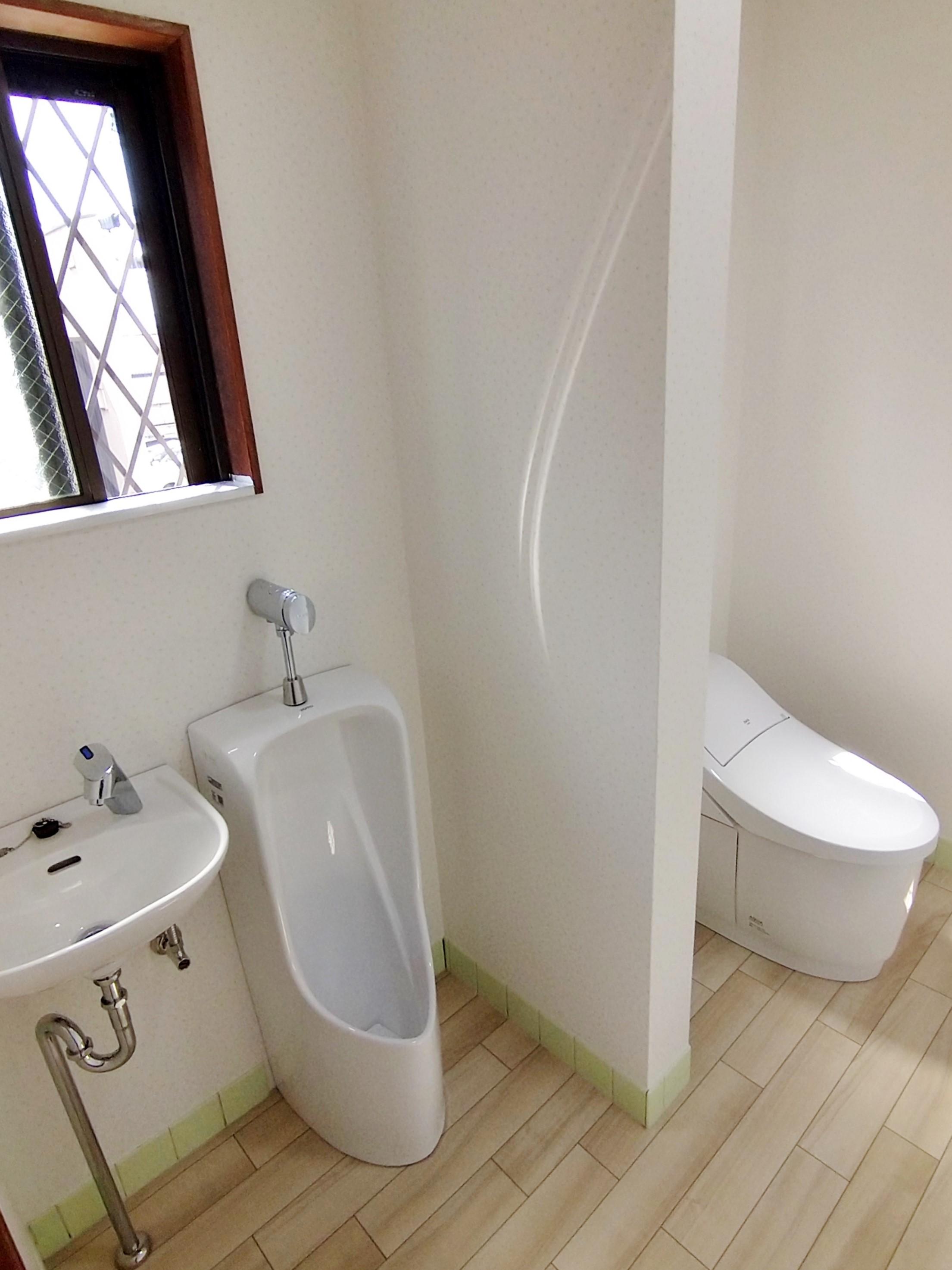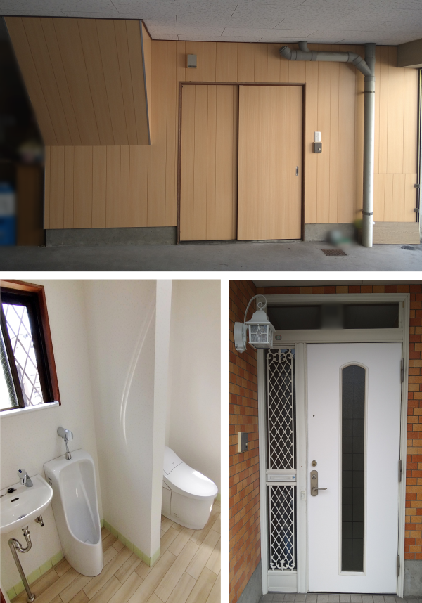 トイレ、トイレ手洗いの老朽化の為、交換のご相談をいただきました。交換後のトイレ本体、手洗いはスッキリとしたデザインで足元スッキリ。床のタイルからクッションフロアへ交換した為、ひんやり感が軽減し、壁のクロスを張り替え後、トイレ空間がトーンアップしました。さらに追加で、玄関ドアの補修工事、ビルトインガレージの壁の補修工事のご依頼をいただきました。汚れと錆が気になった既設の玄関扉の表面に防水性の高い化粧フィルムを貼り、ポーチ灯(照明)も交換しました。ビルトインガレージは、既設の壁を補修しながらその上に新しく壁を張りました。それぞれのリフォーム箇所が美しく生まれ変わった姿にお施主様もご満足いただけました。