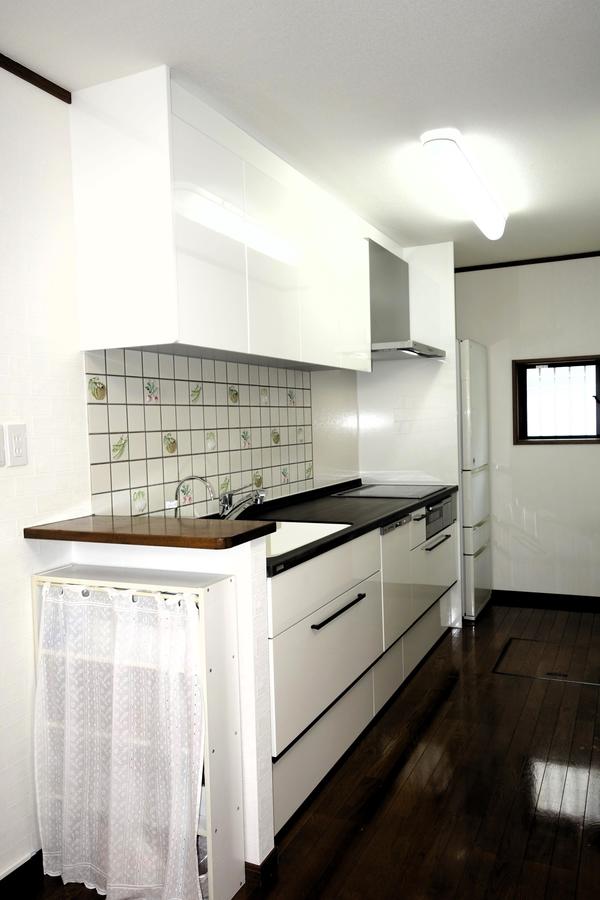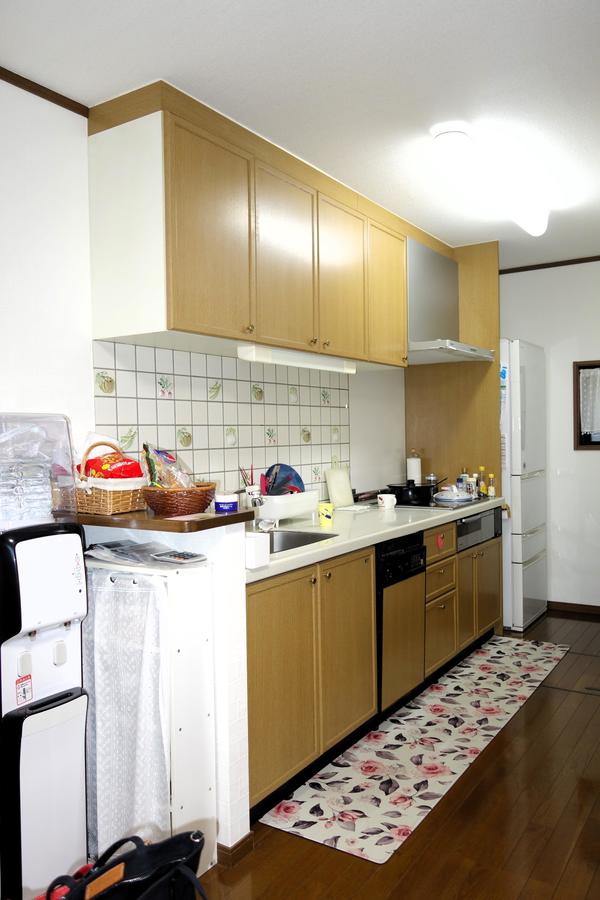昔流行したことのあるコの字型のカップボードをお使いでした。両面から使えるカウンターは、間の壁がない為、物を乗せすぎてしまうと反対側へ落下する危険性があります。