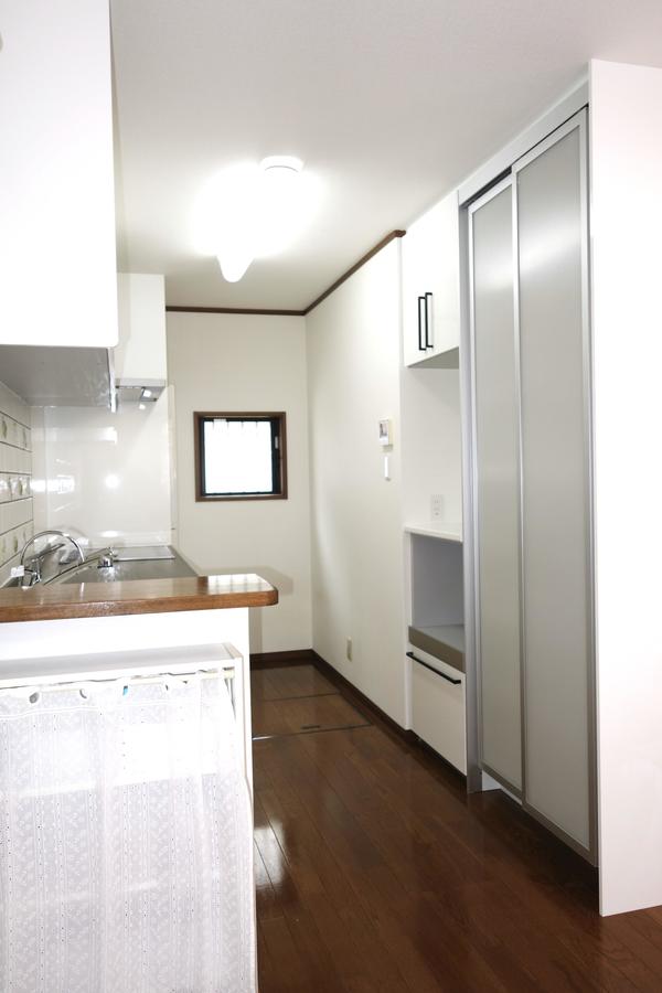 カップボードについてはキッチン側からの利用しかできませんが、壁面取付型をご提案させて頂きました。また、話の流れでキッチンも交換する運びとなりました。しかし、お客様が良いとされるキッチンがなかなか見つからくて、最終的にキッチンは、トクラス製品のBbシリーズ、カップボードはトクラスの家電ストッカーとクリナップの引き戸ストッカーを組み合わせて設置することになりました。