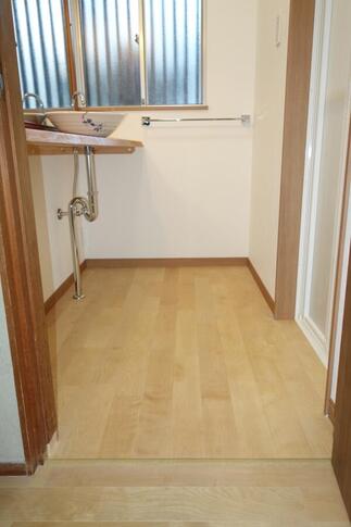 脱衣室→廊下との段差を解消してバリアフリー化、床材にはカバザクラを使用しました。