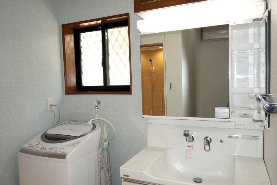 洗面化粧台や洗濯機パンの取替もあり、同時に脱衣室のクロスとクッションフロアの貼替も行いました。