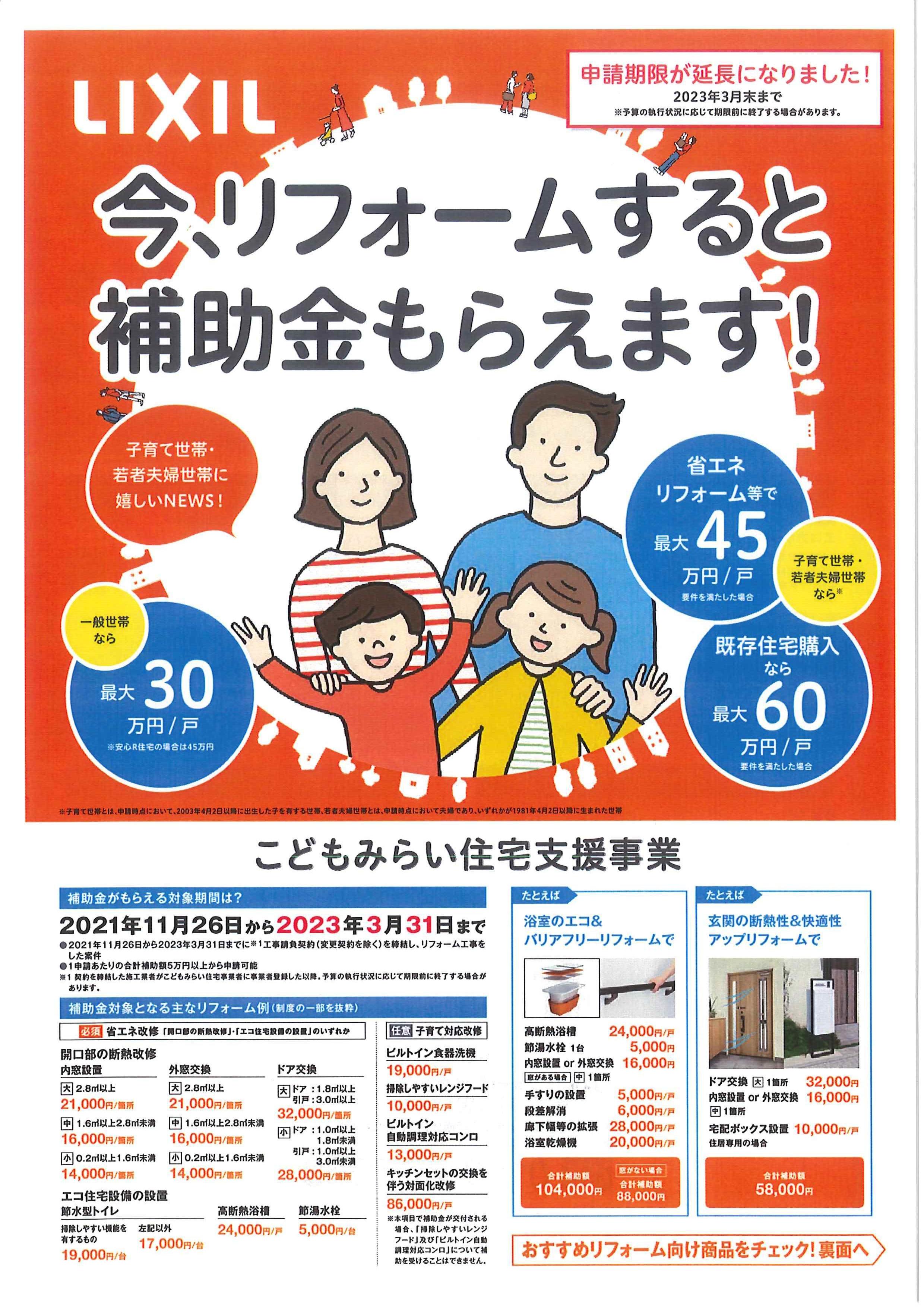 こどもみらい住宅支援事業とは、リフォームに関して1戸あたり最大30万円の補助金が支払われます。
