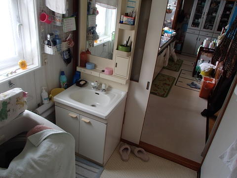 椅子に座って洗髪できる洗面台を、とのご要望でした。配管が通っていたため、既製品ではなく造作しました。収納はステンパイプで確保しています。