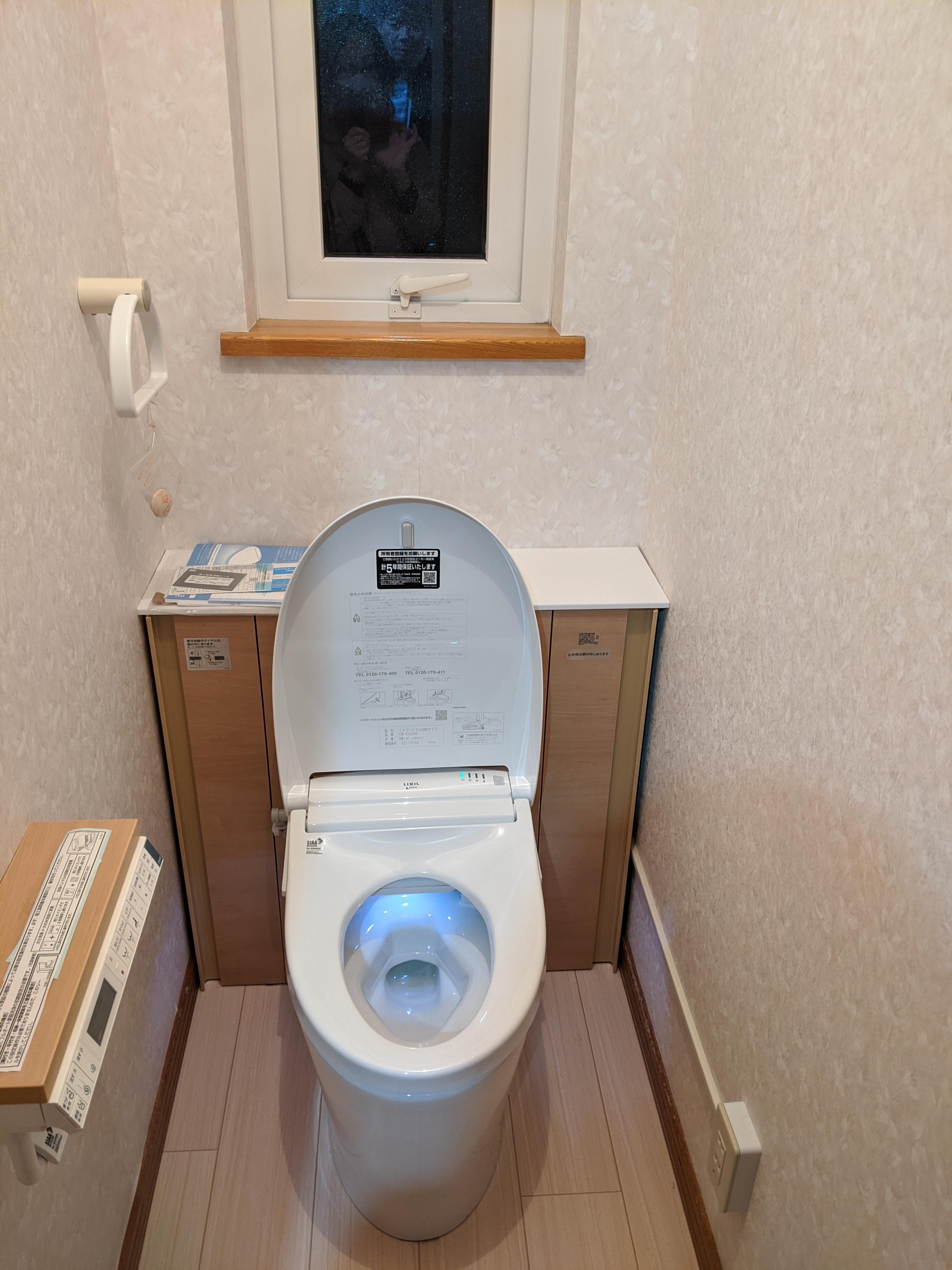 後ろの収納は間口に合わせてぴったり納まります。 お掃除道具やトイレットも入るので、すっきりした空間に変わりました。 実はこのトイレ、汚れが付きにくいアクアセラミックや便座と便器の間をお掃除できるリフトアップ機能など お手入れがしやすいトイレとなっています。 ご興味のある方は、弊社までお問合せください!