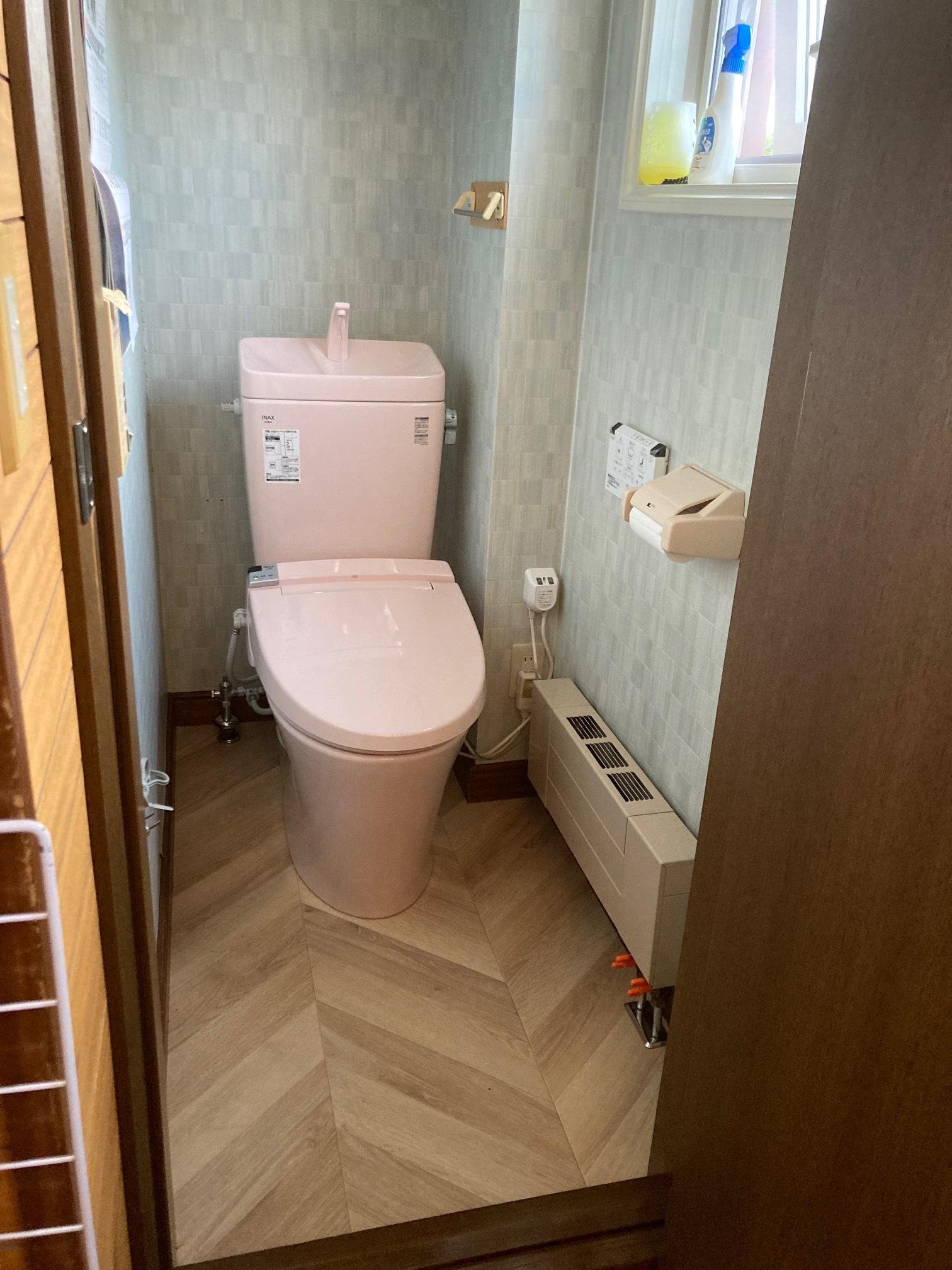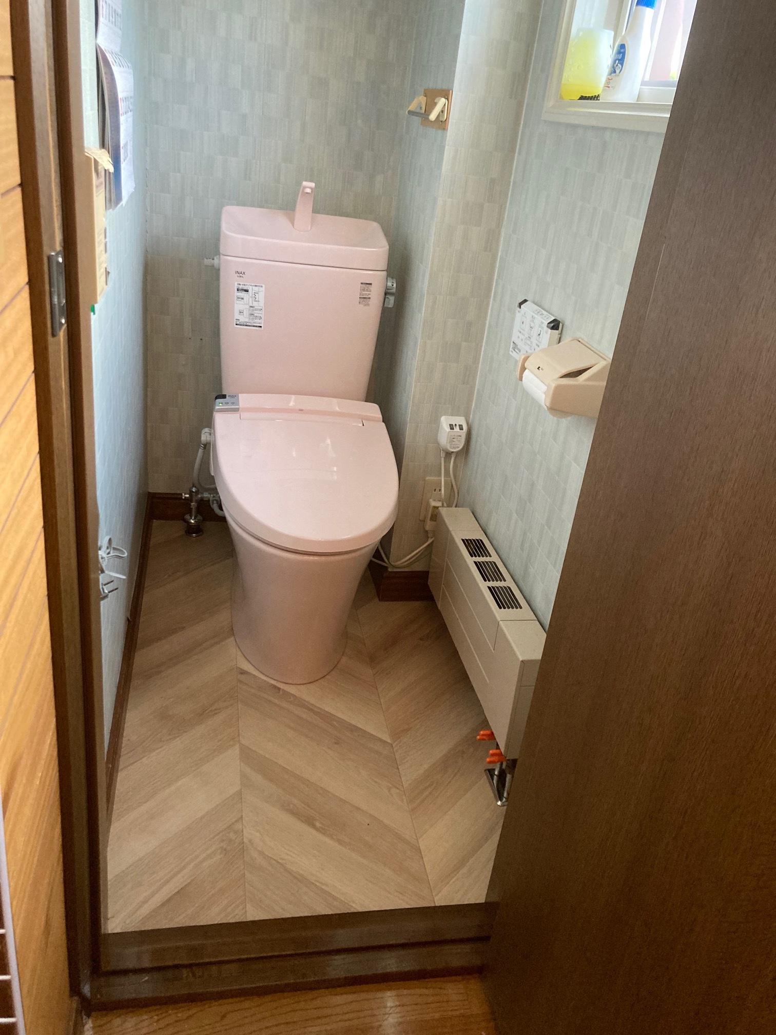 今回のリフォームは以前もお世話になりましたOBのお客様の工事です。 トイレの床の貼替えと便器の交換をさせていただきました。 お色はピンクがお好みとのことで、床の色もトイレの色にあわせてお選びいただきました。 とても素敵な空間に仕上がりました!