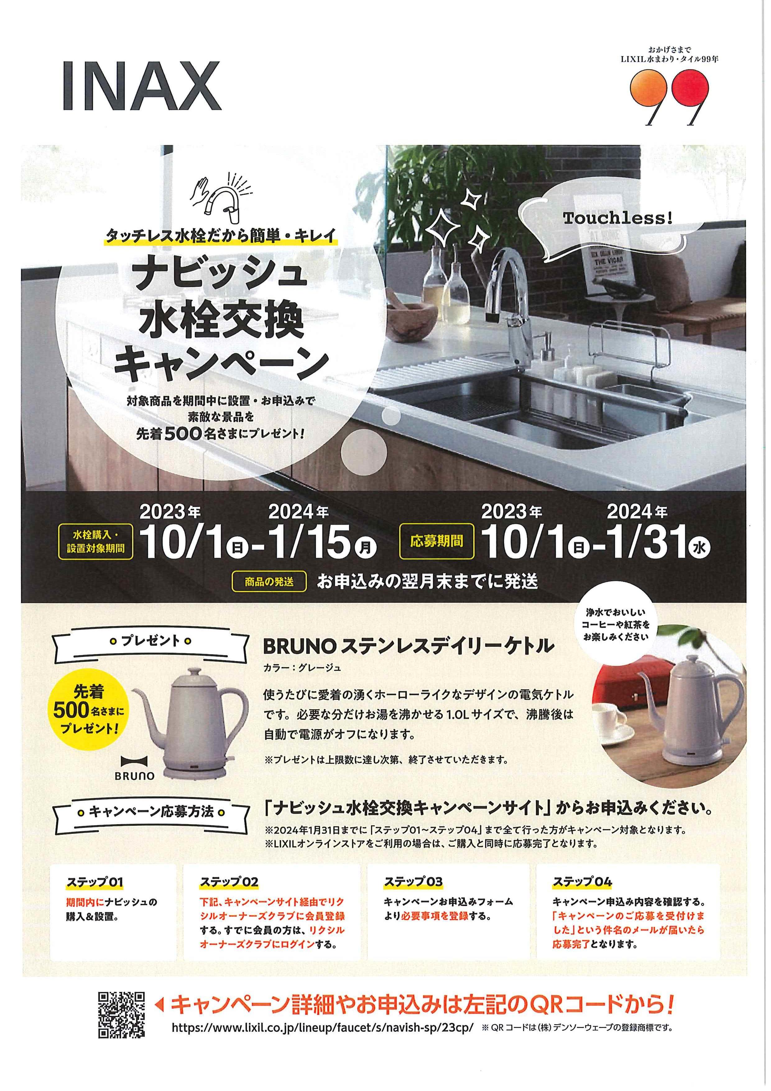 期間中対象商品の水栓を交換していただいたお客様にはステンレスケトルをプレゼント!