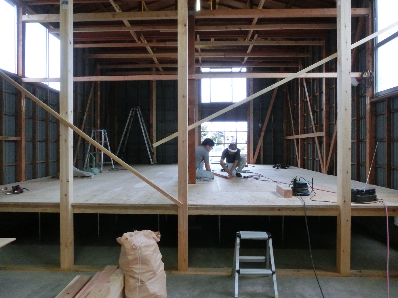 床組み(大引)を45cm間隔にいれ、その間にウレタン断熱材65mmを敷き詰めました。床下地は28mmの構造用合板です。横揺れつよい剛床仕様としました。