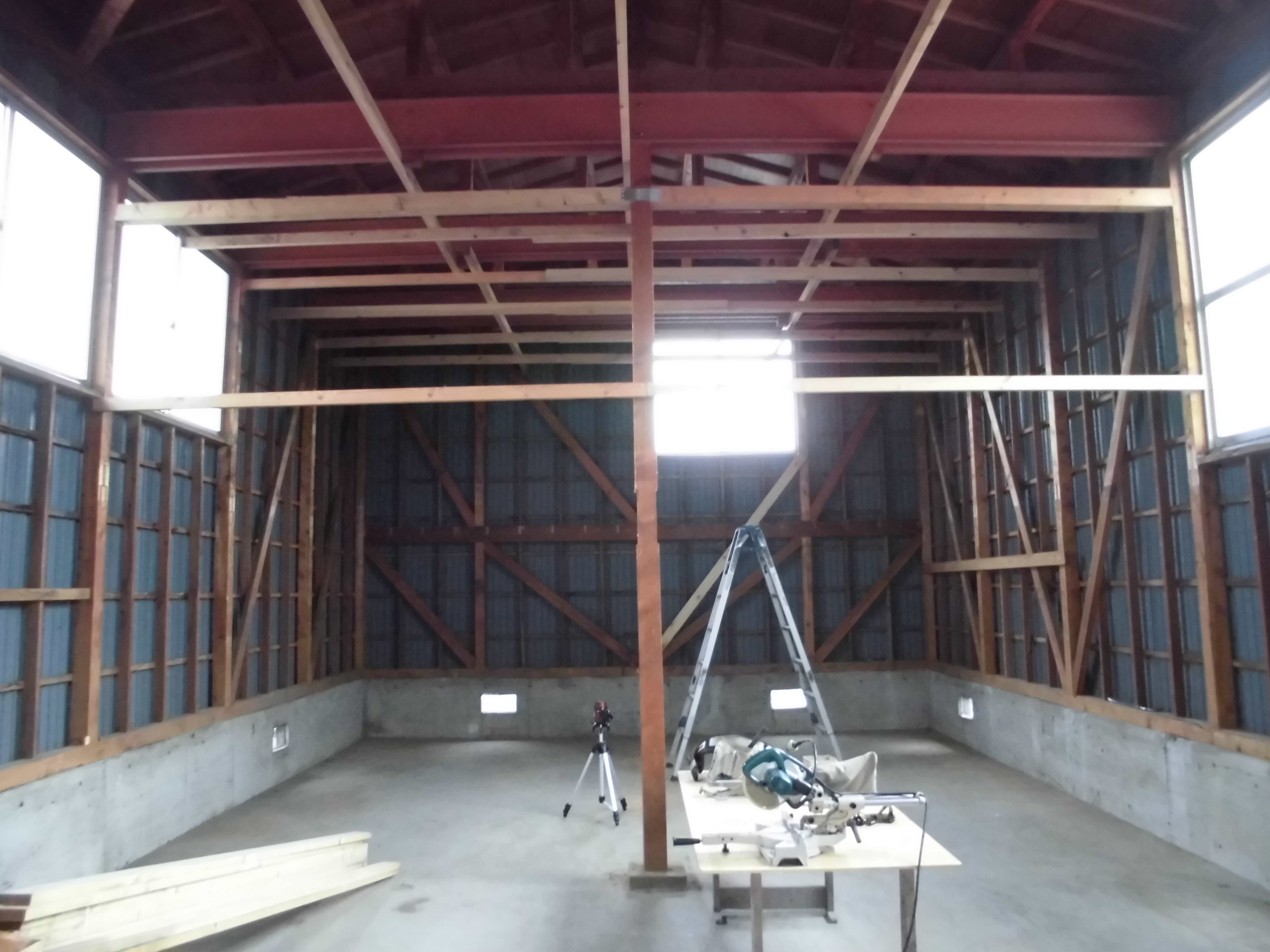 資材を運び出し、いよいよ工事開始です。すでに外されたあとですが、建物の奥は2階(2層)建てになっていました。梁掛りなど構造を検討し、必要箇所に補強を施します。