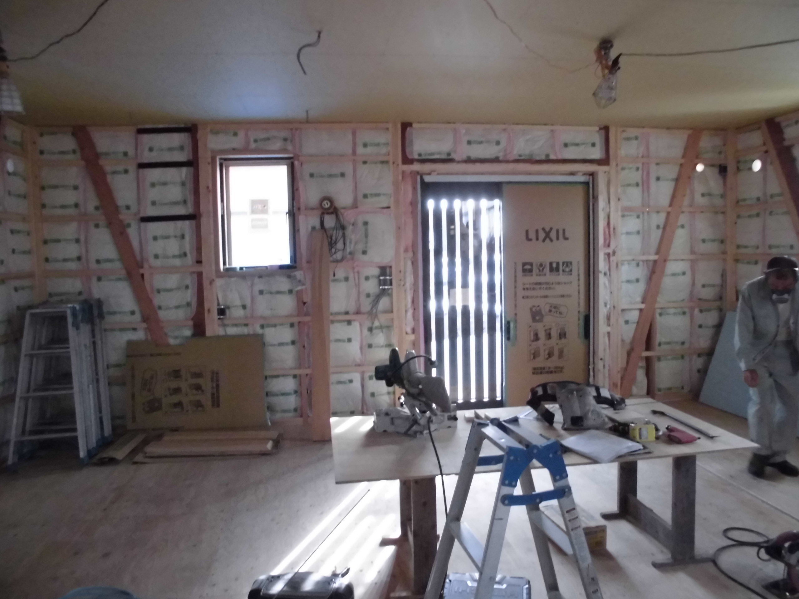 耐震バランスを検討し、筋かい・N値金物を取り付けます。壁・天井に断熱材を充填。大工工事が進行していきます。