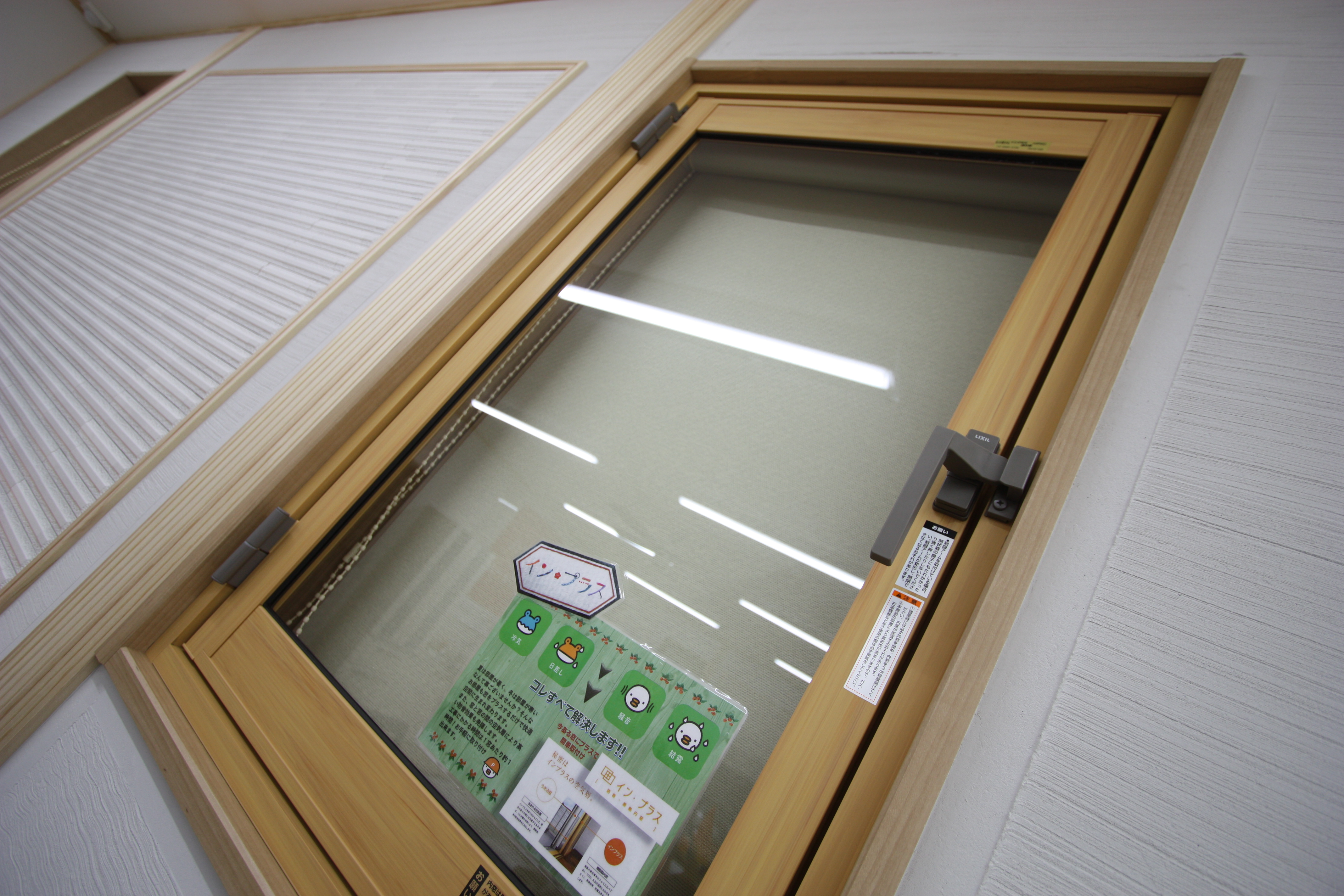 インプラスは内窓です。夏は部屋が暑く、冬は部屋が寒いなんて事ございませんか?そんなお部屋も窓をプラスするだけで快適な空間に生まれ変わります。また、窓と窓の間の空気層により、高い防音効果も発揮します。工事にかかる時間は1窓あたり約1時間!お手軽に取り付け出来ます。