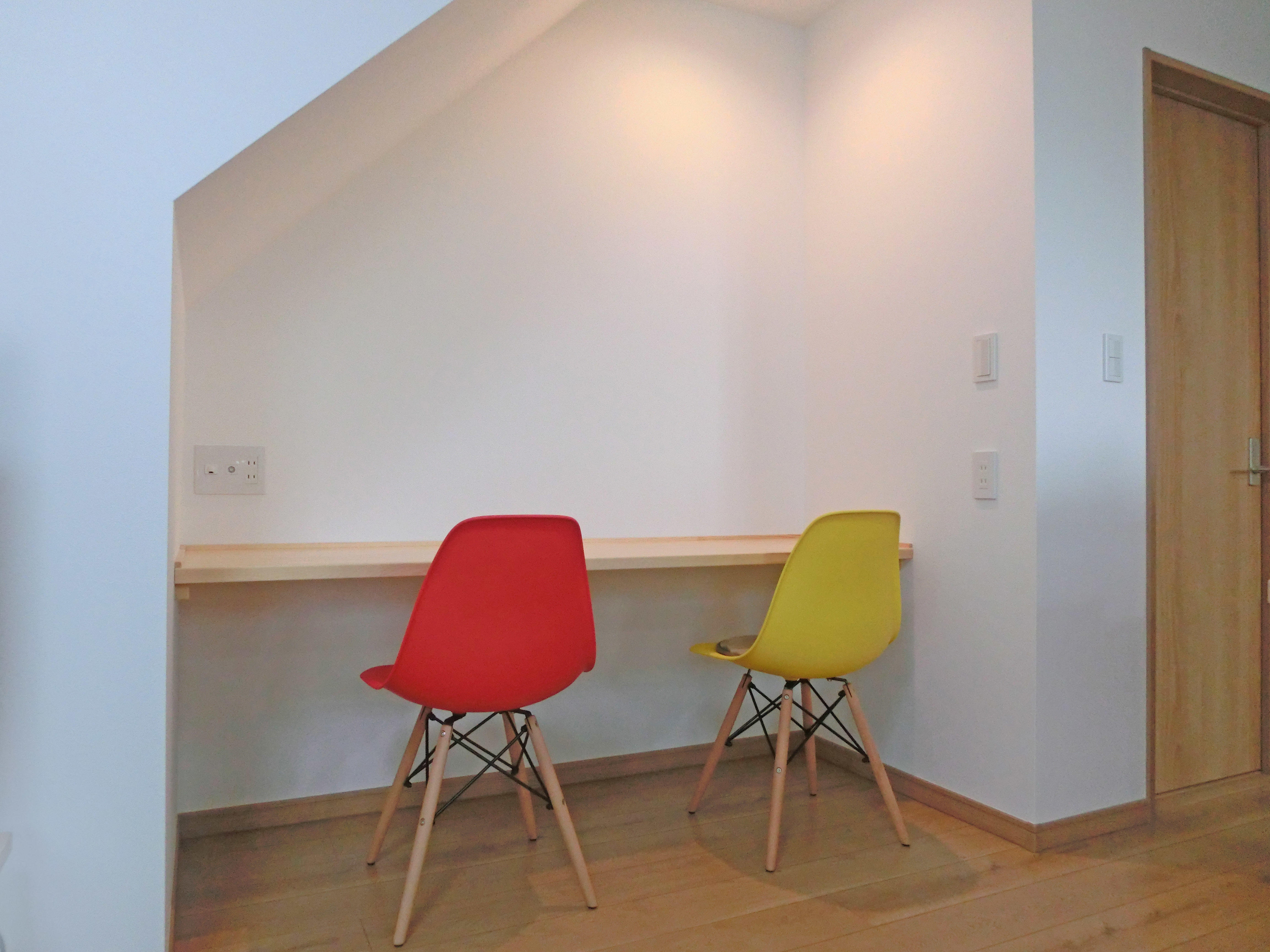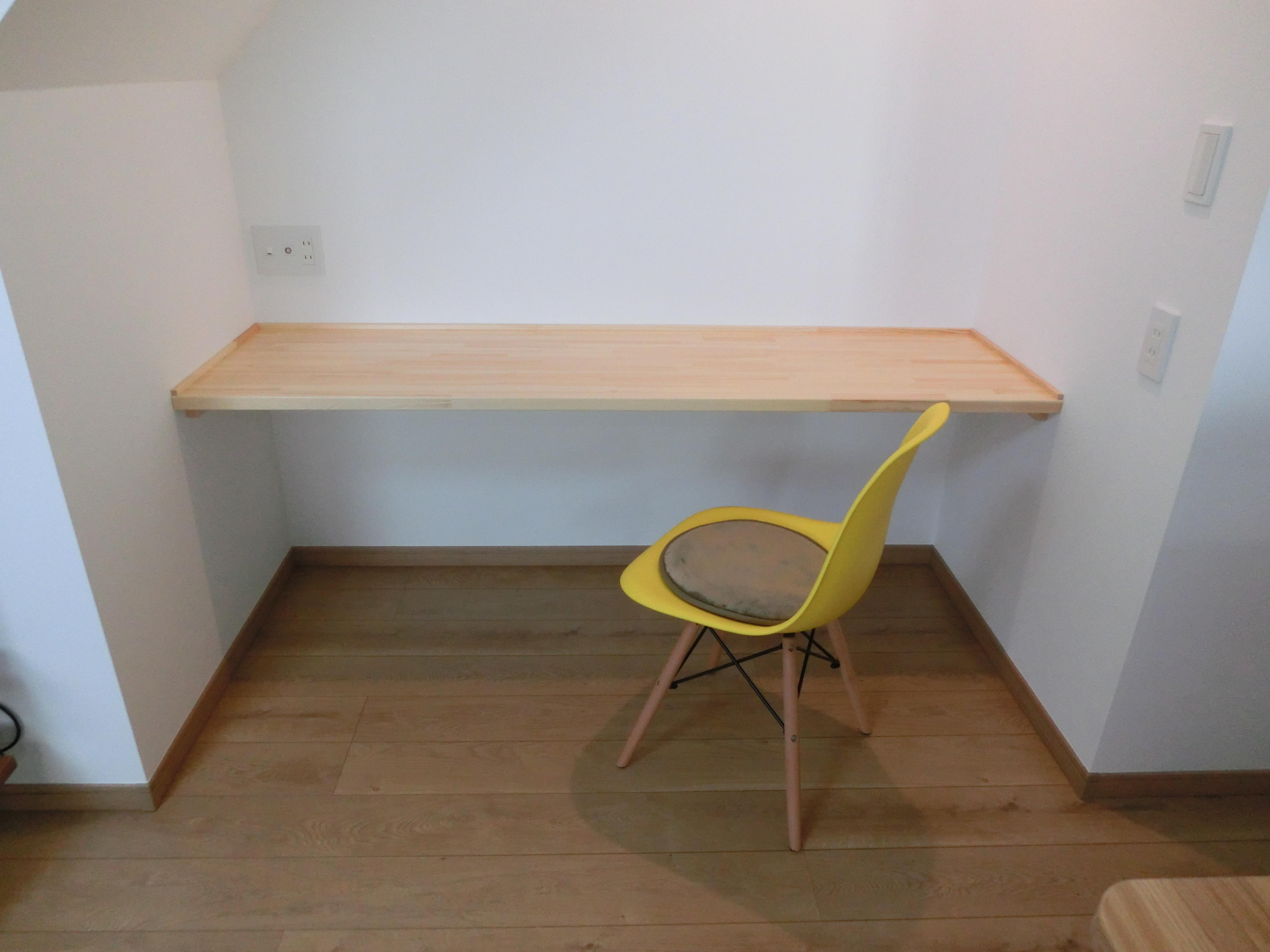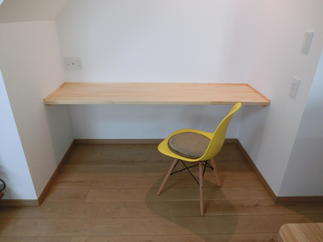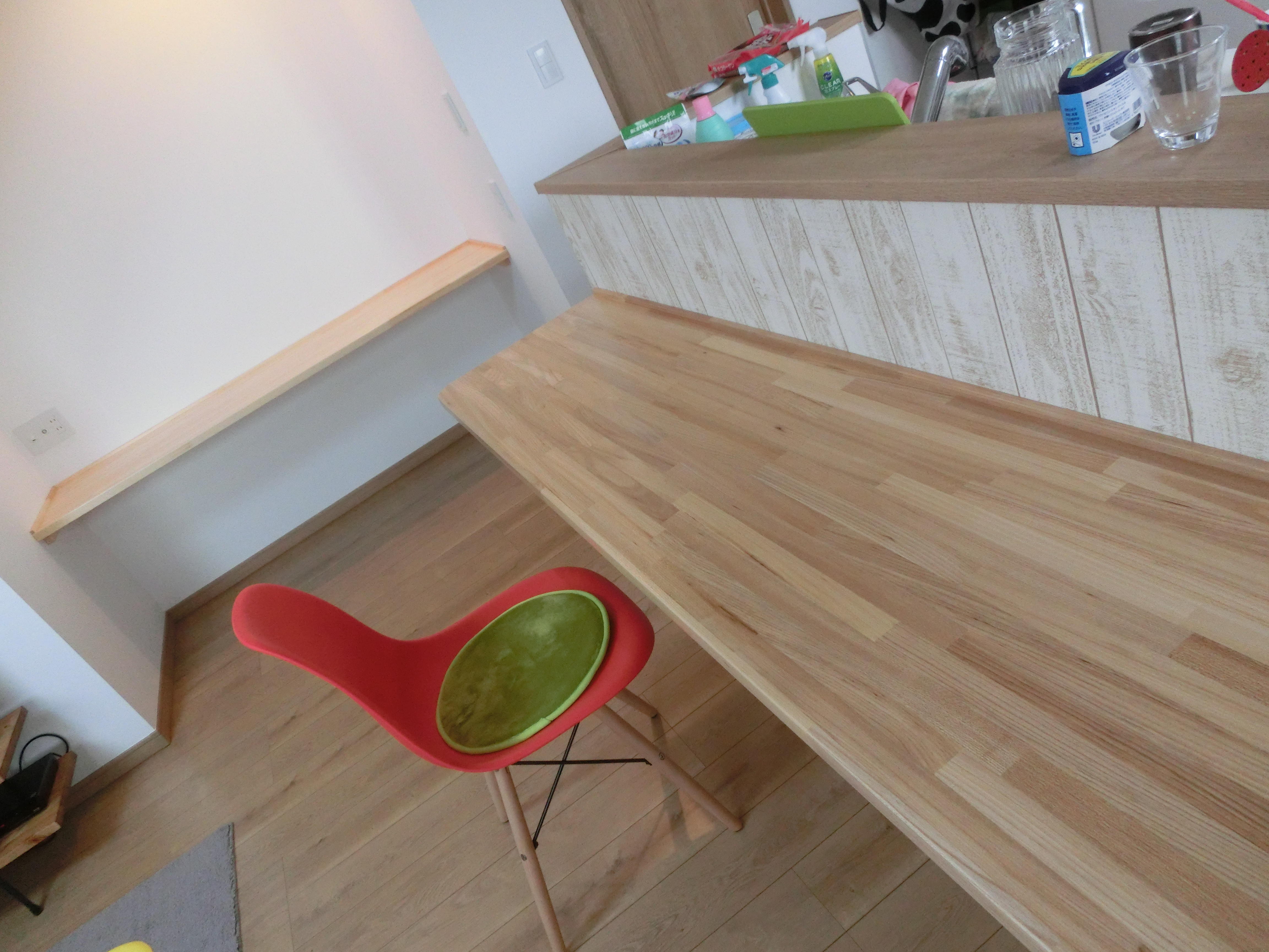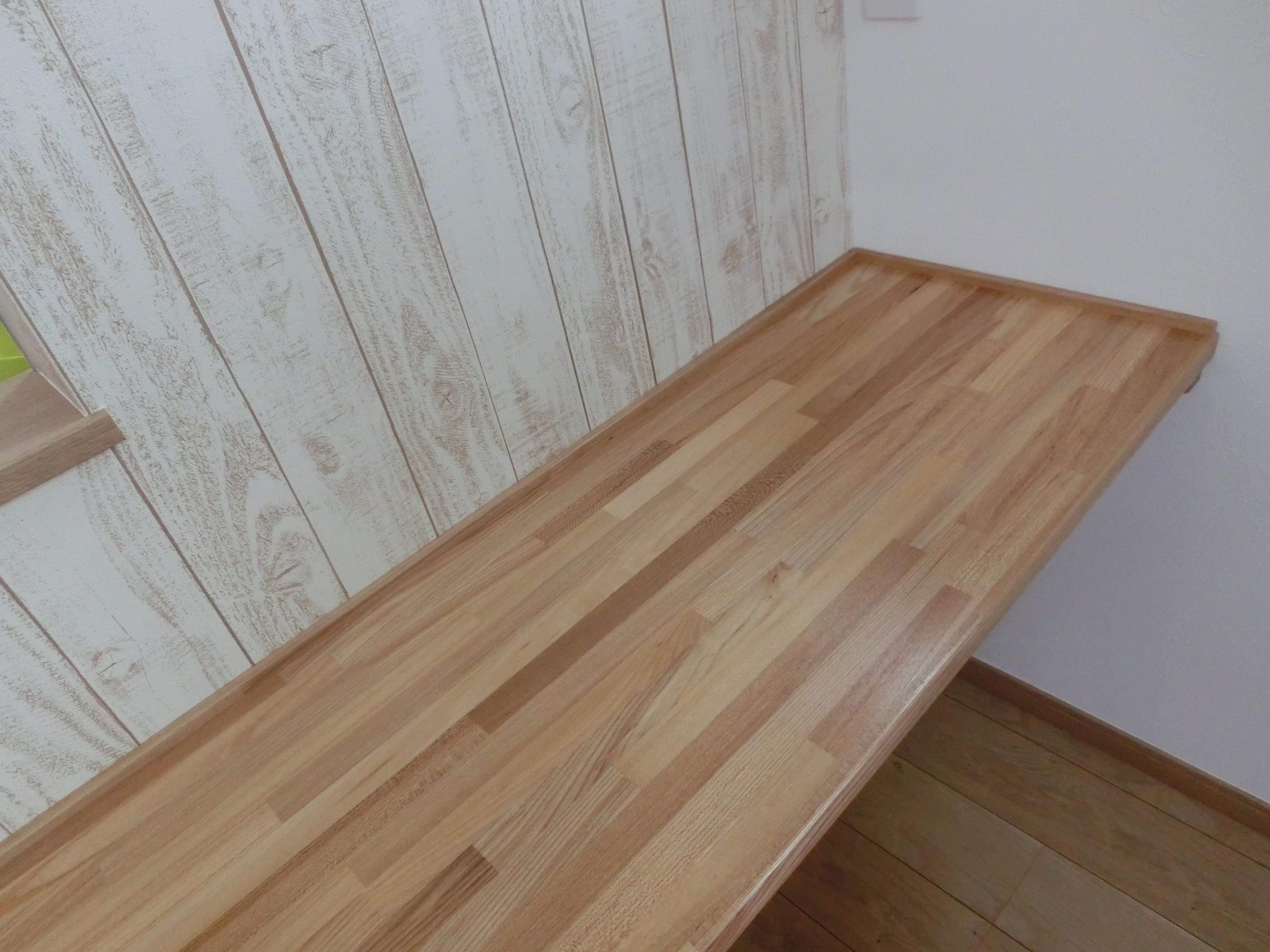 キッチンカウンター、スタディーコーナーを設置しました。タモ・赤松の木目がきれいです。