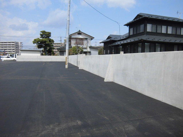 大型駐車場のアスファルト舗装、経年劣化した塀(擁壁)をリニューアル工事させていただきました。