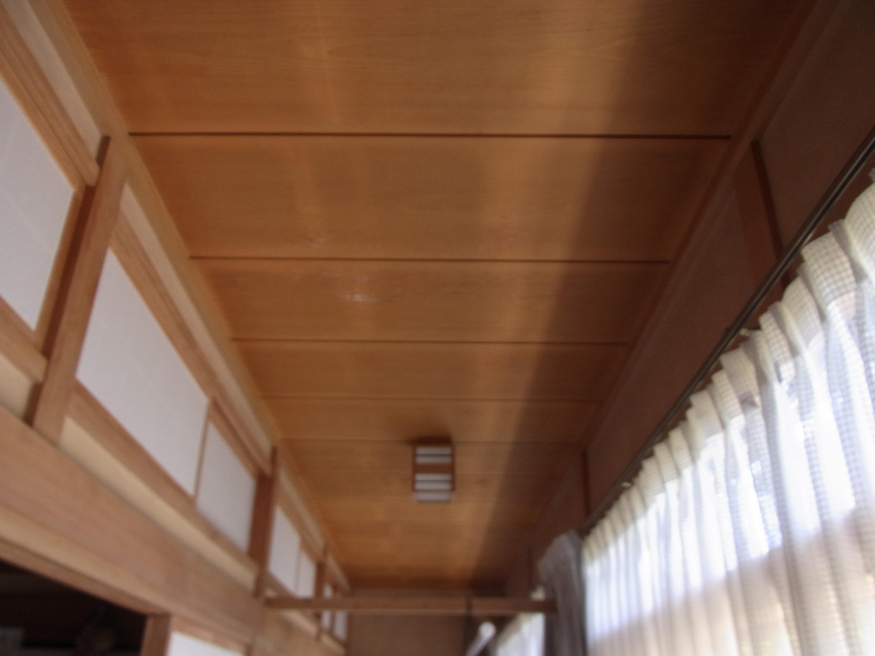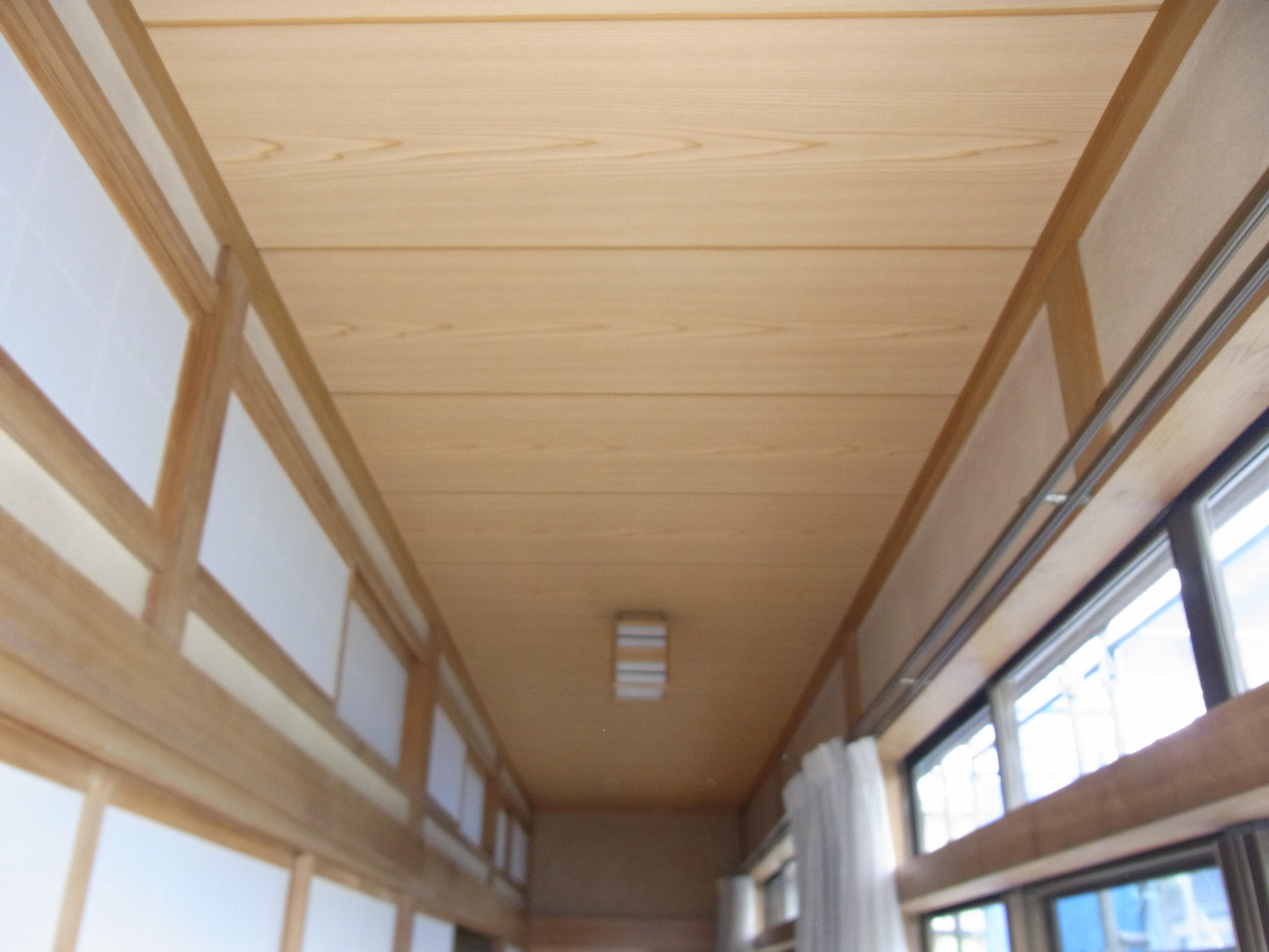 築35年、広縁の天井が劣化が気になるようになったとの事(日焼けや結露)。屋根部分や天井裏の雨漏りがないかなど調査を行い、天井下地の組なおし、断熱材を施工し仕上げました。