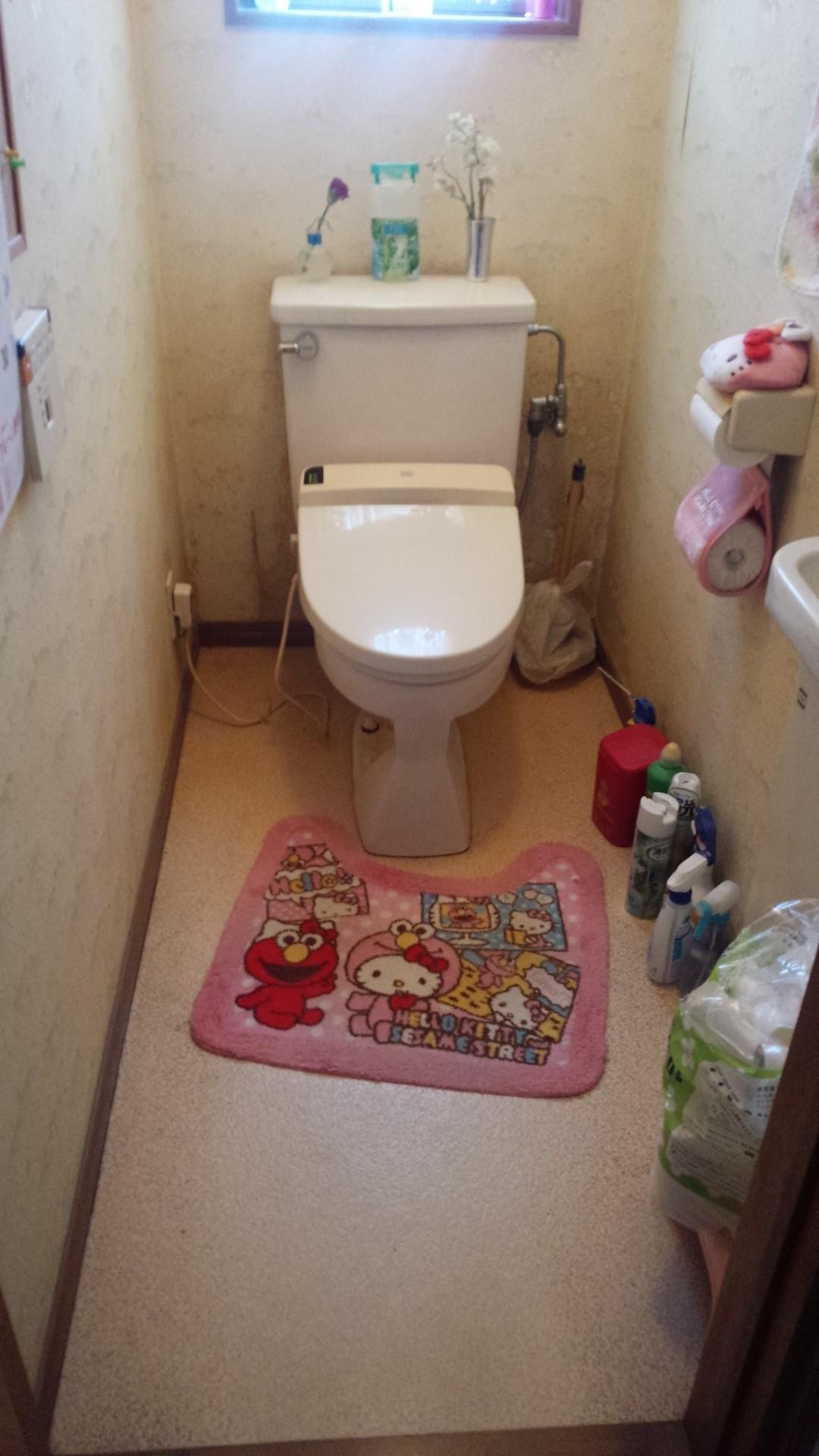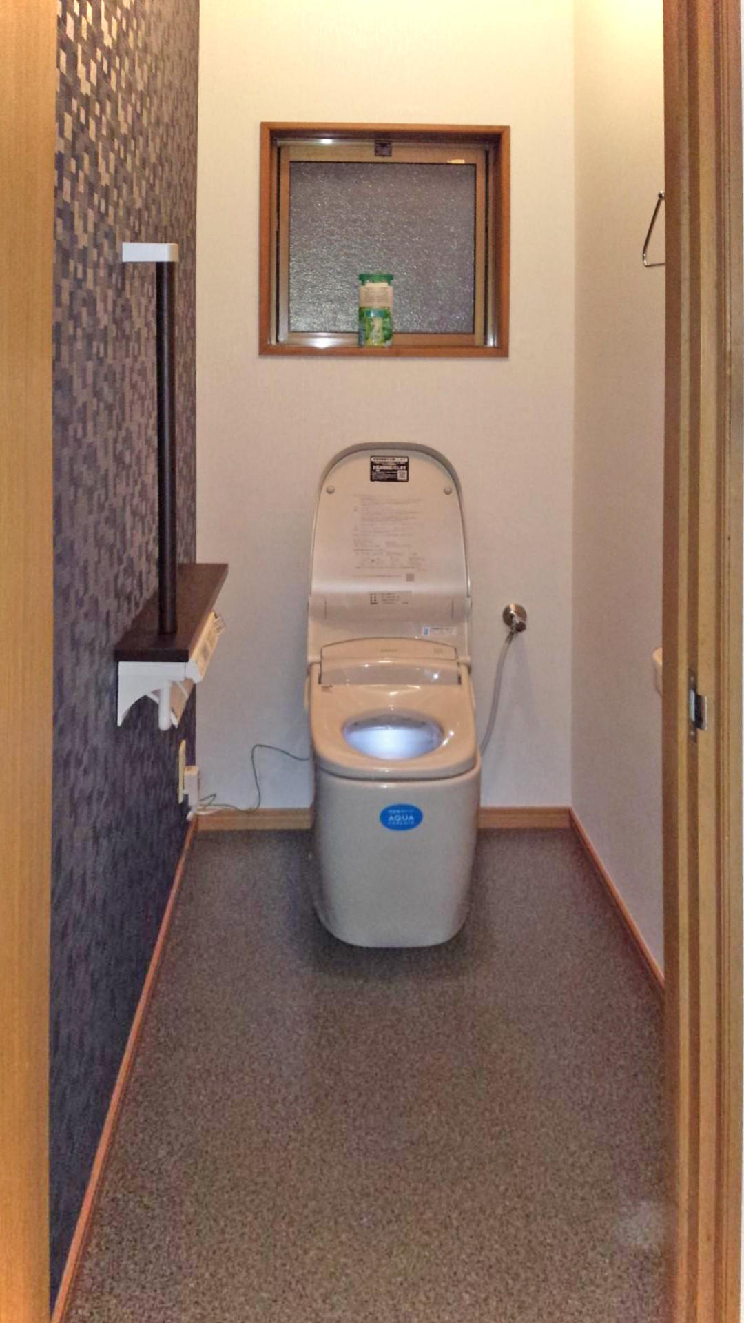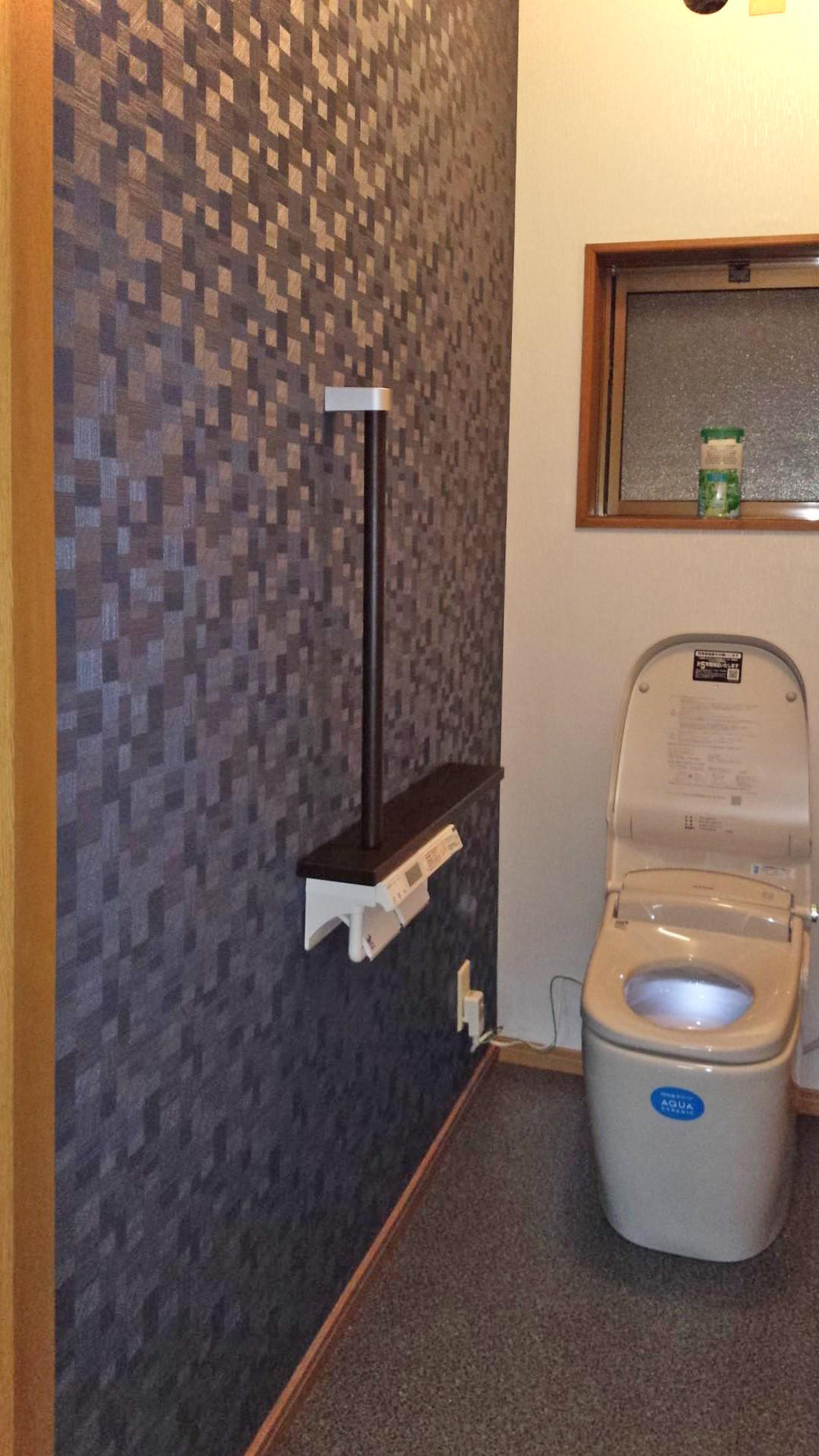 長年使ったトイレをタンクレストイレにし、手摺を設けました。壁紙も1箇所アクセントカラーにして部屋の雰囲気もガラッと変わりました。