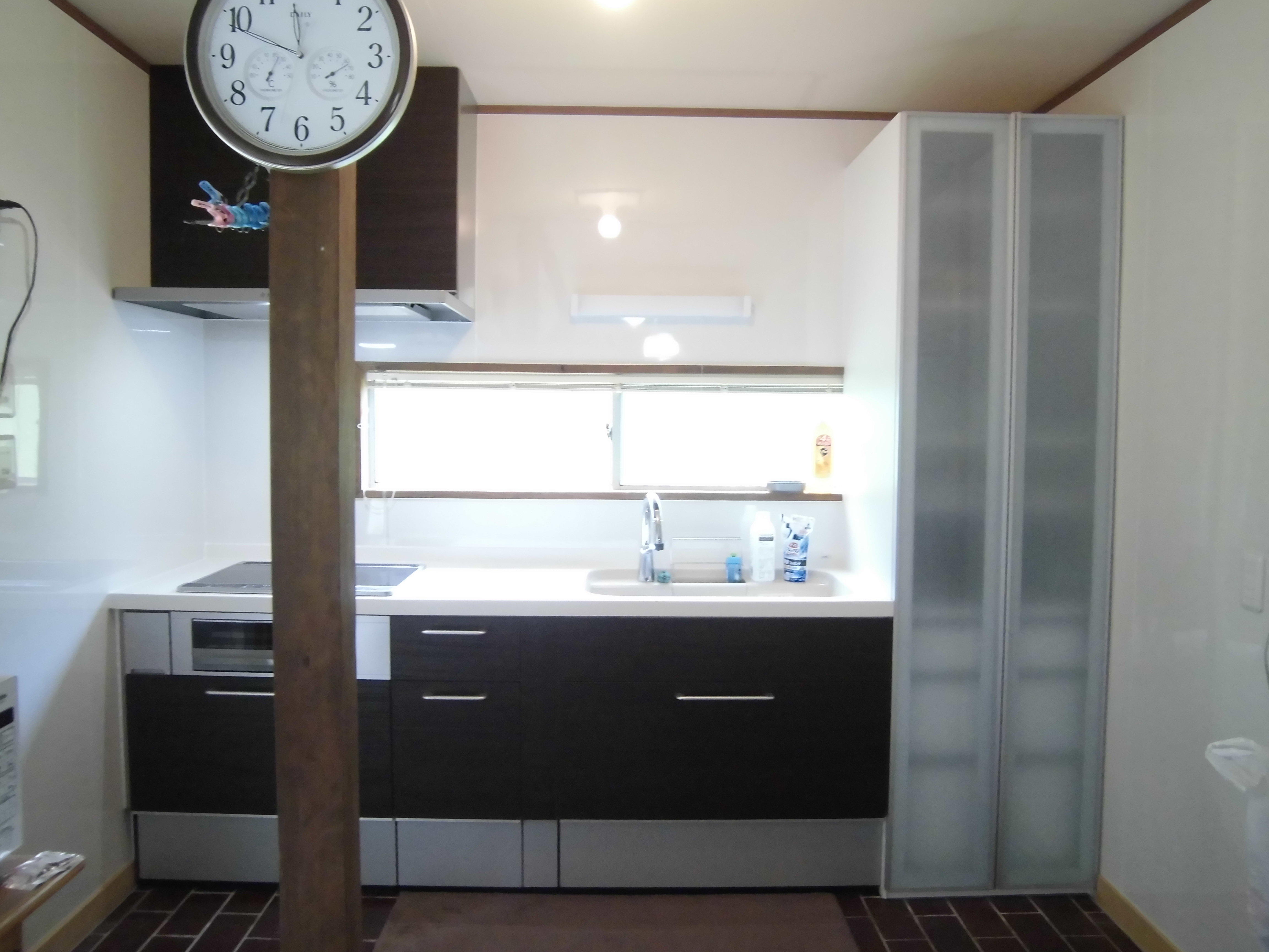 L型のセパレートキッチンをI型システムキッチンに取替えました。機能を上げて作業スペースを確保しました。