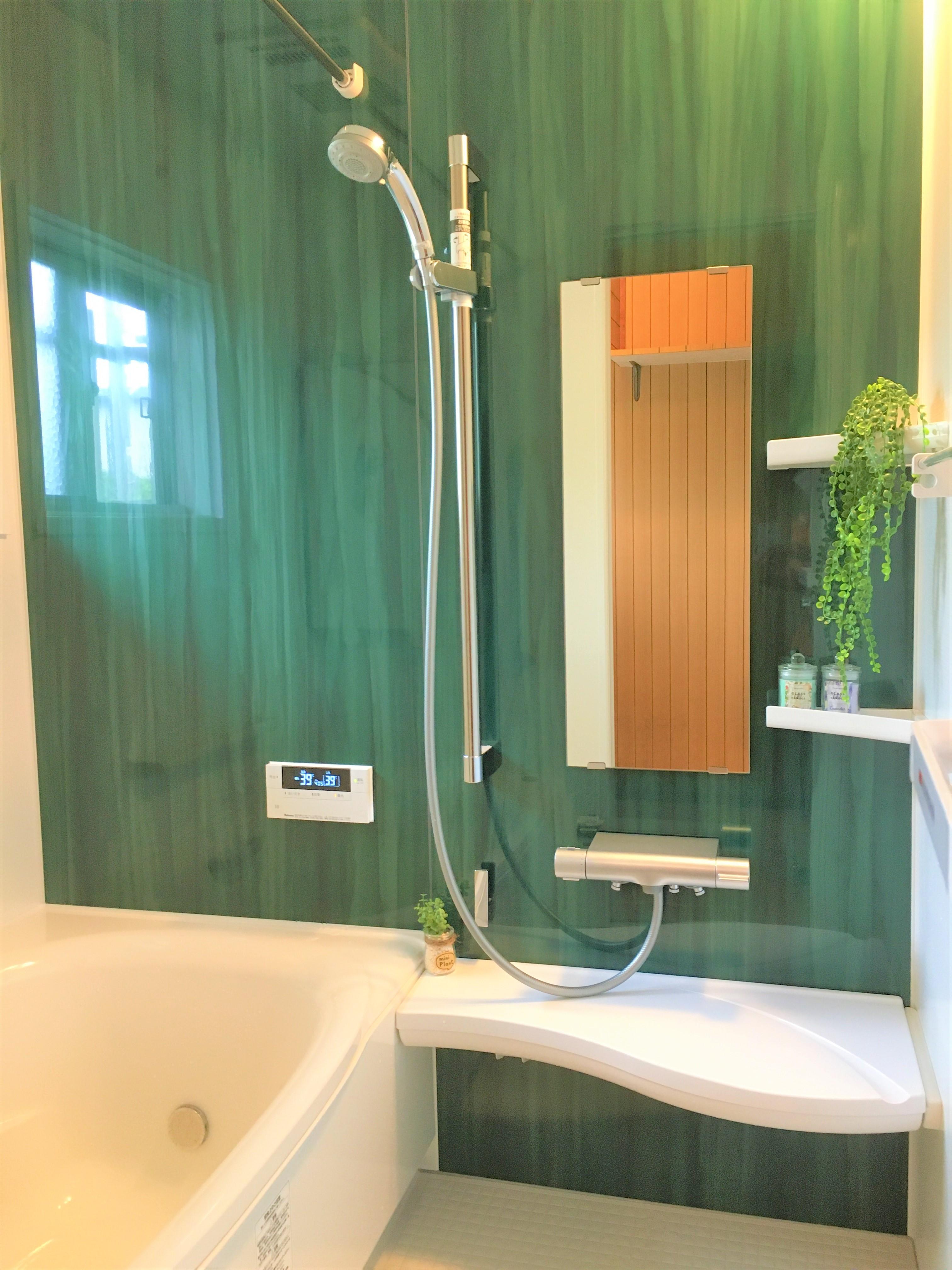 タイル張りだった浴室は、LIXILのユニットバス『アライズ』になりました。冷ッとしていた床は、アライズの『キレイサーモフロア』になり、冬場でも冷たくなく、スポンジでもお掃除ラクラクです。壁パネルのカラーは『ボトルグリーン』色で、森の中にでもいるかのような、森林浴が味わえそうですね。